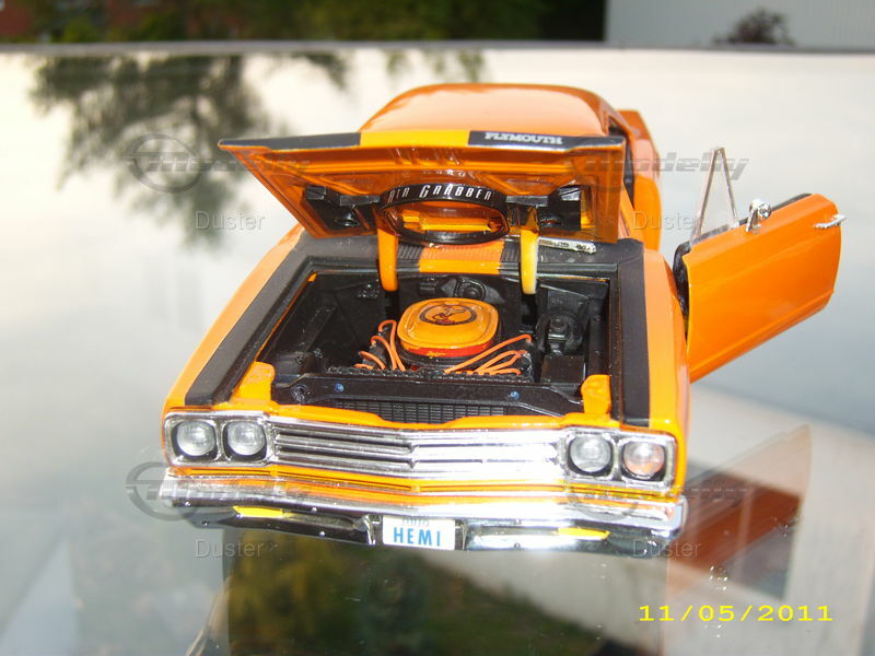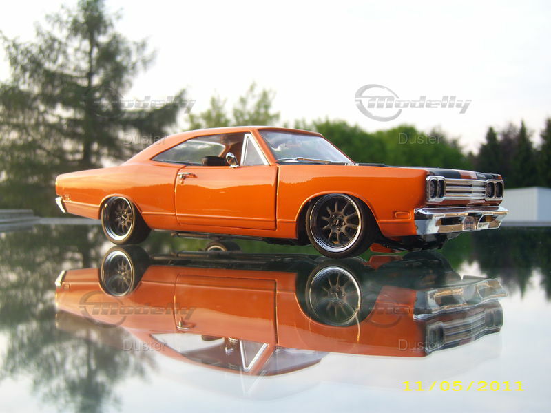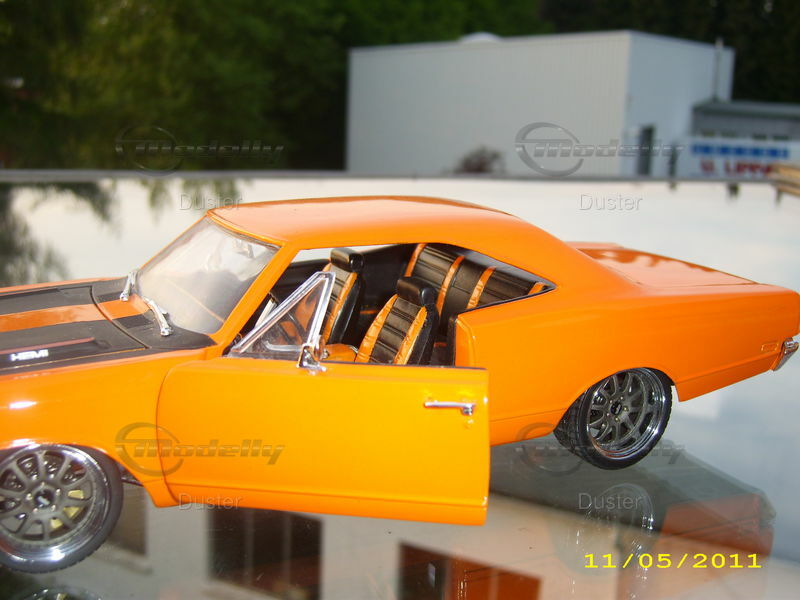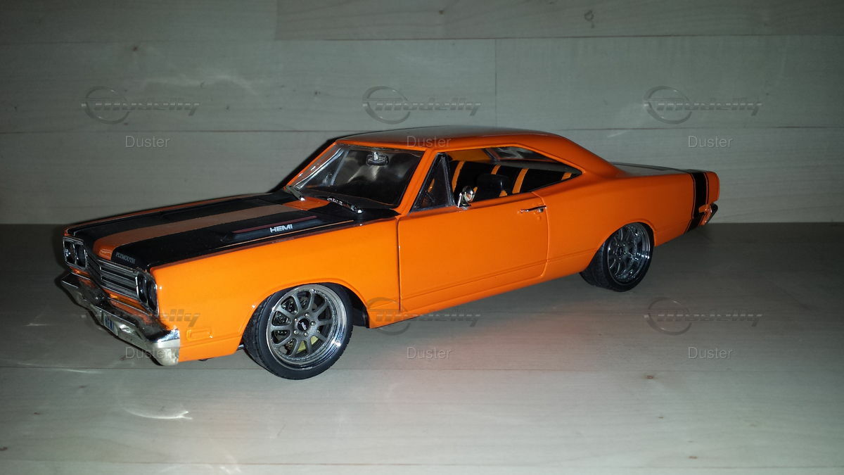 Unlike the production models, this modified Ertl model has undergone some unique modifications. Painted in a vibrant orange with a black stripe and the HEMI inscription on the hood, it perfectly captures the spirit of that era. Prominent details like the custom American Racing wheels and replicated interior elements make this model stand out. Please note that this is a modified miniature model and does not represent the original model produced by Ertl. Every detail, from the chrome bumpers to the precise contouring of the hood, has been carefully replicated, giving the model a remarkable authenticity that many collectors and enthusiasts will appreciate.