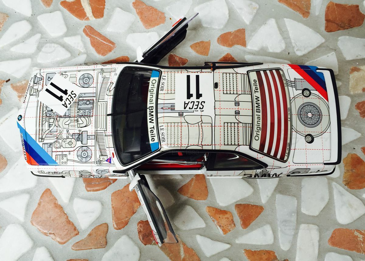 The model features a crisp color scheme that perfectly captures the beauty and design language of the original. The white base color is complemented by artistic line drawings and the striking BMW M logo on the hood. The racing decals on the sides and front of the vehicle are meticulously replicated, enhancing the racing character of the car. Models from the BMW Group are renowned for high detailing and collector's value, and this 1/18 scale model is no exception.