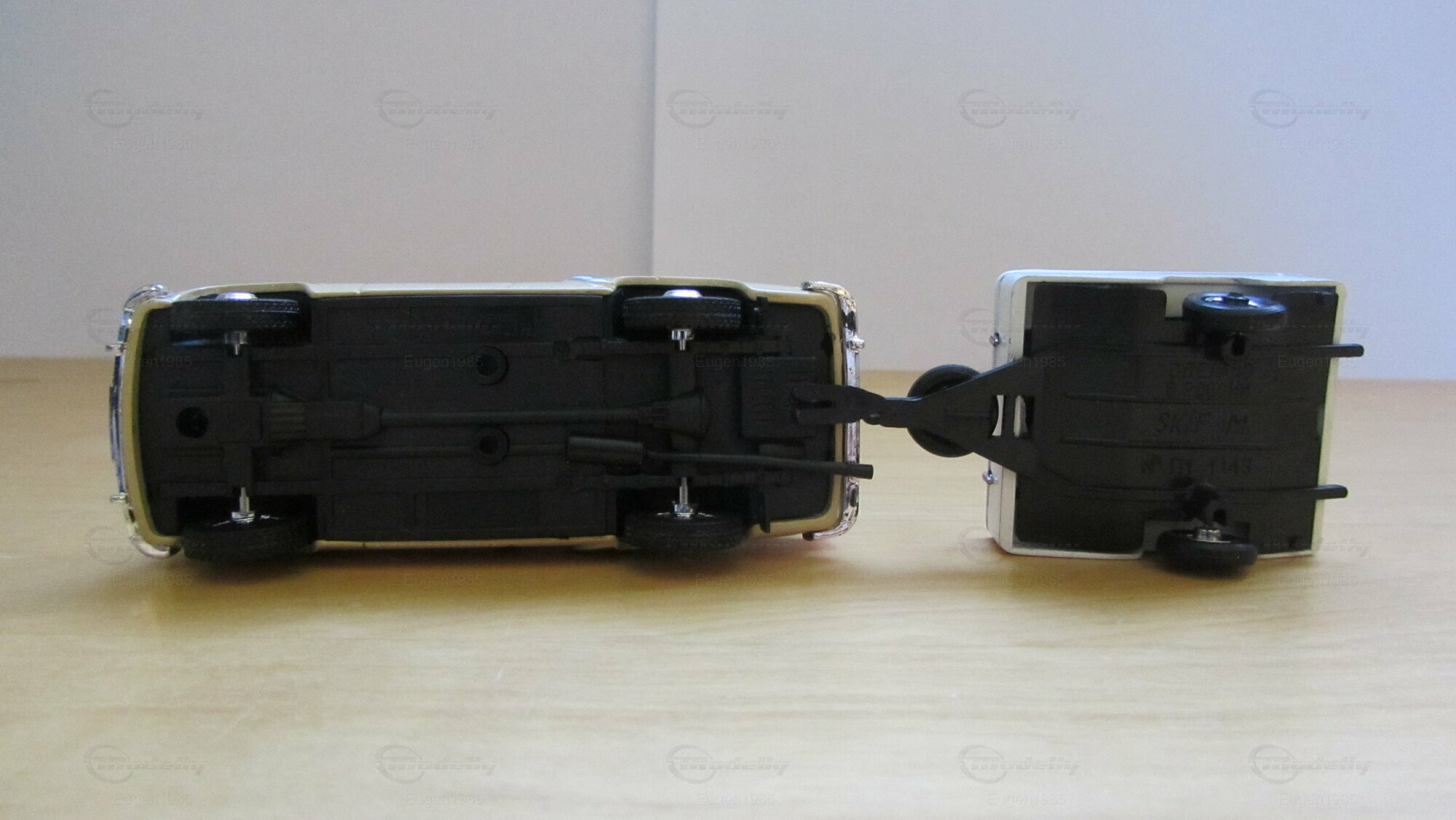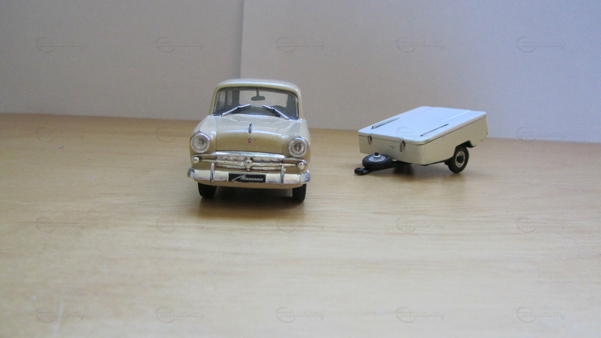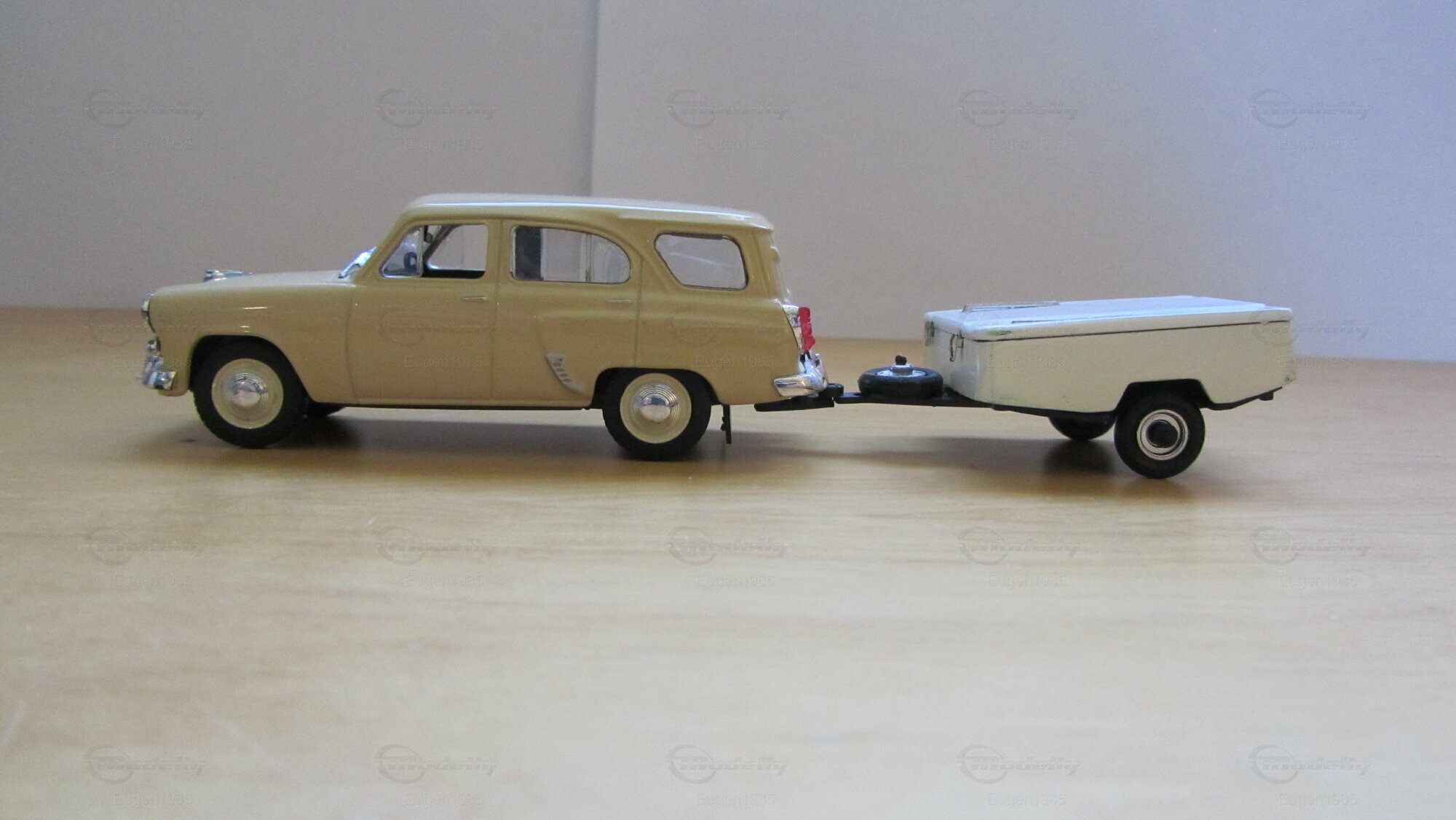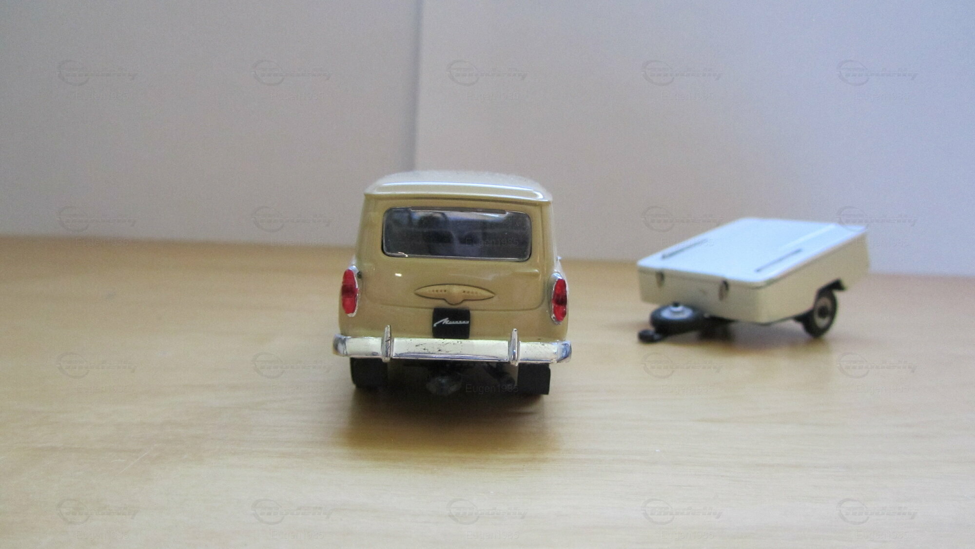 This is Moskvitch 423H with camping trailer in scale 1:43. The model is from the magazine collection from DeAgostini. Nothing opens.