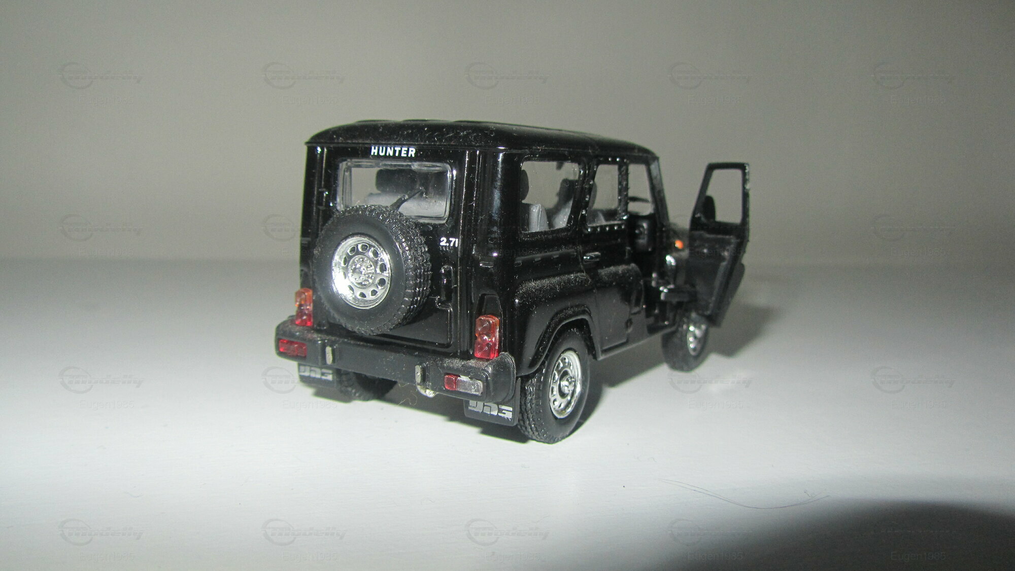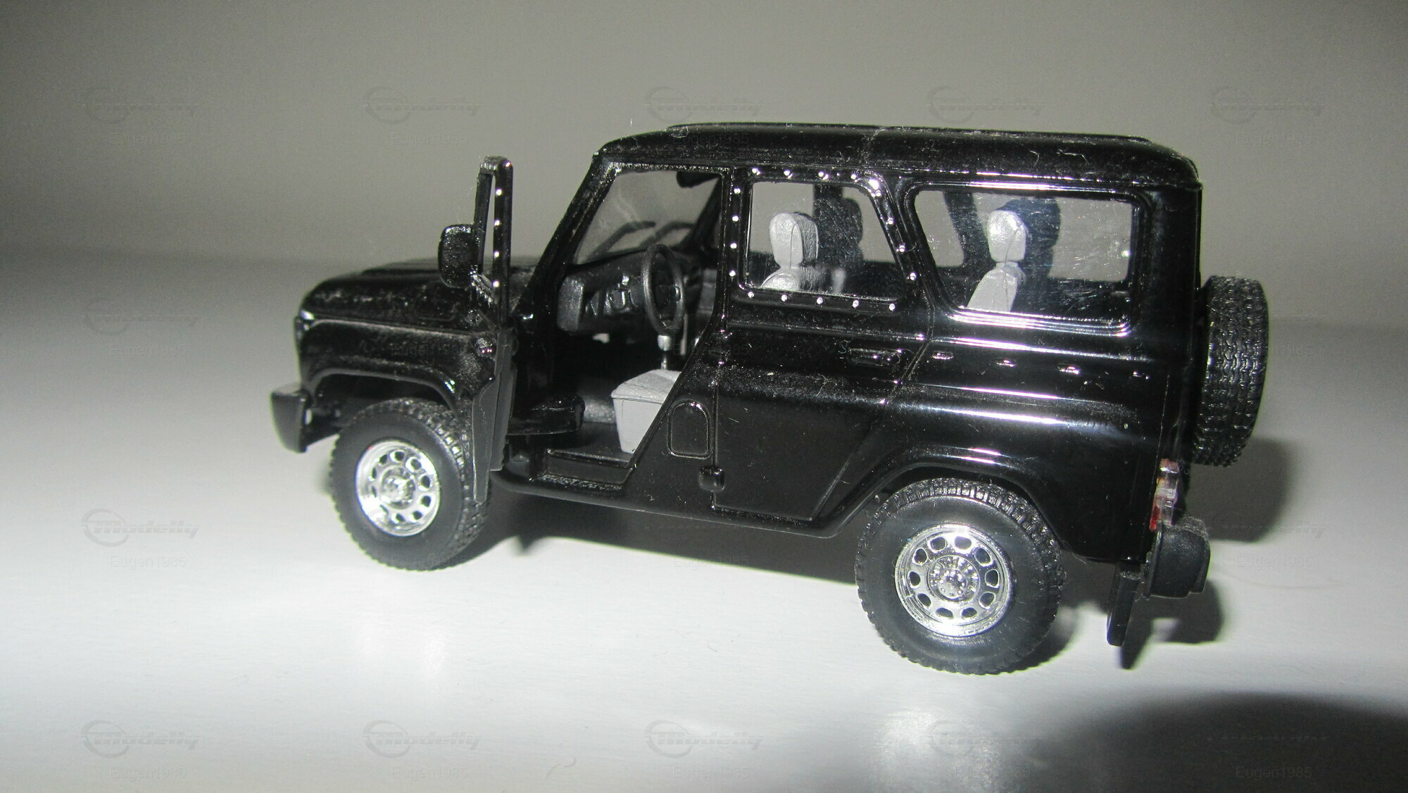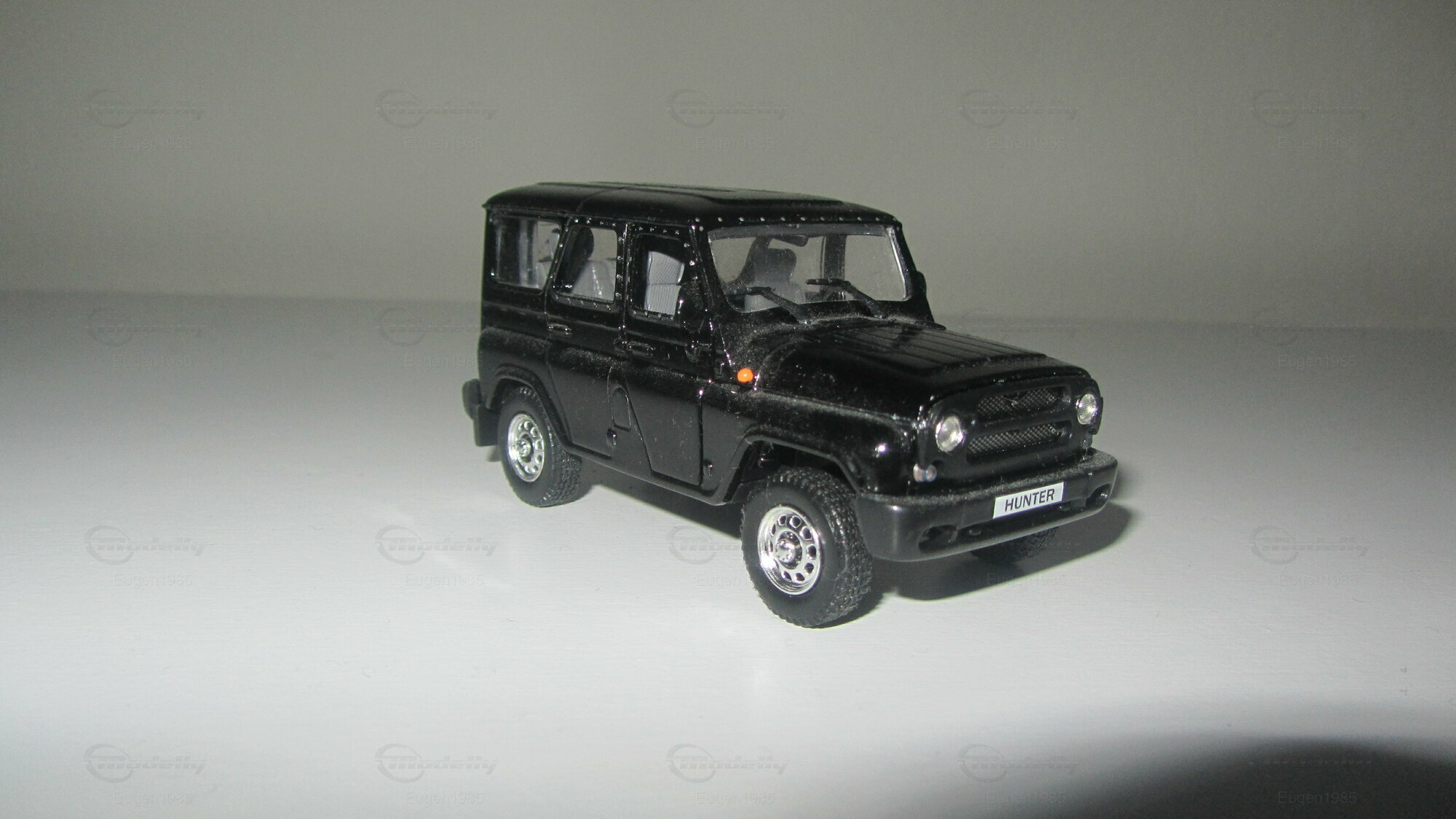This is UAZ Hunter. The model is made by Hongwell in scale 1:43. It has suspension and opening doors