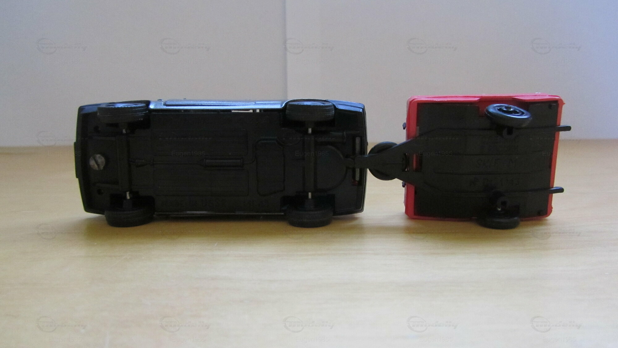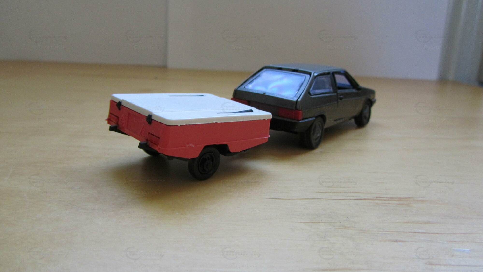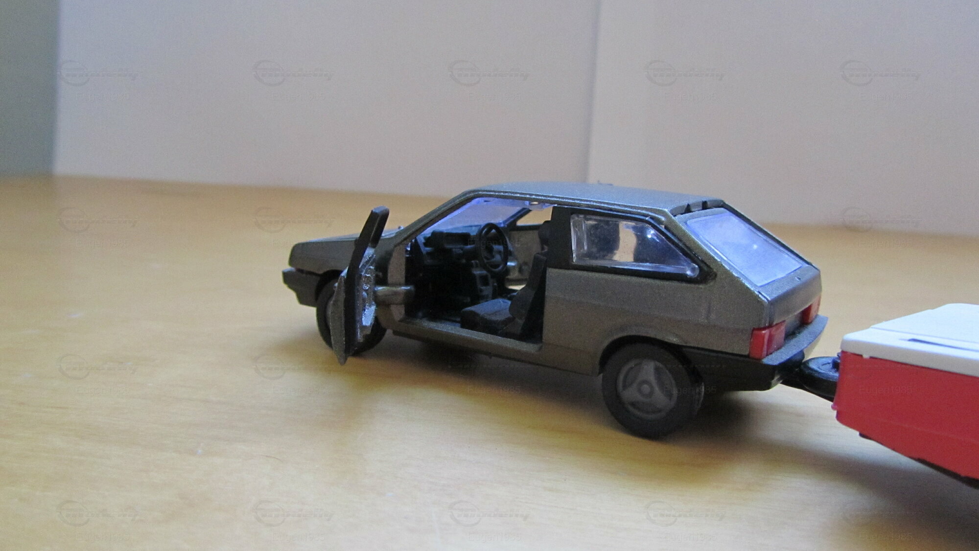 This is Lada 2108 with skiff camping trailer. The model is made in Russia in scale 1:43 after the fall of The Soviet Union. Everything opens.