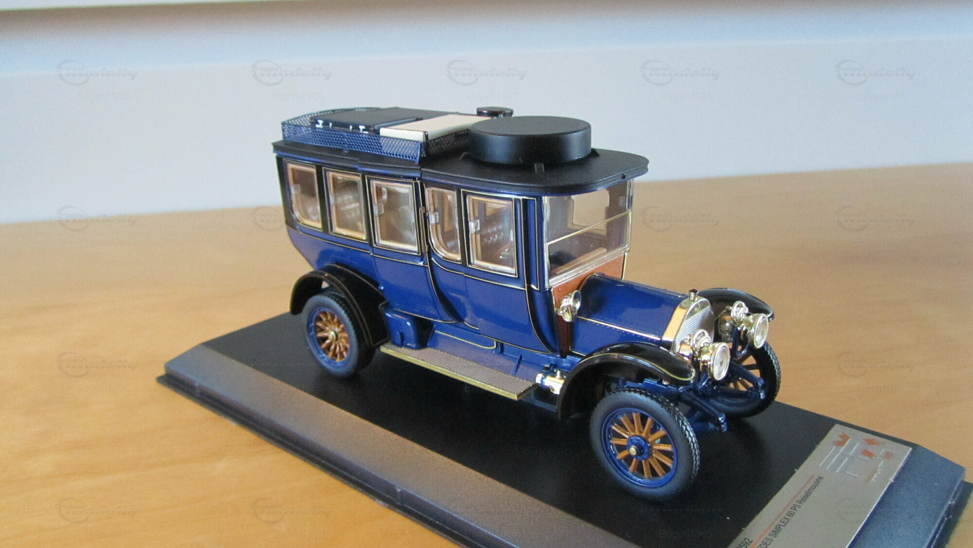 This Premium X model car in 1/43 scale, showcased by Modelly member "Eugen1985," accurately replicates the historic Mercedes Benz Simplex. Crafted from diecast material, this miniature model is remarkably detailed with impressive precision. Specific features of the original, like the distinctive hood, detailed headlights, and stylish wooden-spoked wheels, are clearly represented. The deep blue paint accented with gold details mirrors the elegant style of the historical vehicle. The high-quality craftsmanship and attention to detail make this model a special piece for collectors.