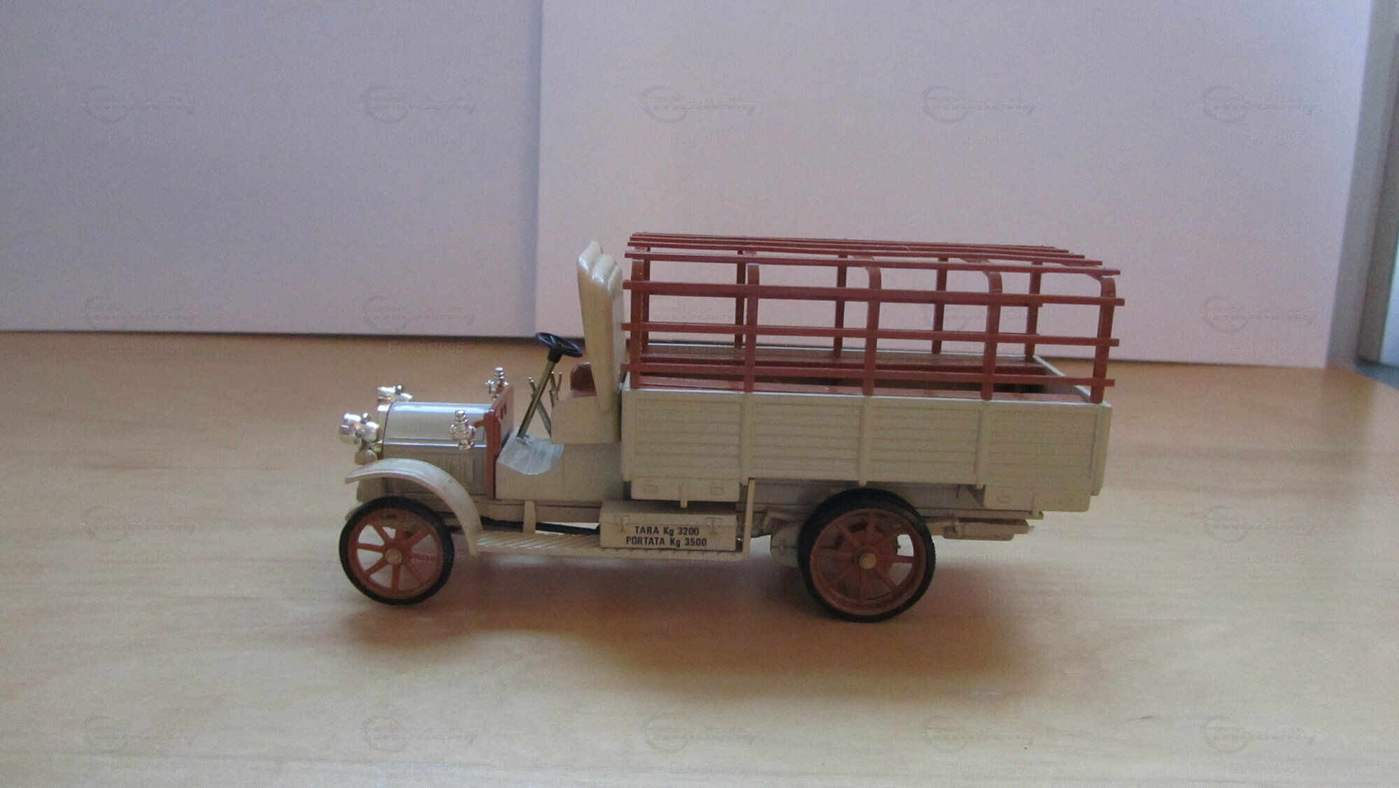 The 1/43 scale model of the Fiat 18BL by Rio Models is presented in beige and brown tones. The delicately drawn wooden slats of the cargo bed and the vehicle body in light beige reflect the historical colors of the original. Special highlights are the intricately reproduced headlights and the fine radiator grille, adding a special touch of authenticity to the model. The wheels, with their specific shape and color, as well as the clear labeling on the vehicle side, are lovingly depicted. This collector's item stands out for its accuracy in representation and high-quality craftsmanship. With this model in the collection, fans of historical vehicles can enjoy a piece of history in miniature form.