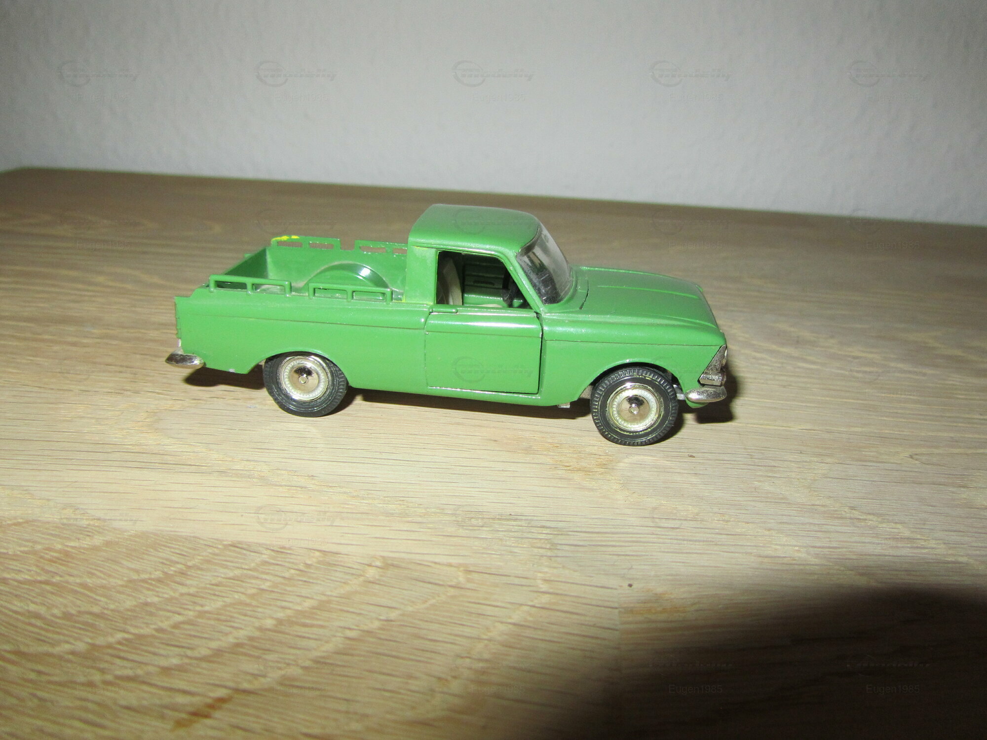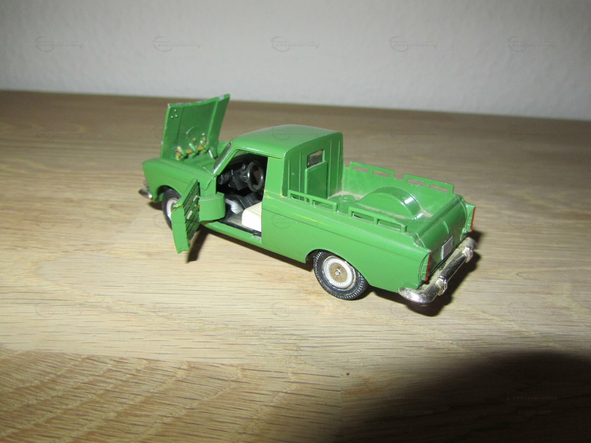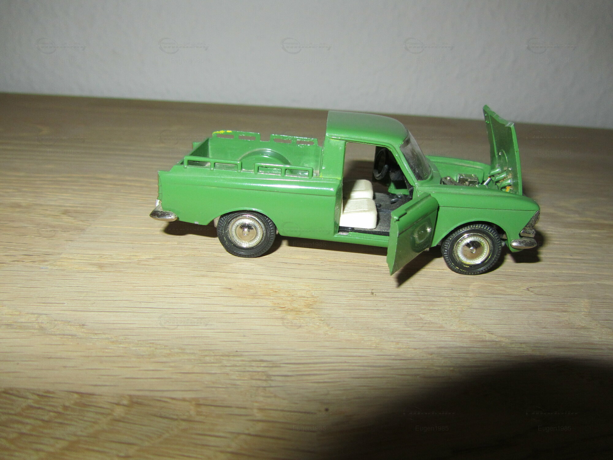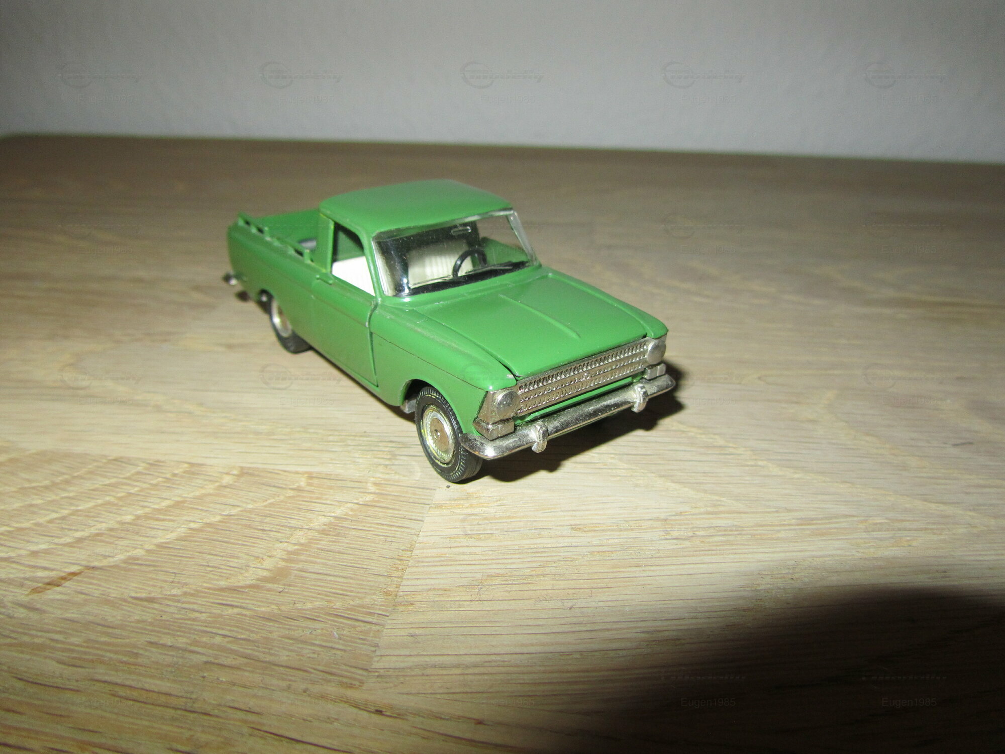 This is Moskvitch Pickup. The model is made by Saratov during The Soviet Union in scale 1:43. It has suspension, opening hood and front opening doors.