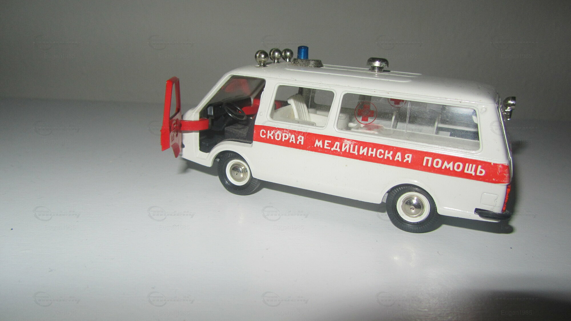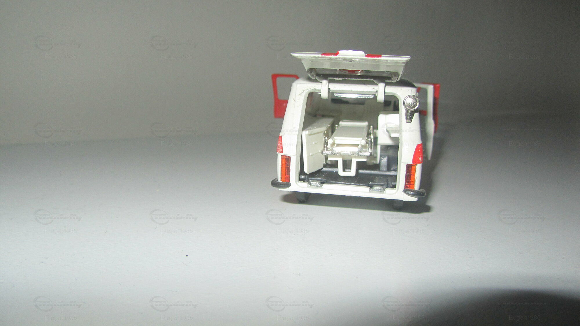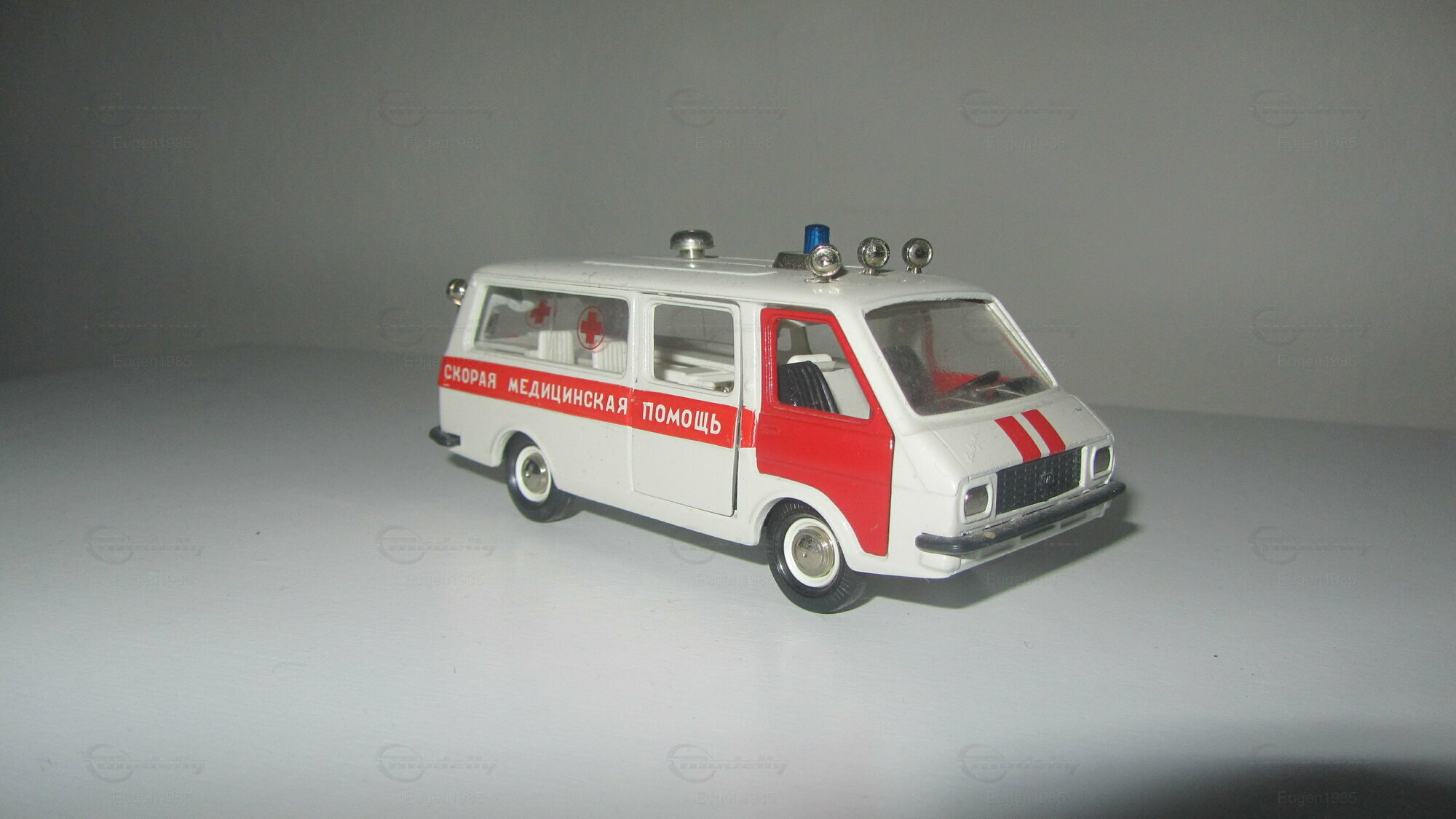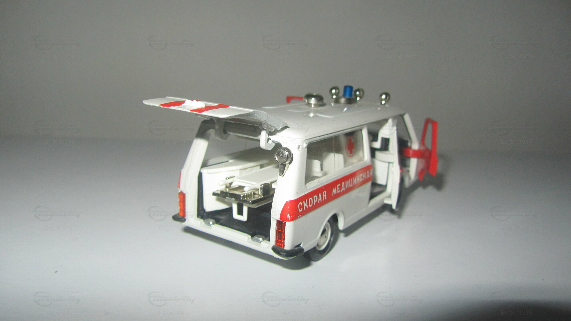 This is RAF 2203 Ambulance. The model is made in The Soviet Union in scale 1:43. Everything opens besides the hood and the strecher in the back can be taken out.