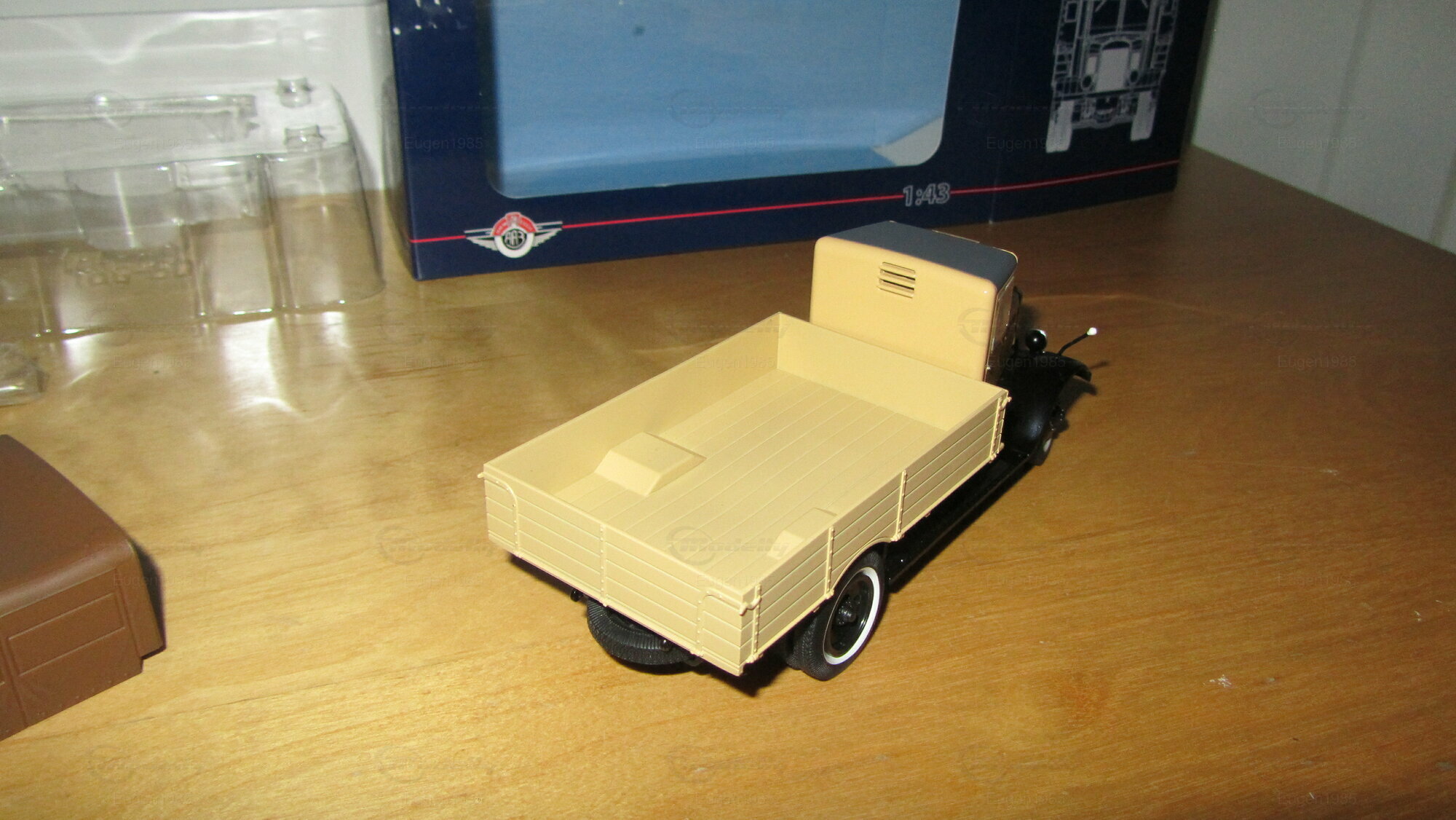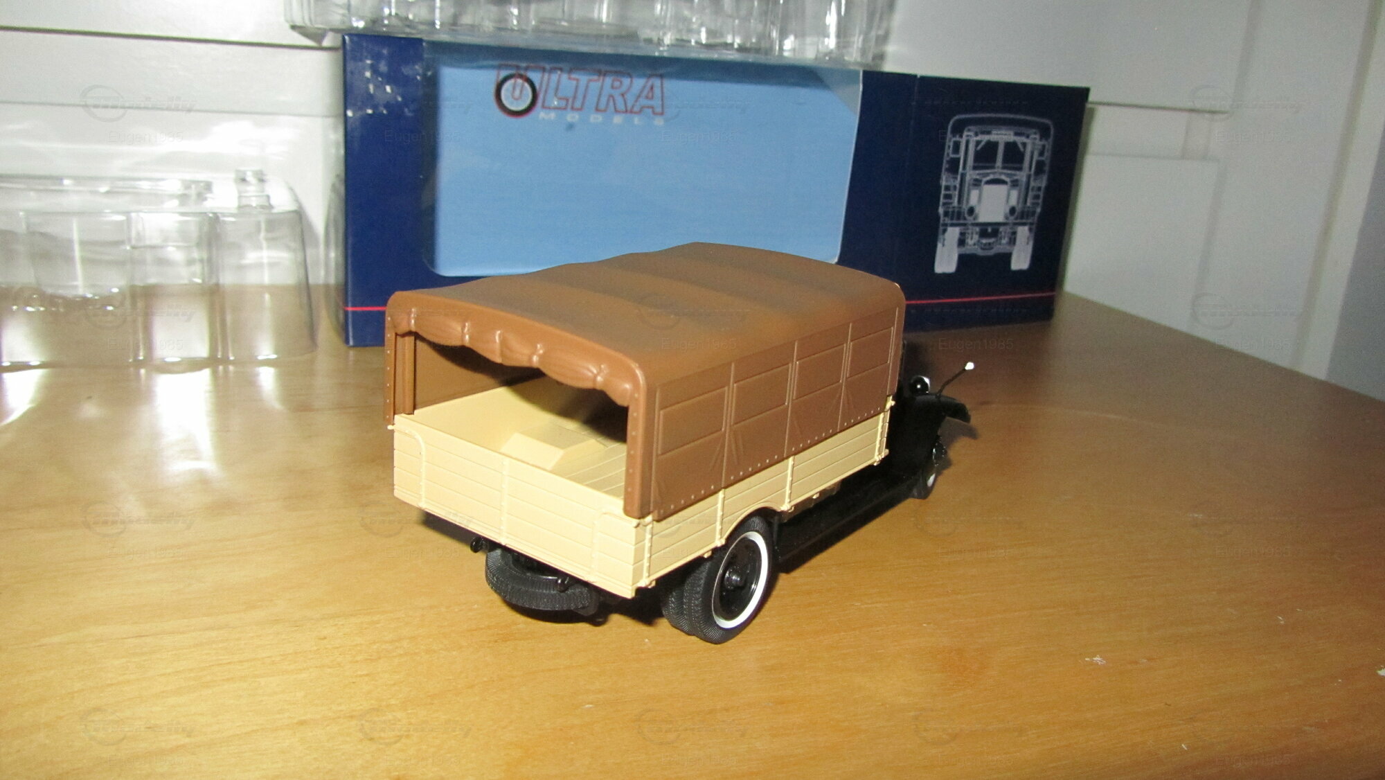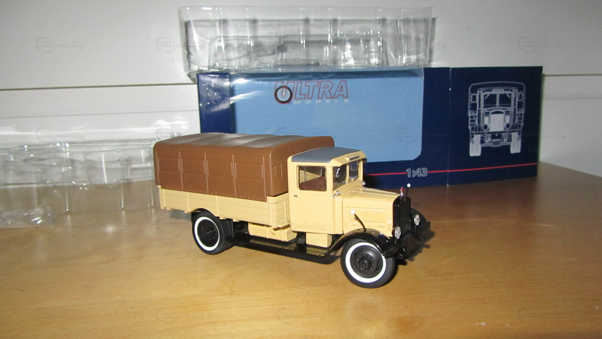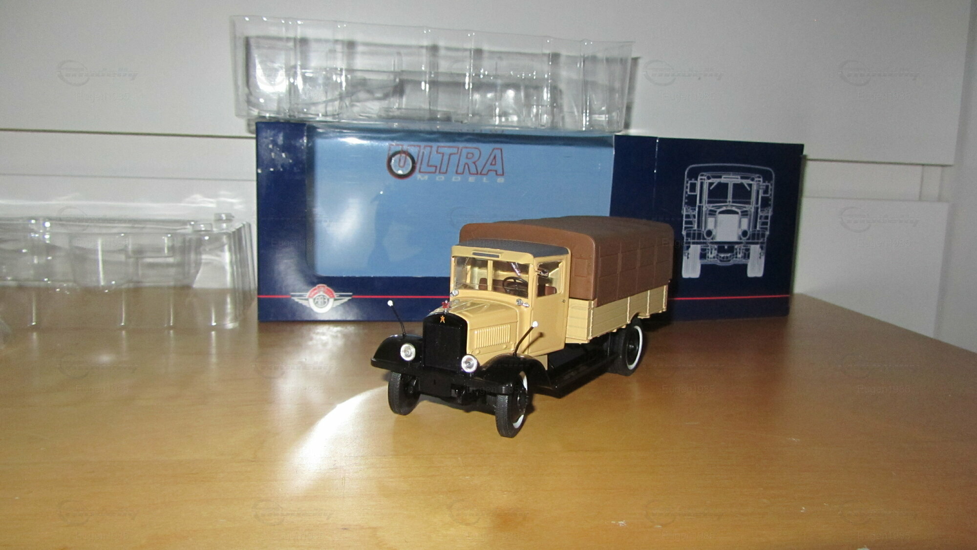 This is YaG - 5D. It is a diesel truck from The Soviet Union from 1933. The model is made by Ultra Models in scale 1:43. YaG - 5 is a Soviet heavy truck with a payload of 5 tons, produced at the Yaroslavl State Automobile Plant from 1929 to 1934. The design of the truck was based on an earlier model of the same plant YaG - 4, the main difference from which was the use of an imported (American) power unit - a Hercules engine, a Long or Brown-Lipe clutch, a Brown-Lipe gearbox . Production of YaG - 5 began in the second half of 1929 and continued until 1934. During this time, 2,273 trucks YaG -5 were manufactured. This number does not include 364 chassis YaG - 6 which is a long-bodied variant of YaG - 5. The termination of production of the YaG-5 truck is due to the decision taken to abandon on January 1, 1932, from the import of power units. This decision, in turn, was due to the development at the Stalin Plant of production of the truck AMO-3. The power unit of this machine (a copy of the American Hercules-WXB) had a capacity of 60 liters, from. - one and a half times lower than that installed on the YaG - 5 Hercules-YXC-B. Nevertheless, since 1932 the AMO-3 engine has been installed on the YaG chassis - the new truck has received the designation YAG-3. Formally, the YaG-5 production ceased on this basis, and all the remaining Hercules-YXC-B engines were reserved by the military for the production of the three-axis YAG-10. However, small YaG-5 series continued to be produced - in 1933-1934 another 48 Yakovlev trucks were manufactured.