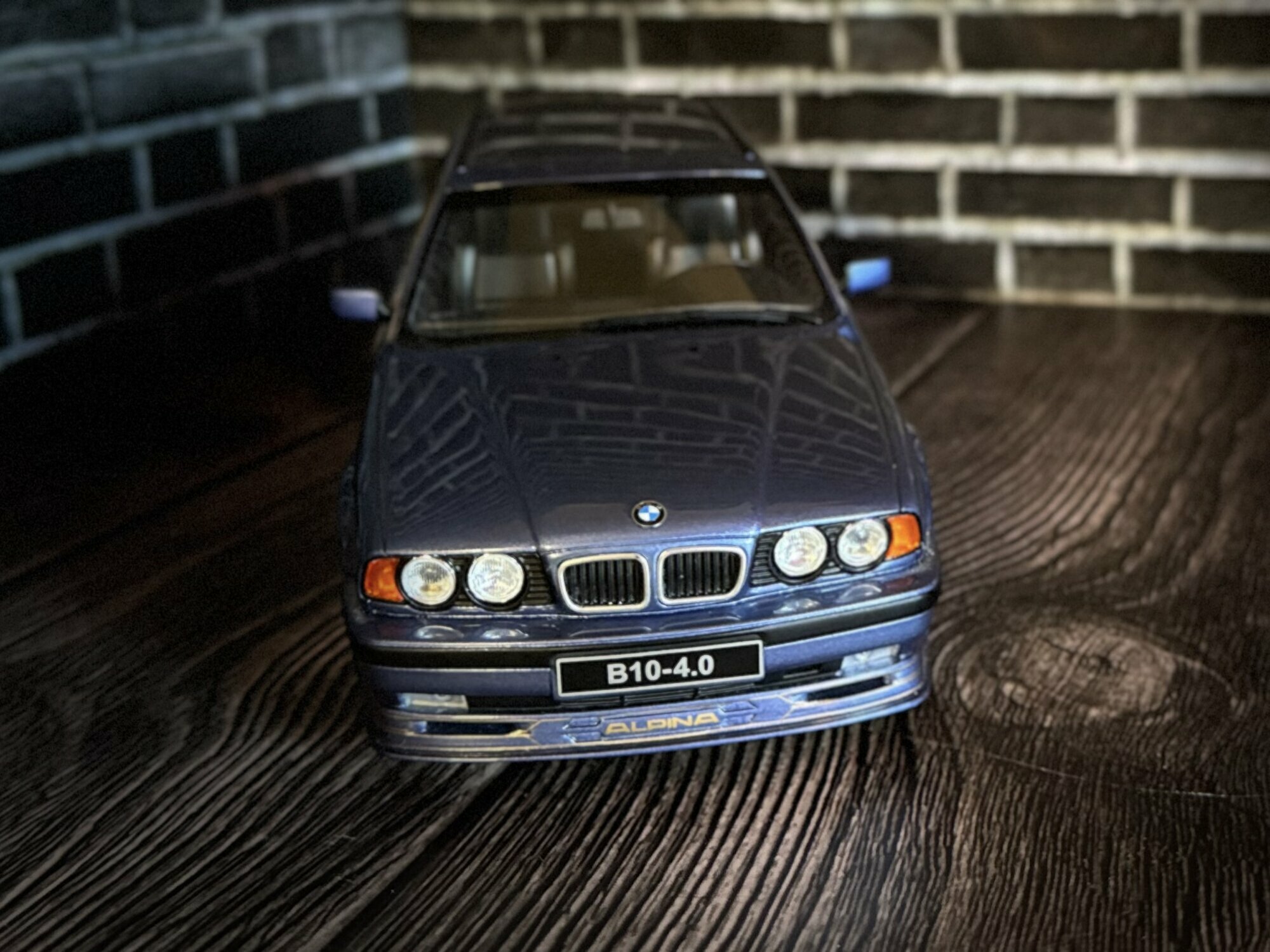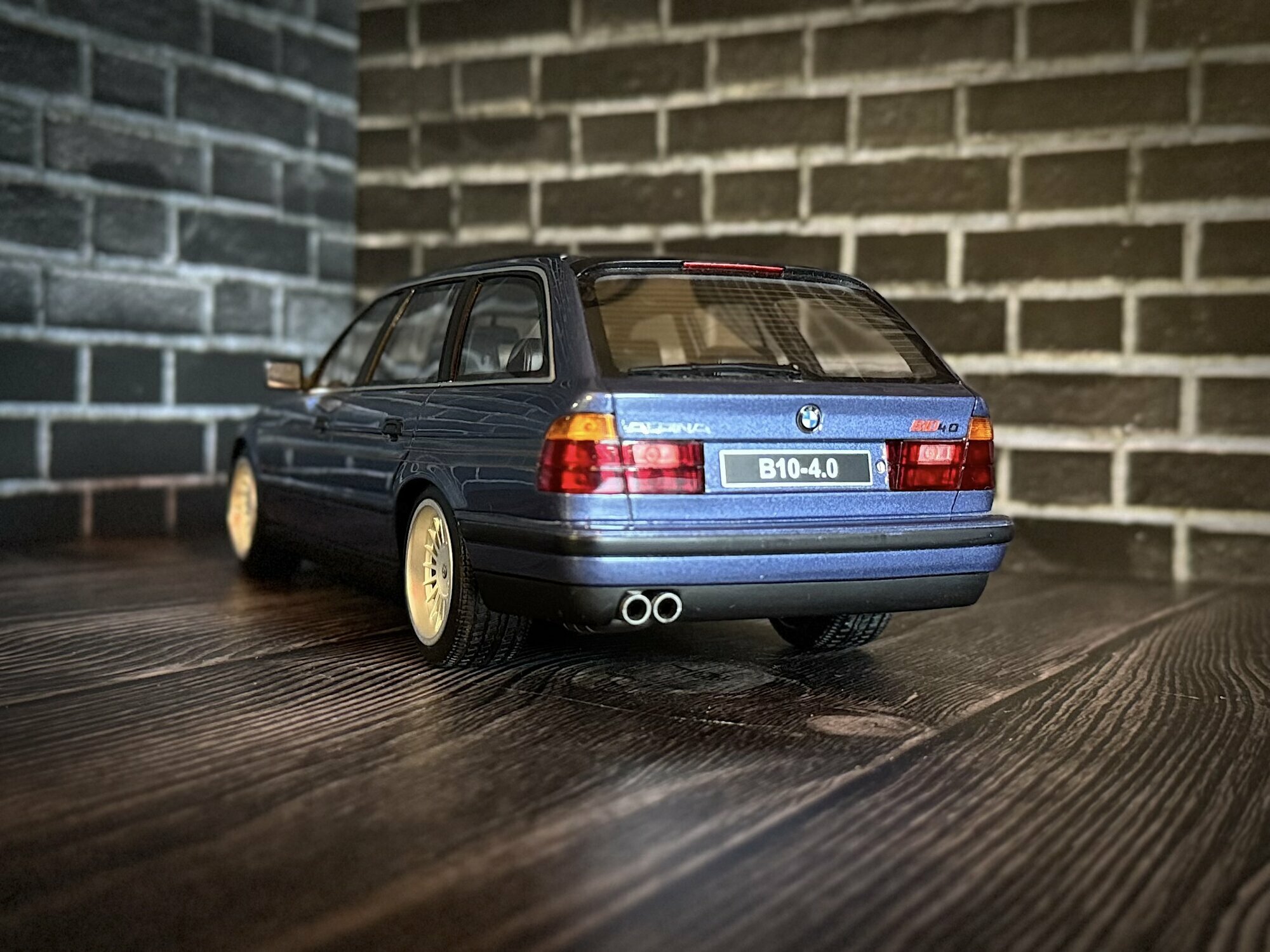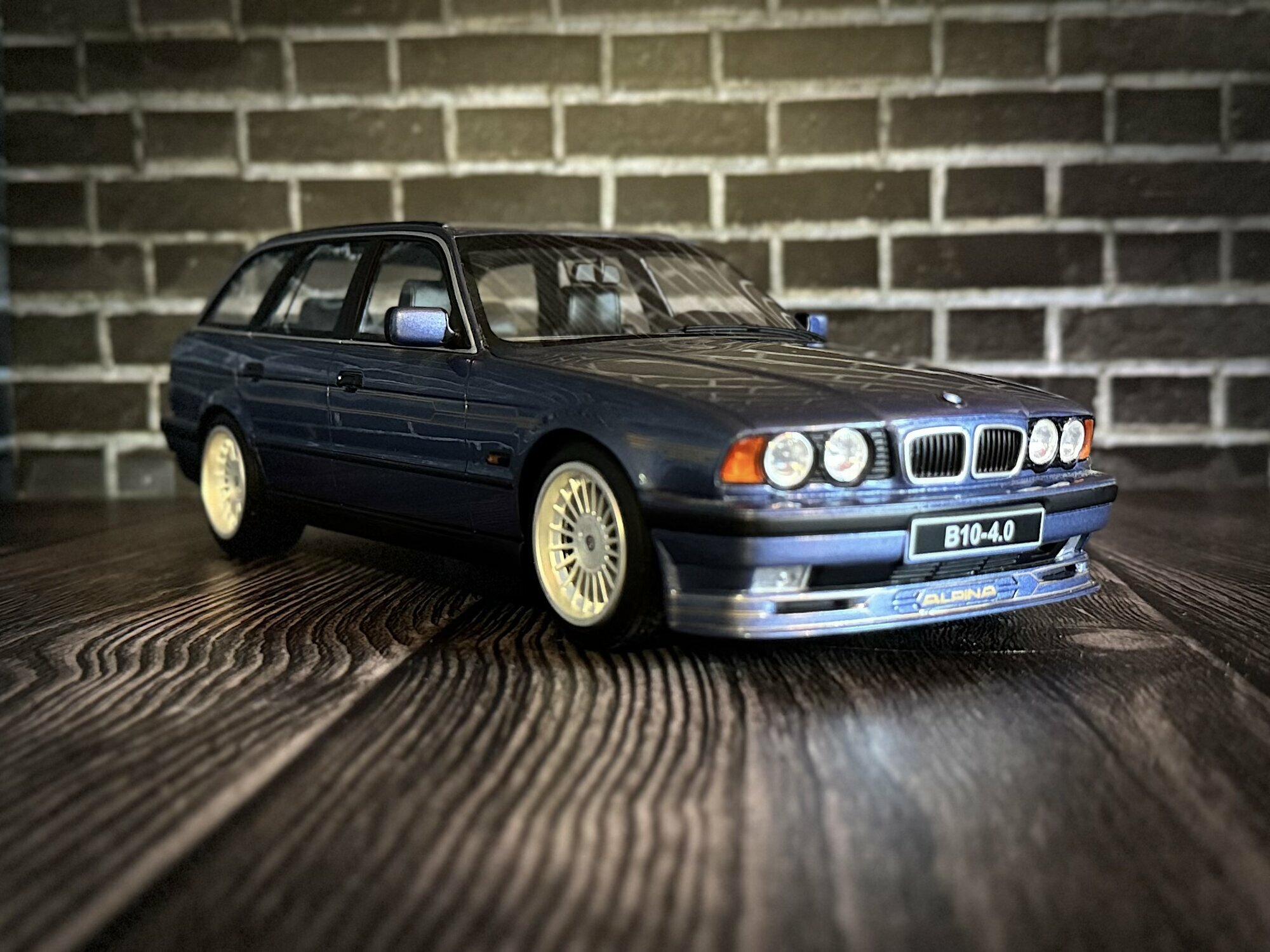 The photos show a model from collector “Evil500.” It’s a 1/18 scale model by Ottomobile, made from diecast. This piece is limited to 3,000 pieces worldwide, so it’s clearly collectible. Up front the twin headlights are done in clear lens style; the BMW grille and the subtle ALPINA front lip are nicely lettered with “ALPINA” and “B10-4.0” like the real car. The paint is a fine blue metallic; you can see the pigment sparkle in the light. Along the sides run the typical understated ALPINA decal stripes. The model’s wheels reproduce the multi-spoke ALPINA Classic look; depending on the light they appear silver or slightly gold, which contrasts nicely with the darker body. At the back you get the twin-section tail lights, the single left-side twin tailpipe and correct badging on the tailgate. The Touring proportions — long roofline, large tailgate and short overhangs — are well captured. Panel gaps are flush and even. Inside you can make out sport seats, the center console, a three-spoke wheel and printed gauges. As a 1/18 diecast model it’s designed for display-case detail while the diecast construction gives it a solid feel. This example also shows the limitation note limited to 3,000 pieces worldwide on the packaging.
