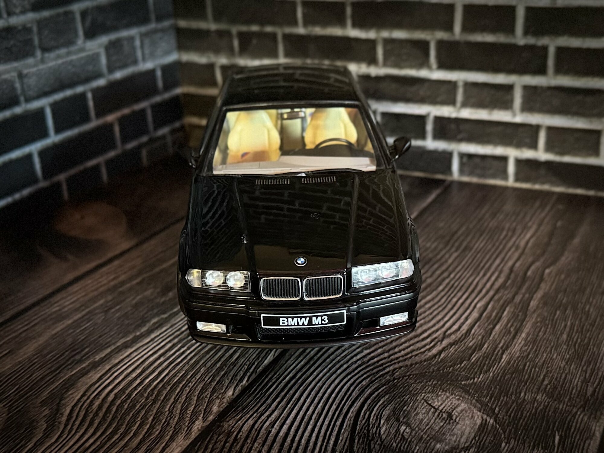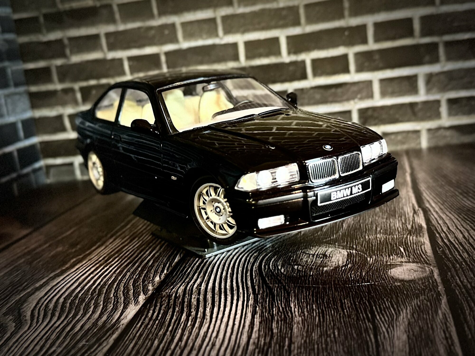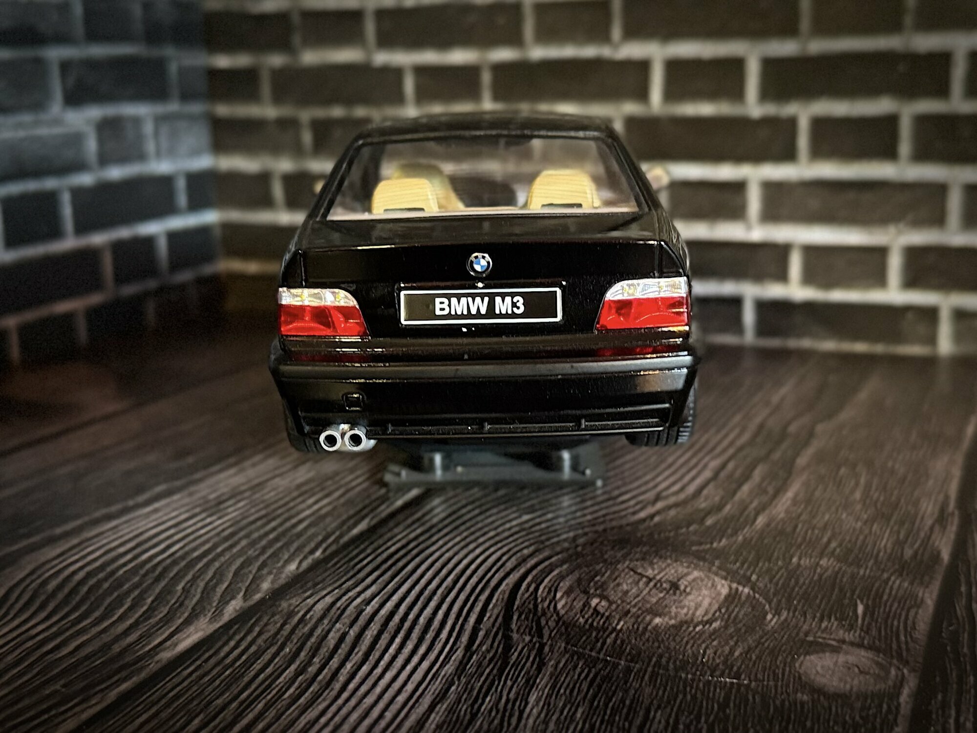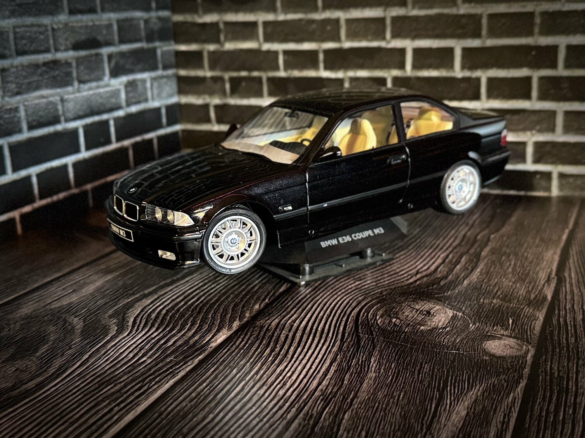 The photos show a 1/18 scale model from Solido that’s modeled on the BMW E36 M3 coupe. It’s part of collector Evil500’s collection. According to the maker it’s diecast metal, which gives a solid body and crisp edges. The finish is black with an even gloss. The twin-kidney grille is a separate piece, and the rectangular clear headlights include suggested reflectors. The front bumper has the M-type lower valance and small fog lamps. Along the sides you can see neatly engraved panel lines, separately fitted door handles and a continuous side trim. The wheels are multi-spoke with a BMW center cap; I can’t tell a specific wheel maker from the photos. At the rear the red tail lamps have clear indicator sections, there’s a twin-tip exhaust on the left and a license plate area with an “BMW M3” badge. The interior is a light beige, with heavily bolstered front seats, hinted headrests and a black dash. Proportions match the coupe—short overhangs and a slightly rising beltline. The model sits on a base labeled “BMW E36 COUPE M3”, so it’s clearly presented as the M3. Worth noting: it’s a standard, road-car representation from Solido in 1/18 diecast form, with no obvious racing livery or movie tie-in—basically a stock-looking display piece.
