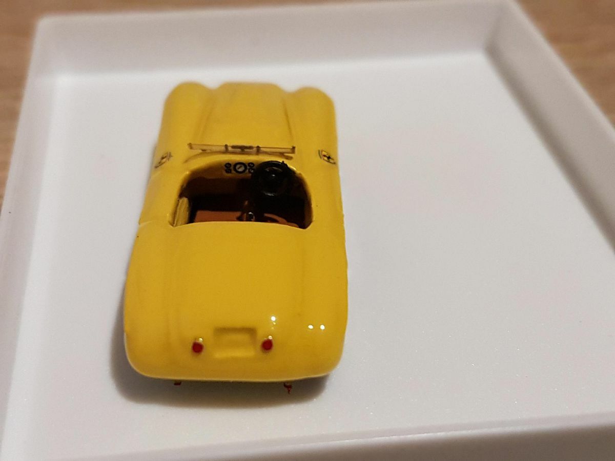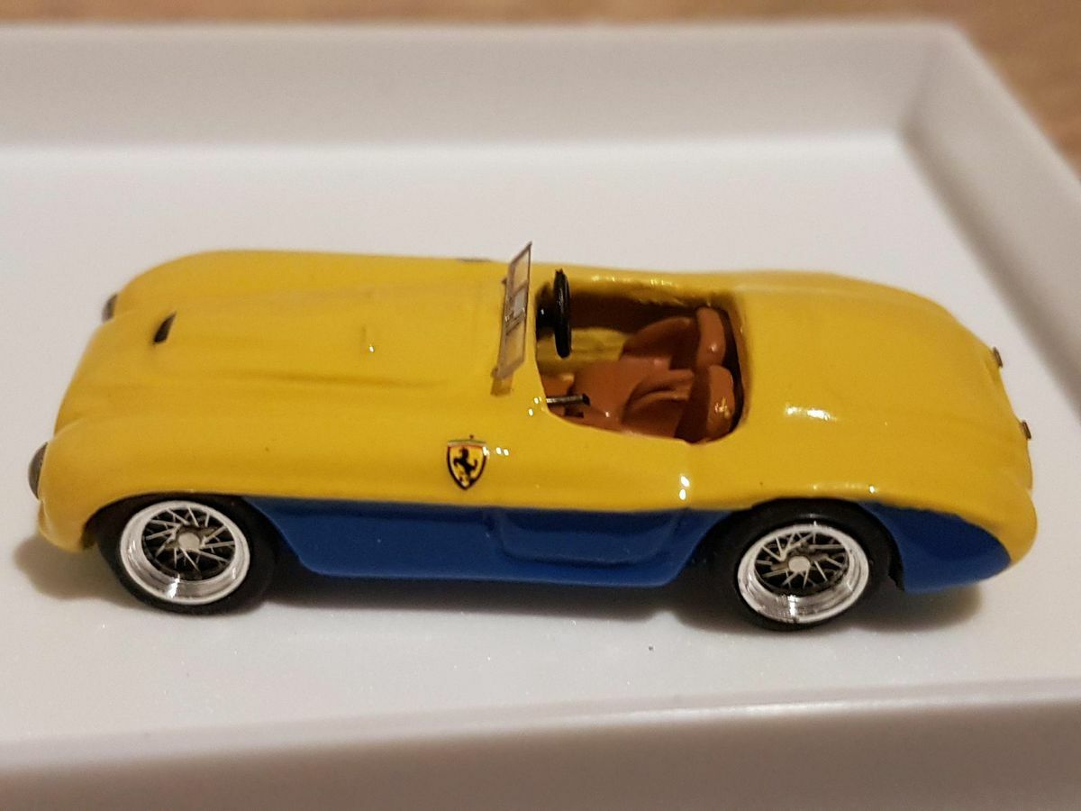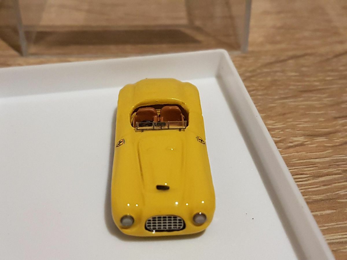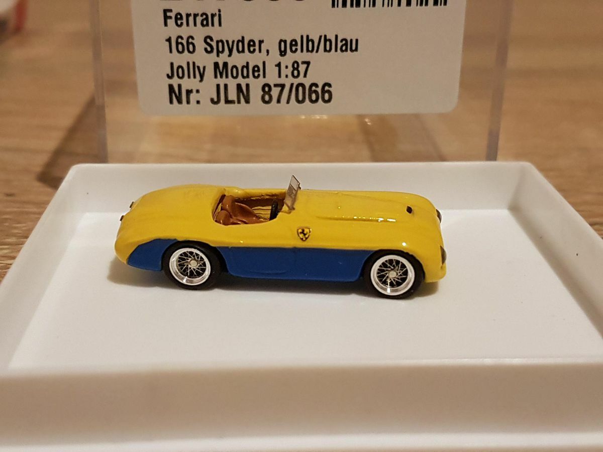 The model car presented here in the 1/87 scale was crafted by Jolly Model and is based on the famous Ferrari 166mm Spider. Made from high-quality resin, this model allows for a detailed and precise reproduction of the original. Part of the collection of Modelly member "Ferrarisammler71," this model captivates with its high level of detail and meticulous craftsmanship. The model's paintwork features a striking yellow and blue color scheme with the classic Ferrari emblem on the sides. The intricately designed wheels reflect the wire spokes of the original, giving the model an authentic look.