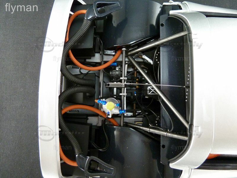 ist von GMP, da es zu einem andern Typ gehört, ist es auch zu den Modellen in Orangerot und Rubinrot verändert worden. Der größte Unterschied ist der fehlende Flügel. In der Motorhaube gibt es zwei Öffnungen für die Ansaugluft zum Motor und die Ansaugkrümmer sind nicht abgedeckt. Unter der Haube hinten fehlen die Stützen für die Abdeckung über dem Differenzial.