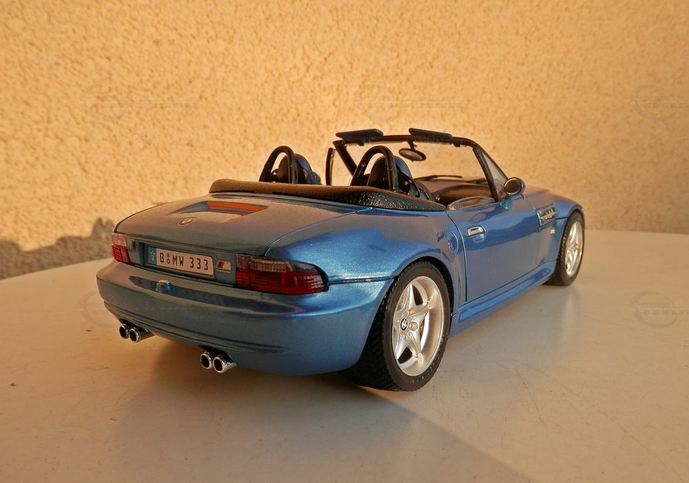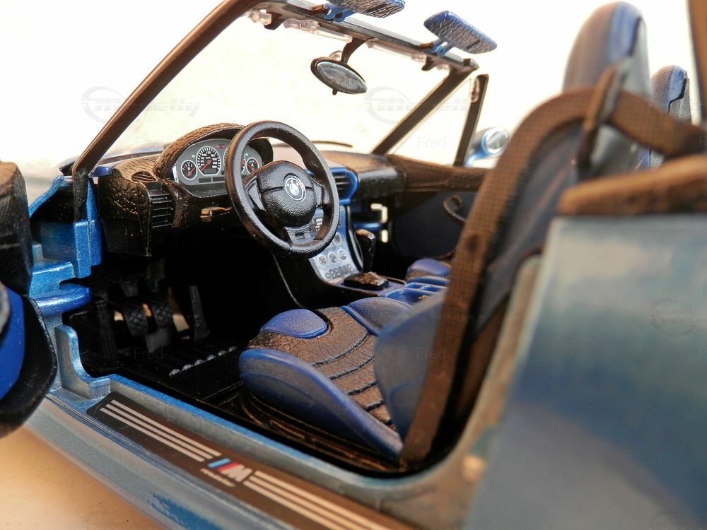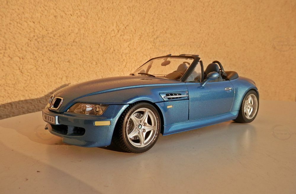 The model of the BMW Z3 M Roadster showcased here is a 1/18 scale replica manufactured by Bburago. Owned by a Modelly member named Fred, this diecast model faithfully captures the details of the original car. Its metallic blue finish perfectly complements the Roadster's sleek silhouette. The model features accurately replicated front and rear lights, fine ventilation slits, and specific rims. Even small details like the mirrors and door handles are depicted with precision.