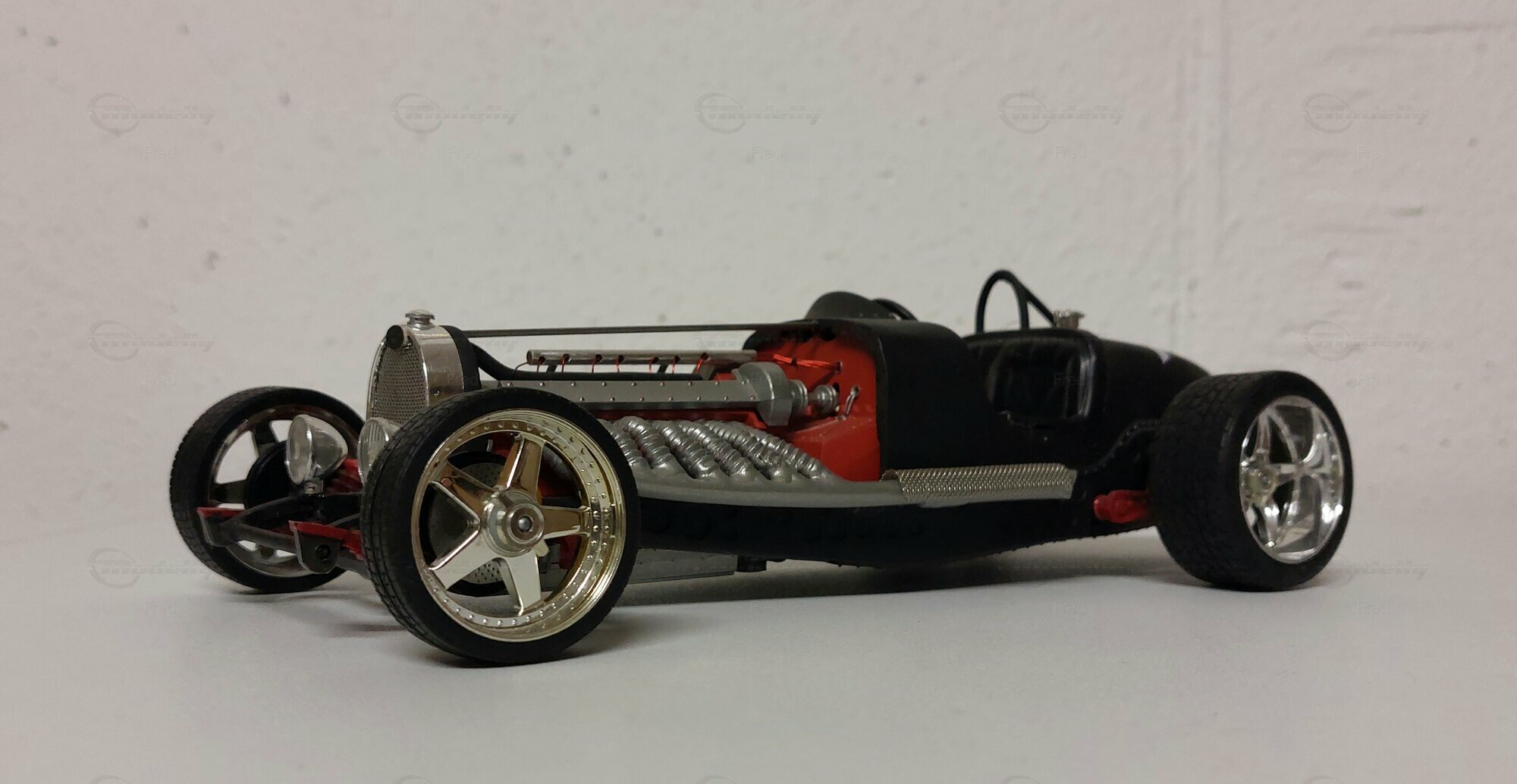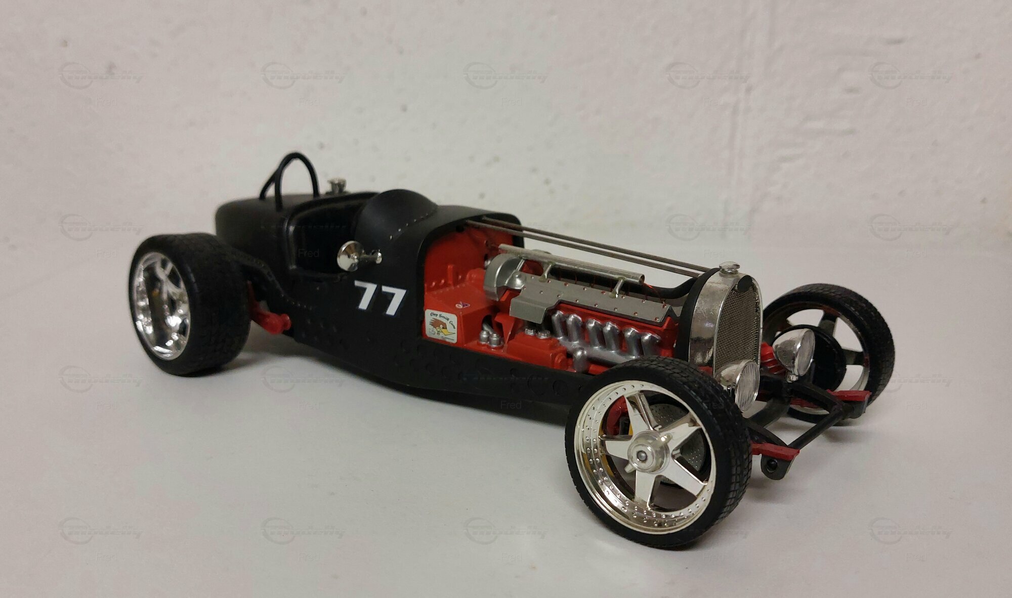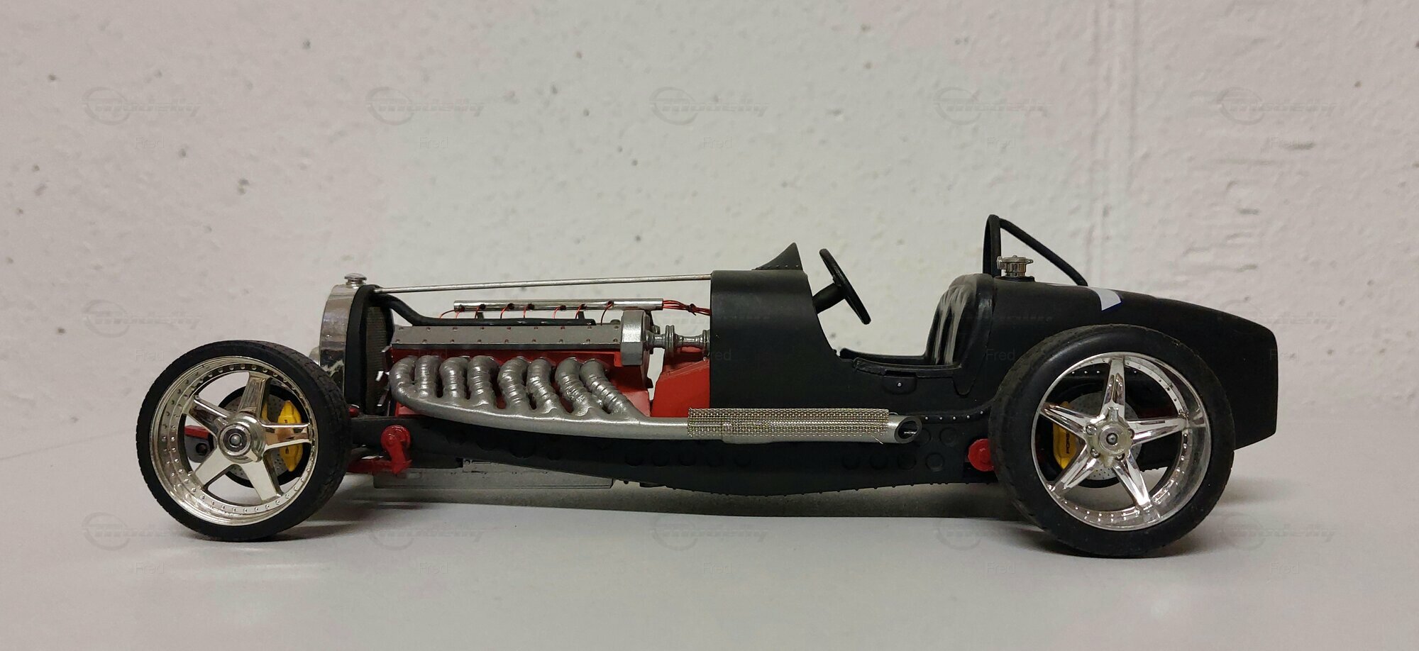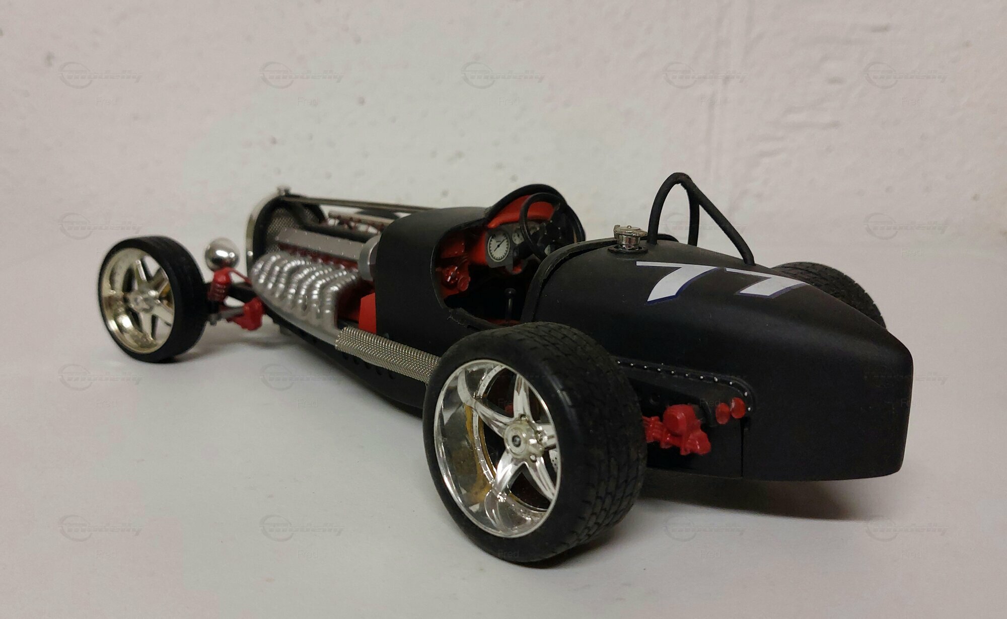 The model described here is a 1/18 scale diecast replica of the Bugatti Type 59 by Bburago. Model enthusiast "Fred" has this model in his collection, and it is evident that it is a modified version. This means that the model does not correspond to the original product manufactured by Bburago. Notably, the model features special wheels, potentially products from HRE Performance Wheels, Model 305M. Additionally, the model showcases a striking black with red accents paint scheme and the race number "77." The intricate detailing of the engine and interior are standout features that give the model a unique authenticity.