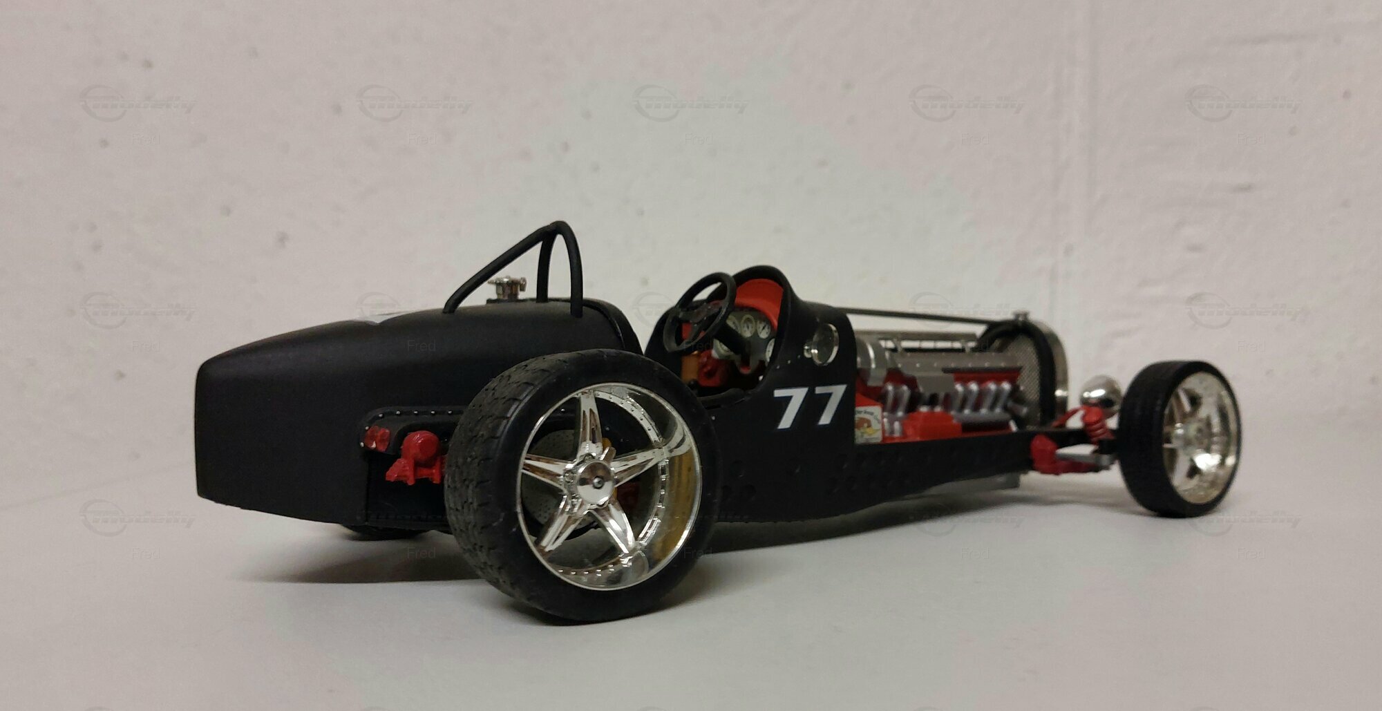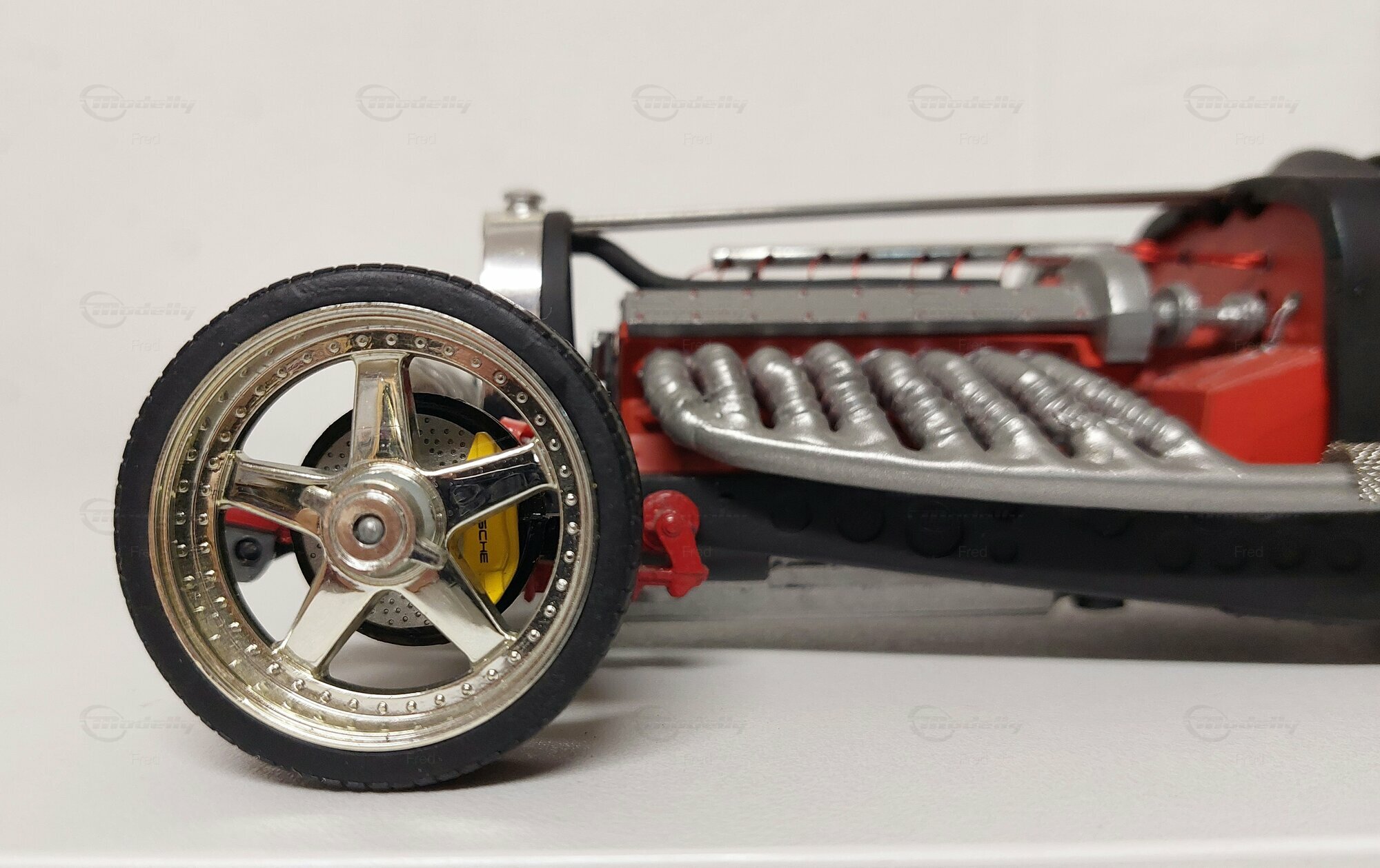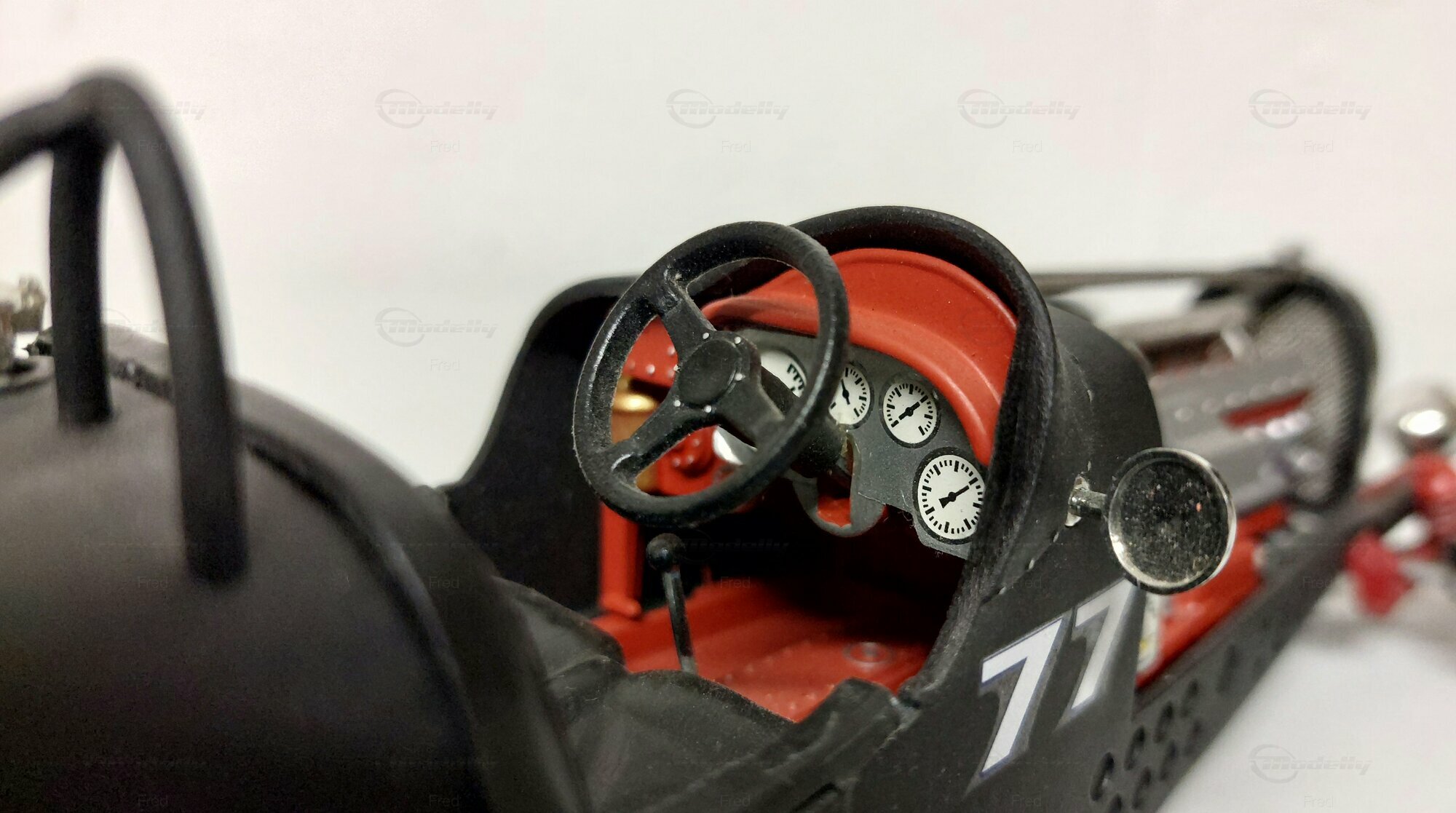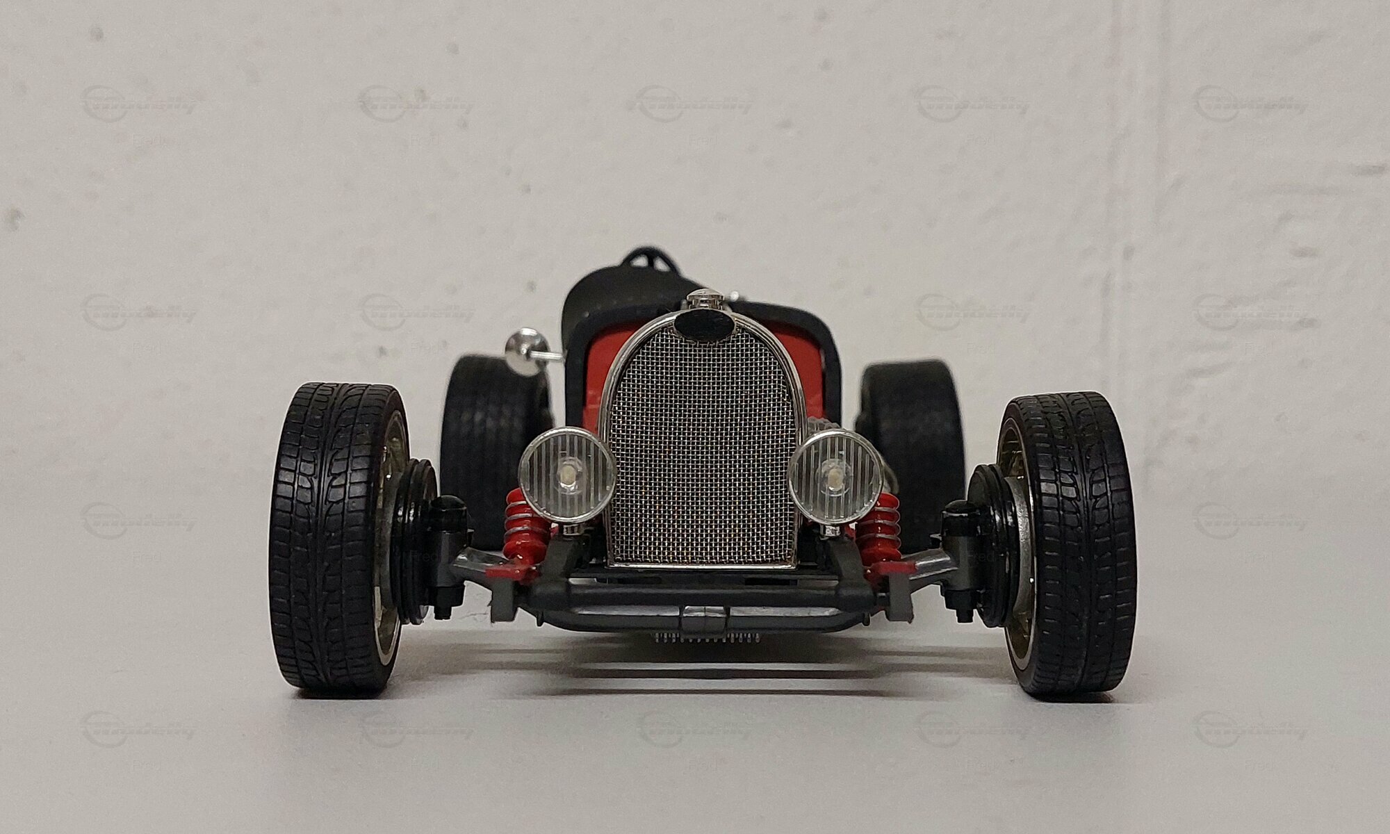The model described here is a 1/18 scale diecast replica of the Bugatti Type 59 by Bburago. Model enthusiast "Fred" has this model in his collection, and it is evident that it is a modified version. This means that the model does not correspond to the original product manufactured by Bburago. Notably, the model features special wheels, potentially products from HRE Performance Wheels, Model 305M. Additionally, the model showcases a striking black with red accents paint scheme and the race number "77." The intricate detailing of the engine and interior are standout features that give the model a unique authenticity.