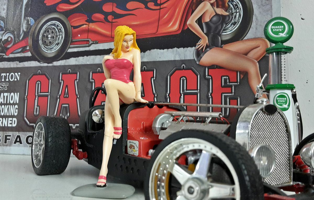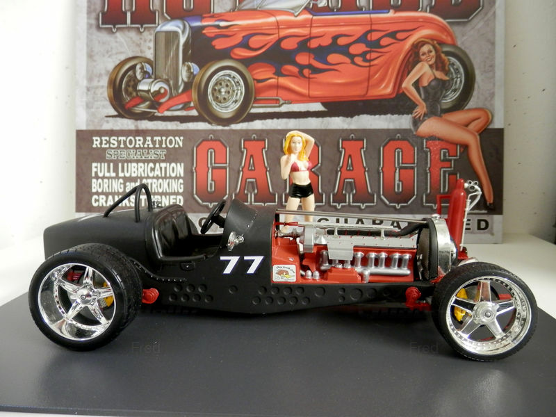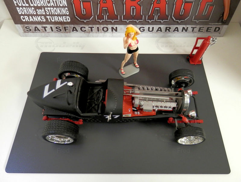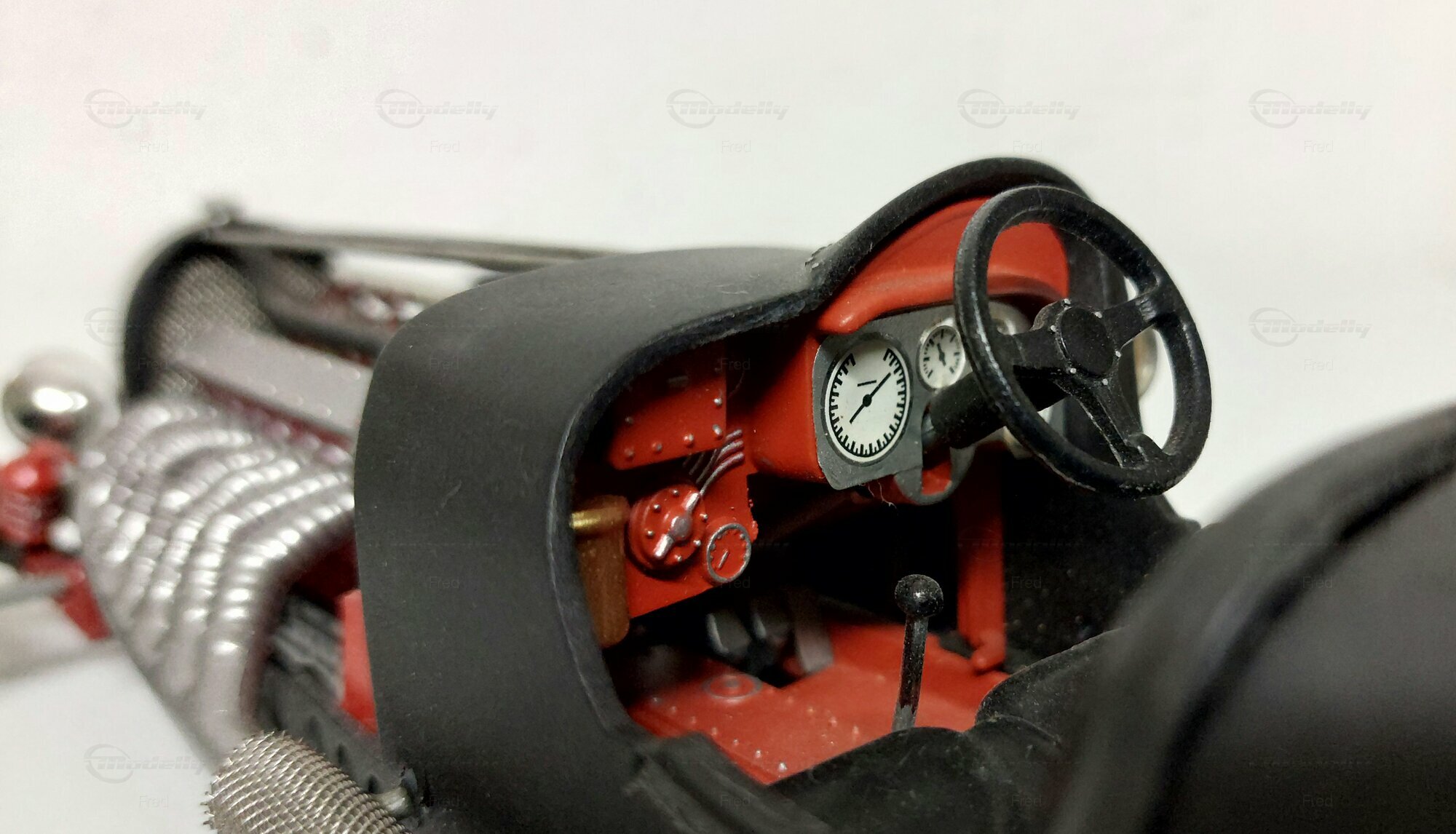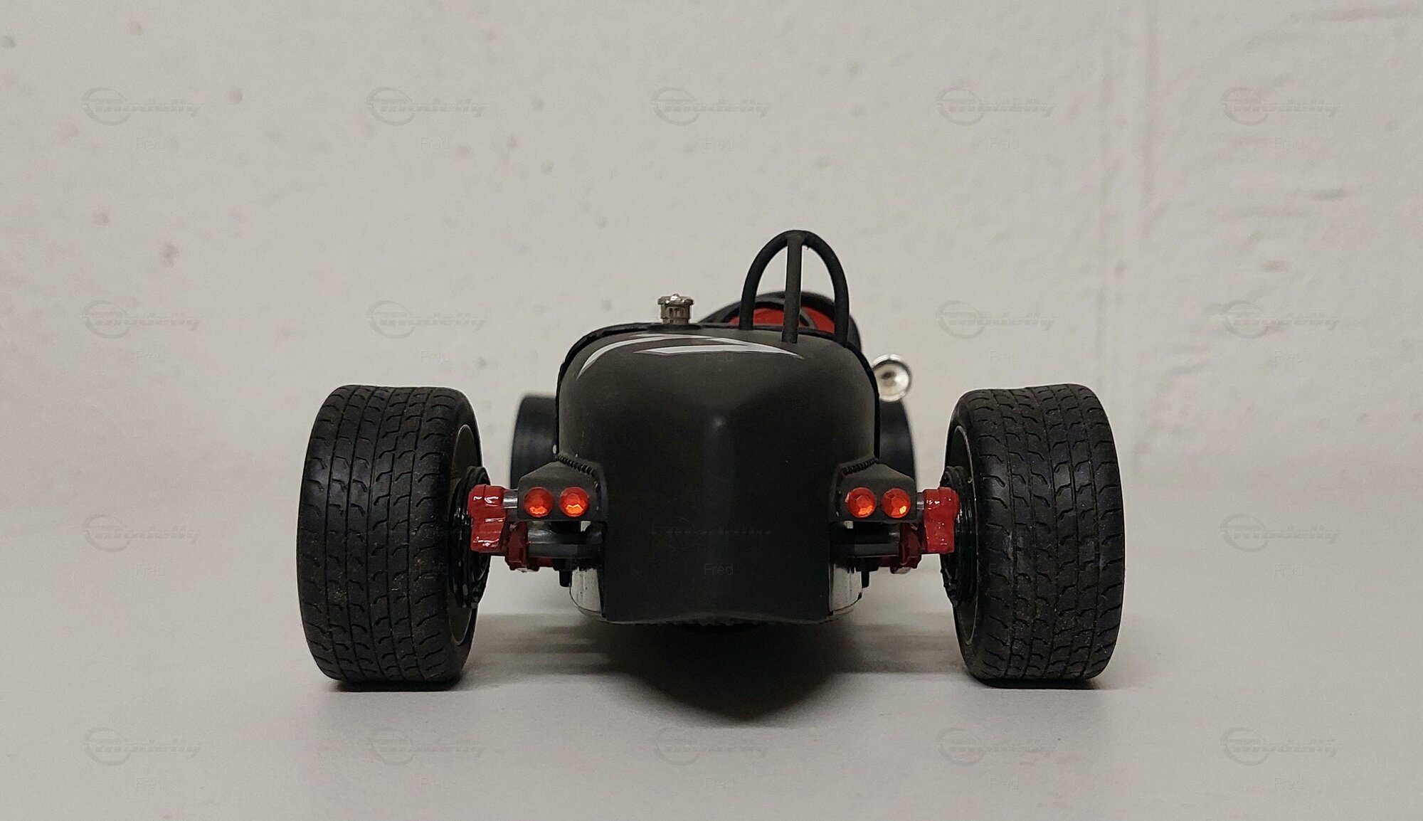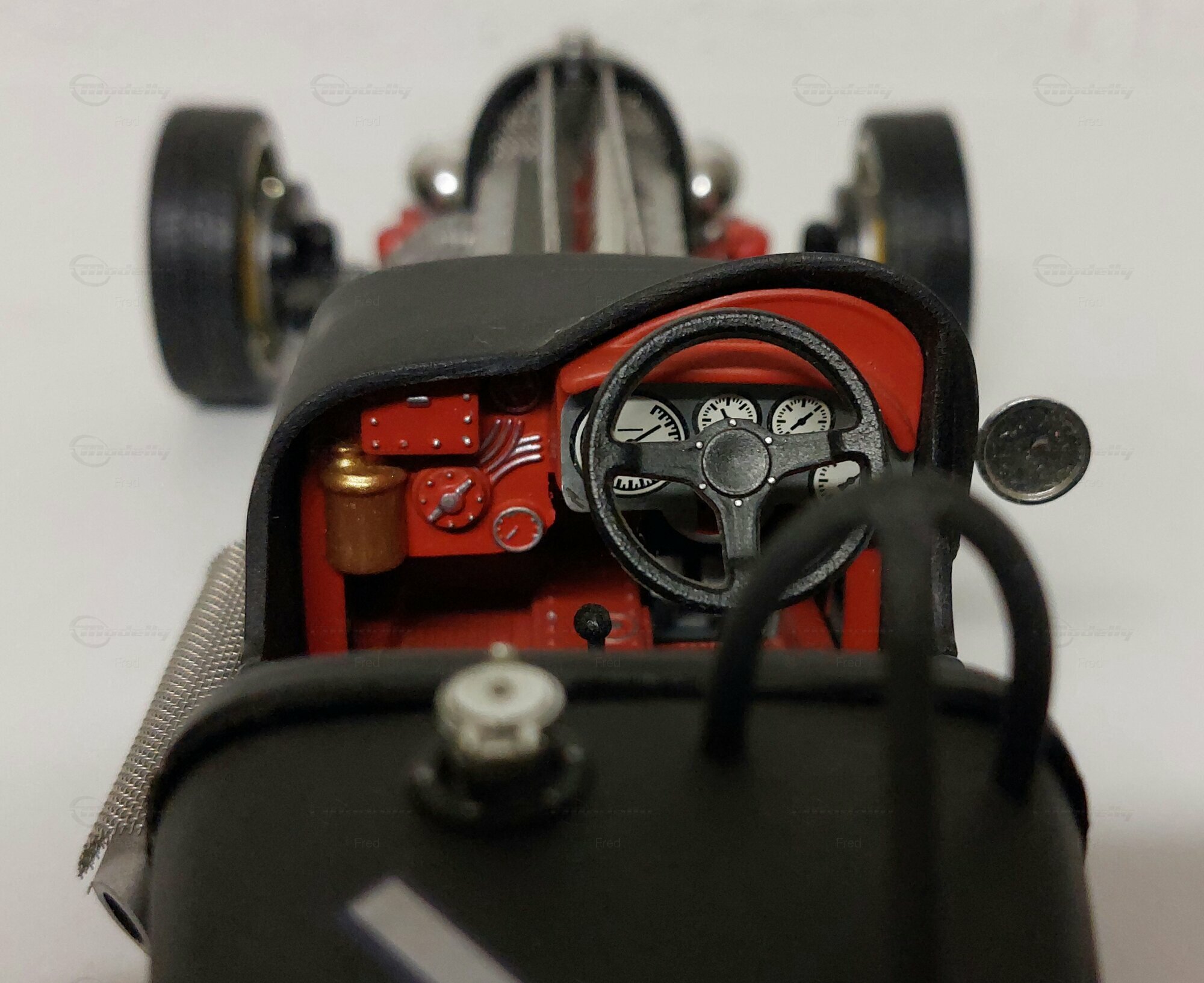 The model described here is a 1/18 scale diecast replica of the Bugatti Type 59 by Bburago. Model enthusiast "Fred" has this model in his collection, and it is evident that it is a modified version. This means that the model does not correspond to the original product manufactured by Bburago. Notably, the model features special wheels, potentially products from HRE Performance Wheels, Model 305M. Additionally, the model showcases a striking black with red accents paint scheme and the race number "77." The intricate detailing of the engine and interior are standout features that give the model a unique authenticity.