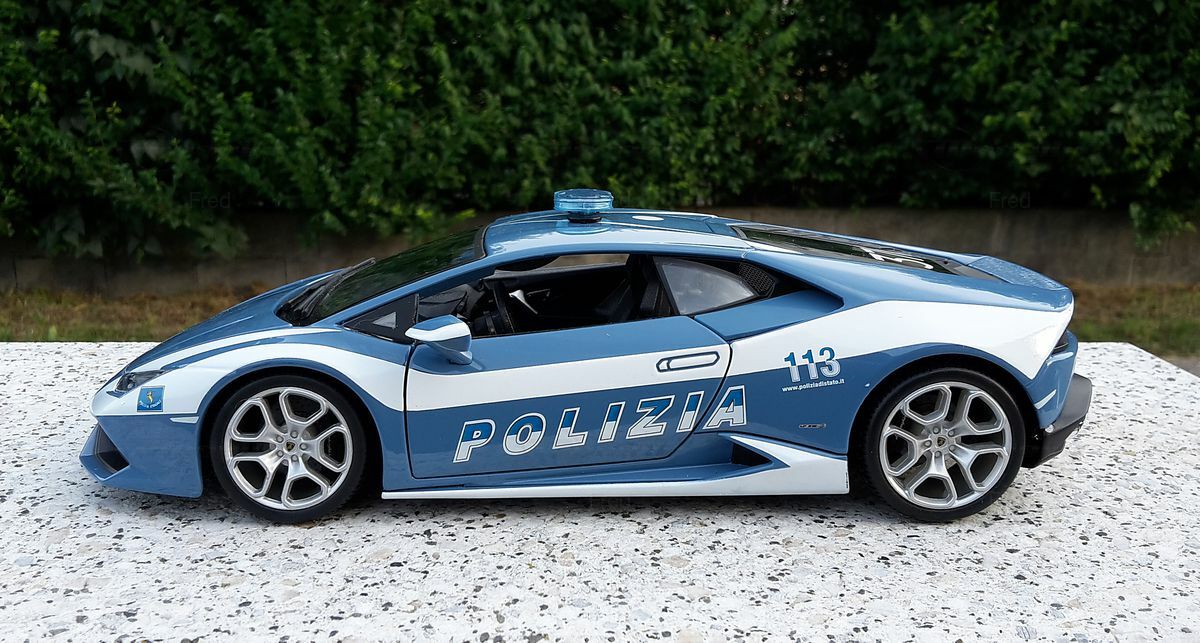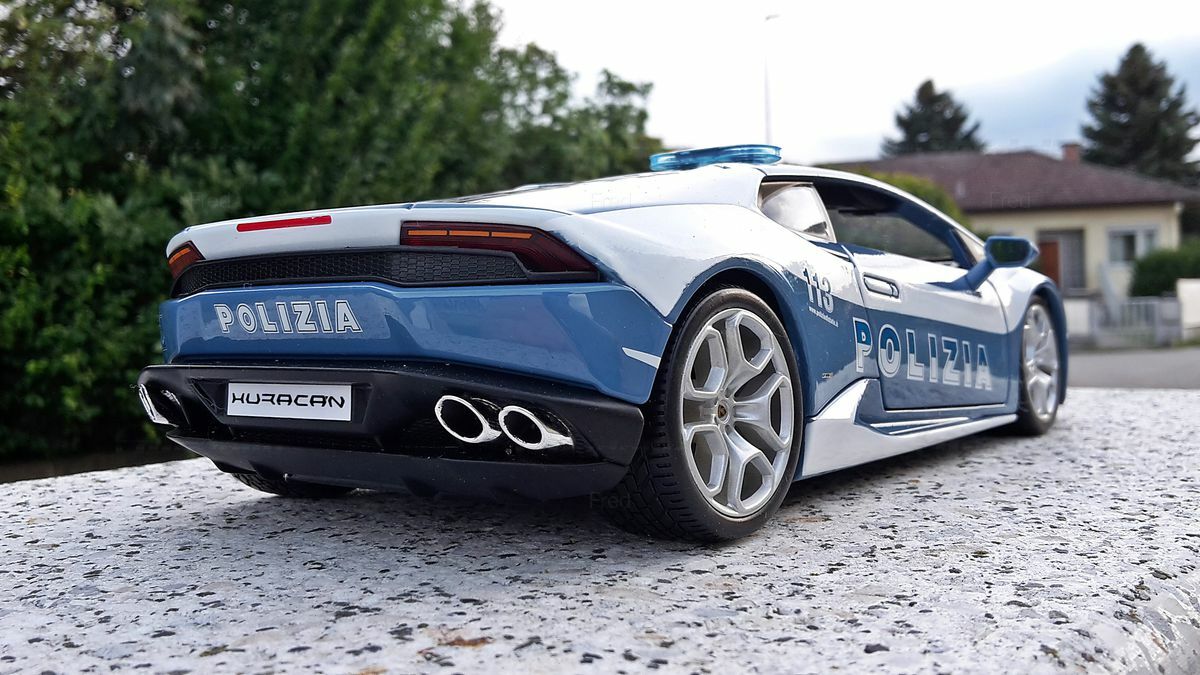 The model car shown here in 1/18 scale comes from the renowned brand Bburago and belongs to the collection of Modelly member "Fred." This model made of high-quality die-cast material portrays a Lamborghini Huracan LP610-4 in a special police version. The intricacies of the design are wonderfully captured in this model. The distinctive lines, aggressive front, and characteristic rear of the Huracan have been accurately replicated by Bburago. Special attention has been paid to details such as the authentic "Polizia" lettering and the police vehicle accessories, including the LED blue light on the roof. The model features authentic blue and white paintwork as well as realistically depicted wheels and brakes.