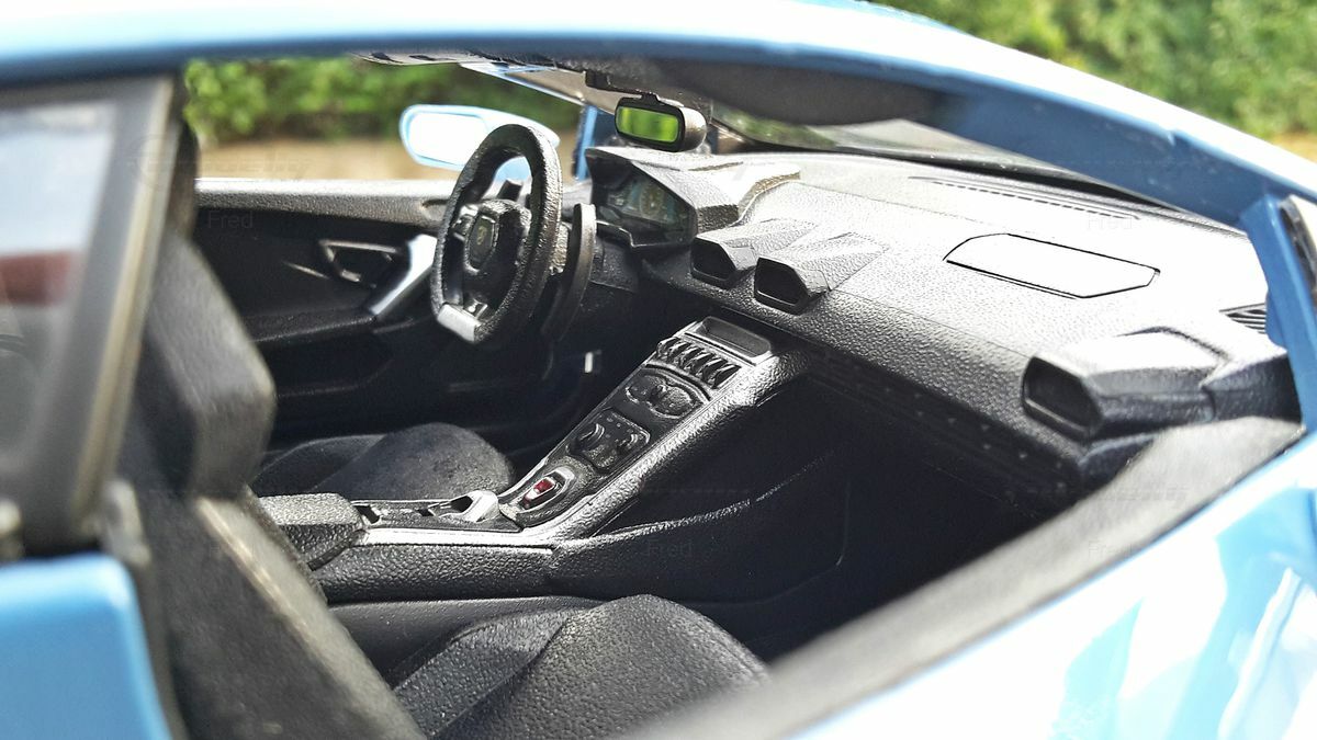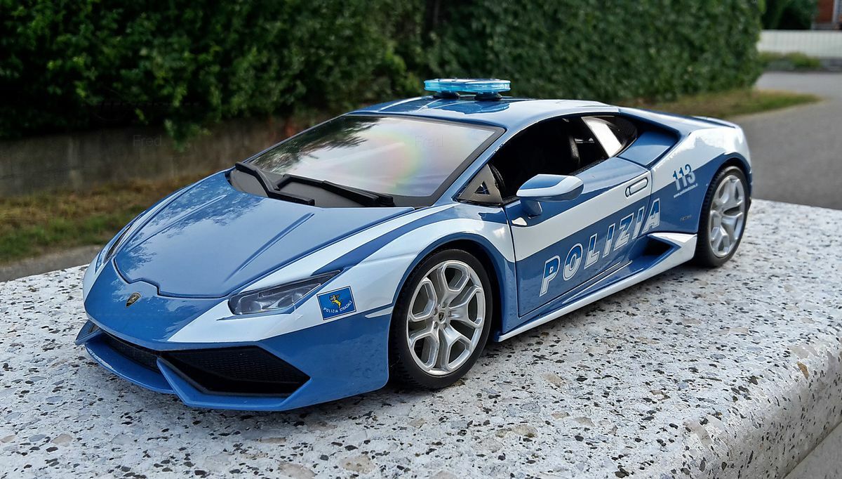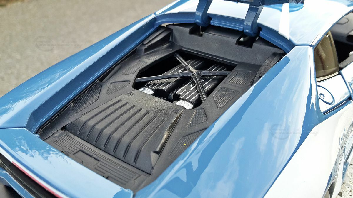 This 1/18 scale model by Bburago is made from die-cast material, giving the model high stability and a realistic weight. The operating comfort and interactive elements, such as opening doors and hoods, add extra authenticity to the miniature model. The vehicle's paint is carefully applied, and the color is very appealing due to its precision and brilliance. Of particular interest to collectors is the special police version of the Lamborghini Huracan LP610-4, which was produced in limited quantities in this form. The deep, rich blue combined with the white accents and the clearly visible "Polizia" emblem make it a unique collector's item that should not be missing from any well-curated model car collection. The realistically designed wheels and the meticulously detailed interior are further highlights of this model.