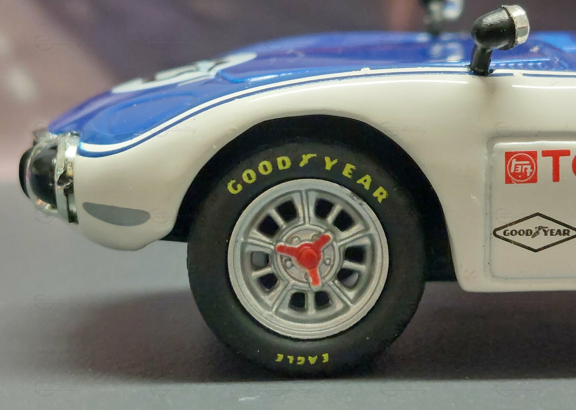 The 1968 SCCA race was a significant stage for the Toyota 2000 GT, and its paint scheme at that time made it notably distinctive. The car was designed in a clear white with blue accents on the hood and sides. Apart from the prominent large black digits "23 CP" on the doors and hood, the iconic Toyota logo was prominently displayed on the side panels. Additionally, sponsors like Goodyear were clearly visible, emphasizing the close collaboration with renowned brands in the motorsport scene. This paint scheme accentuates the shining, clean, and professional appearance of the race car. Every curve and line of the vehicle highlights the sporty and aggressive character of the 2000 GT.