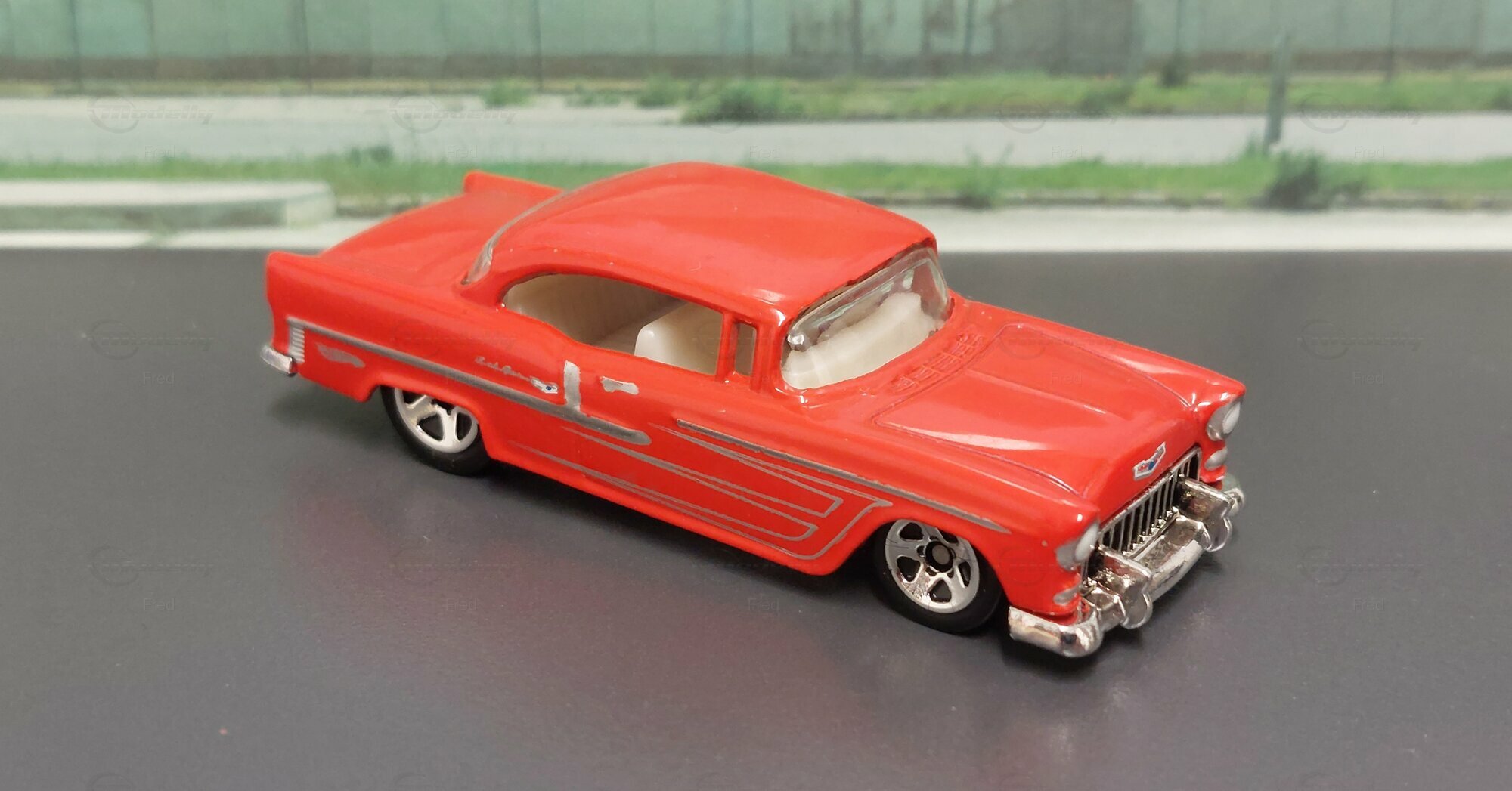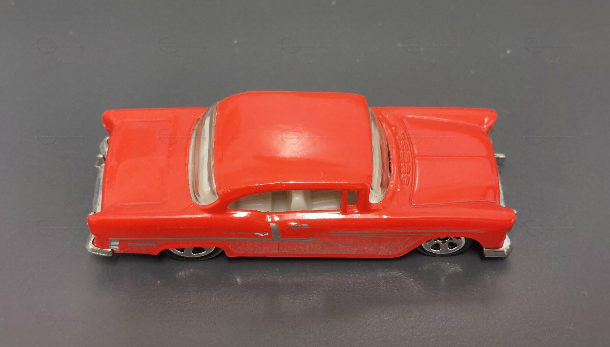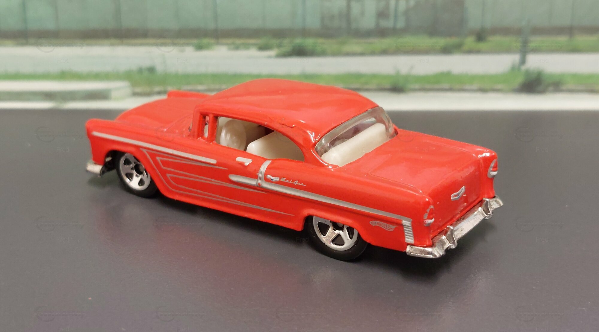 The car model shown here is made by Hot Wheels and is a beautifully detailed piece in a 1/64 scale. It's made of diecast material, which means it’s solid and super precise. Part of the collection belonging to model enthusiast "Fred," this ride sports a bright red paint job with shiny silver accents that perfectly capture the distinctive lines of the original. The detailed chrome front end with the iconic Chevy emblem and the rear decoration featuring the classic Bel Air logo really stand out. Plus, thanks to the clear windows, you can see the white interior. The seats and dashboard are stylized but still reminiscent of the vintage original.