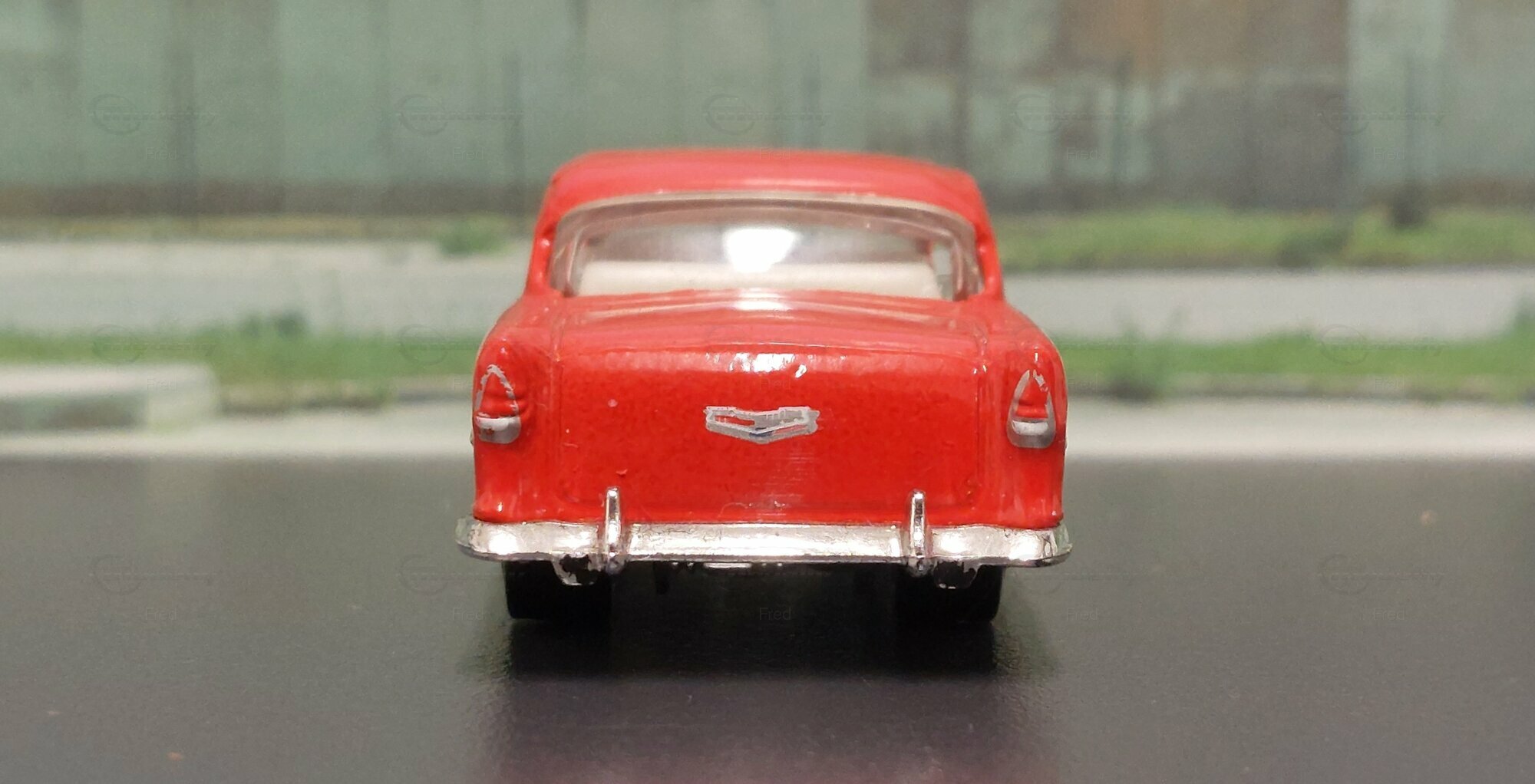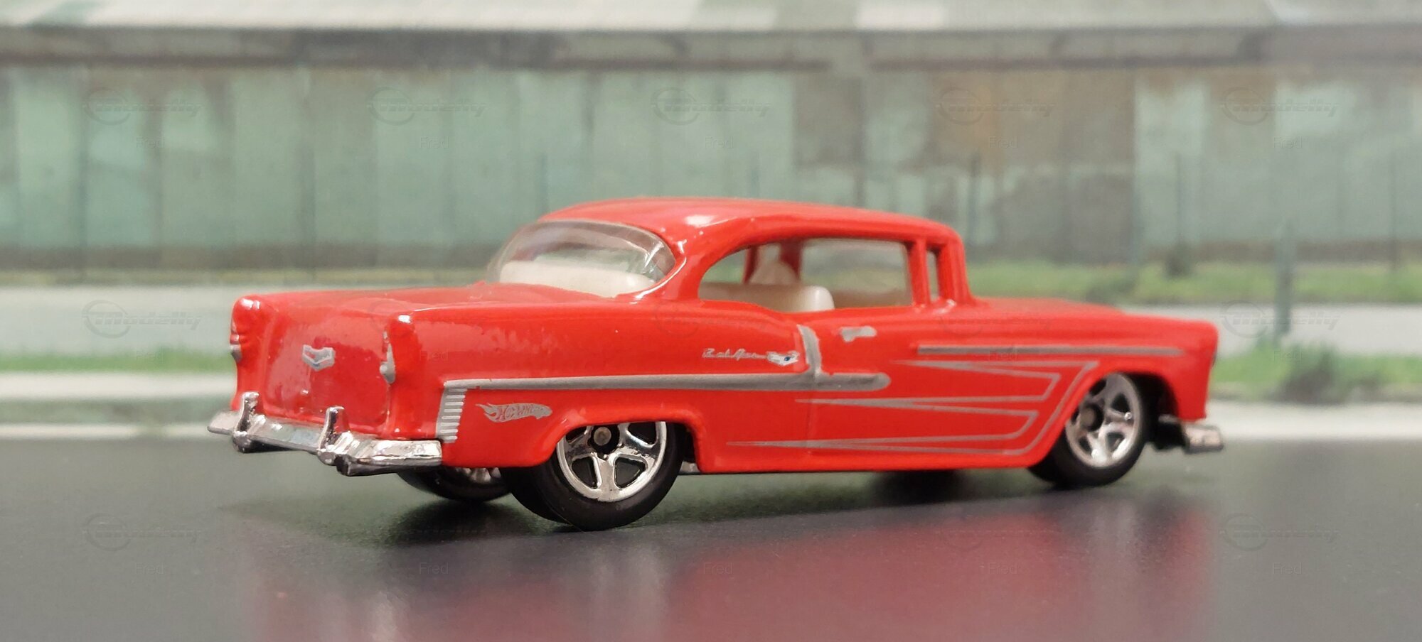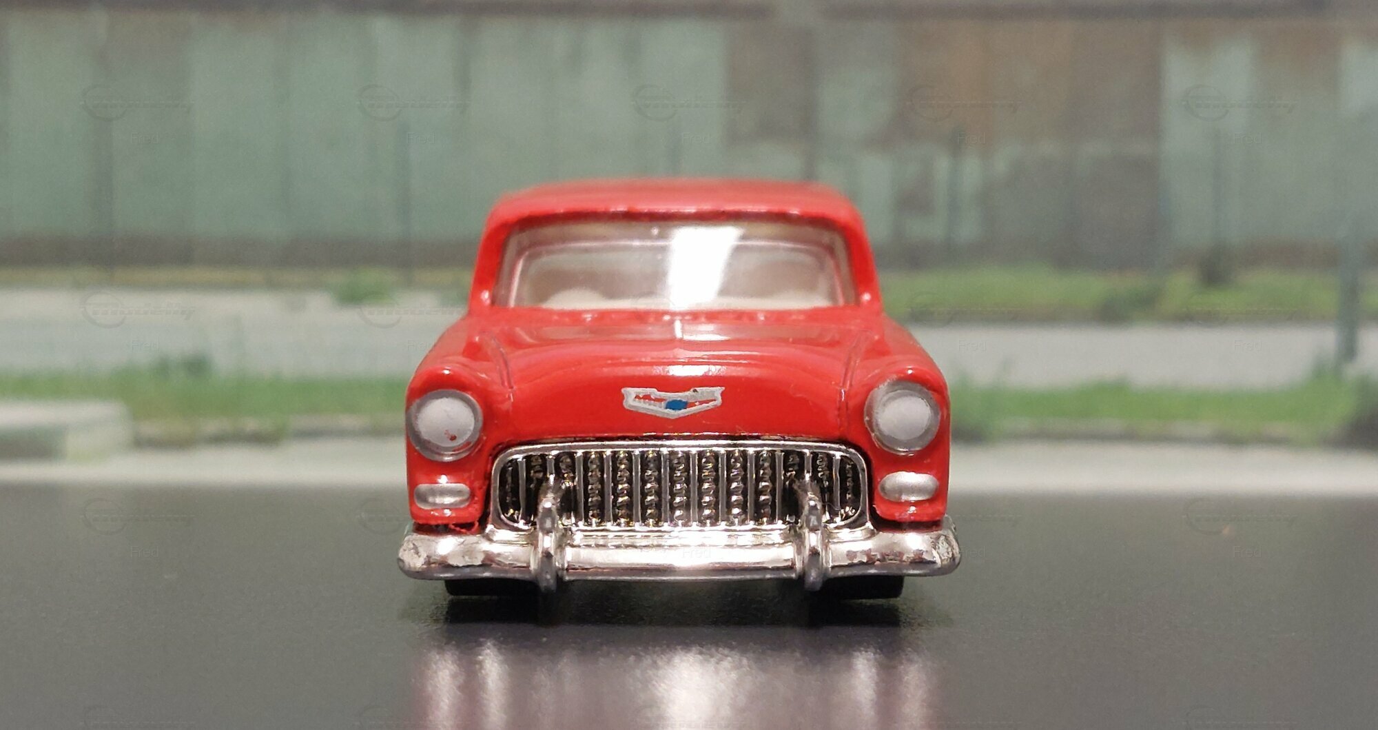 The car model shown here is made by Hot Wheels and is a beautifully detailed piece in a 1/64 scale. It's made of diecast material, which means it’s solid and super precise. Part of the collection belonging to model enthusiast "Fred," this ride sports a bright red paint job with shiny silver accents that perfectly capture the distinctive lines of the original. The detailed chrome front end with the iconic Chevy emblem and the rear decoration featuring the classic Bel Air logo really stand out. Plus, thanks to the clear windows, you can see the white interior. The seats and dashboard are stylized but still reminiscent of the vintage original.