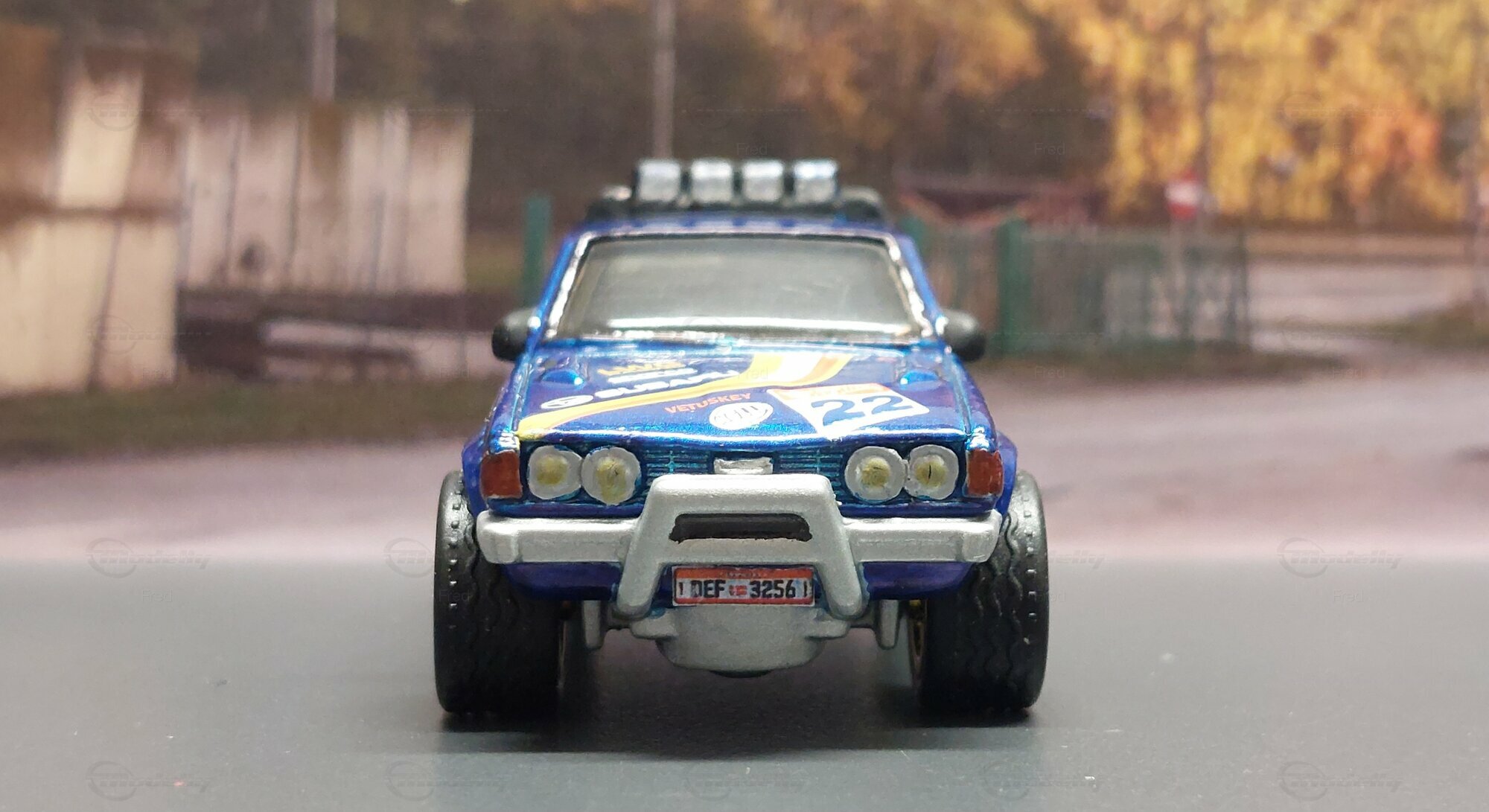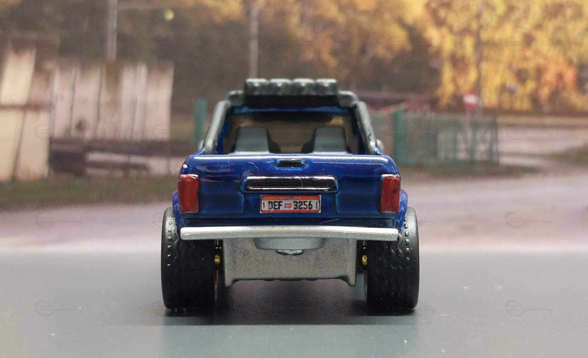 The beauty of the 1/64 model by Hot Wheels lies in the fine details that perfectly capture the essence of the Subaru BRAT. The glittering blue paint is adorned with white and orange stripes, giving the model a racing flair. The front view displays a compact yet rugged appearance with a chromed bumper and four headlights, providing the vehicle with a distinctive look. The roof rack with additional lights underscores its suitability as an off-road vehicle. These small accents demonstrate the precision and attention to detail put into these models, found on collectors' shelves worldwide.