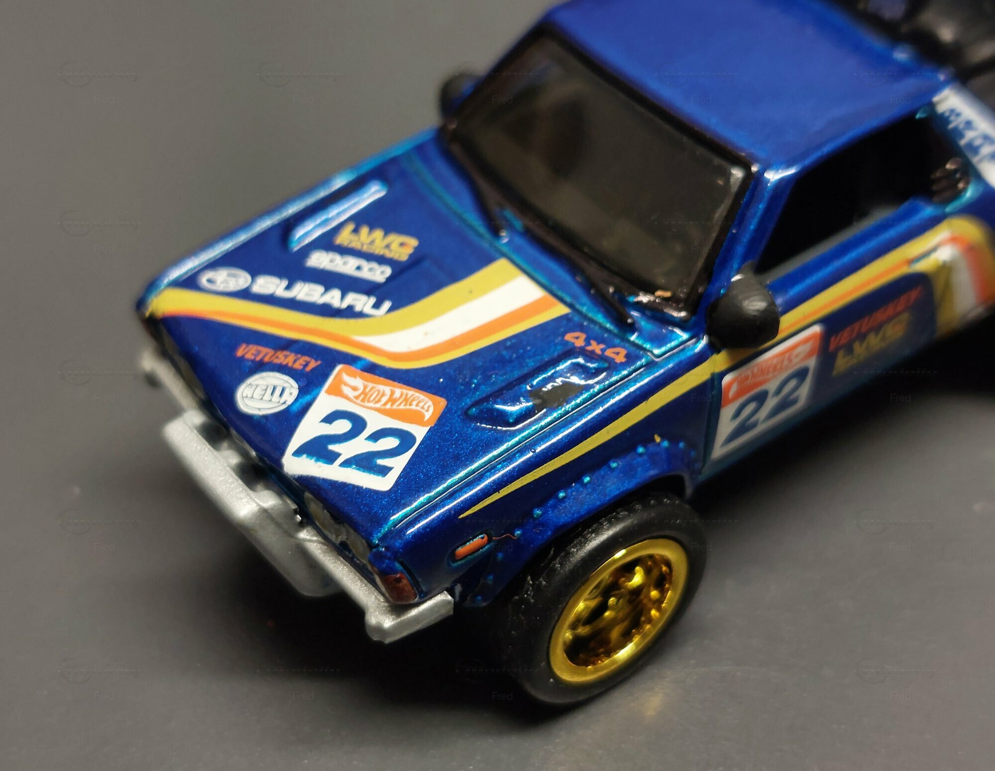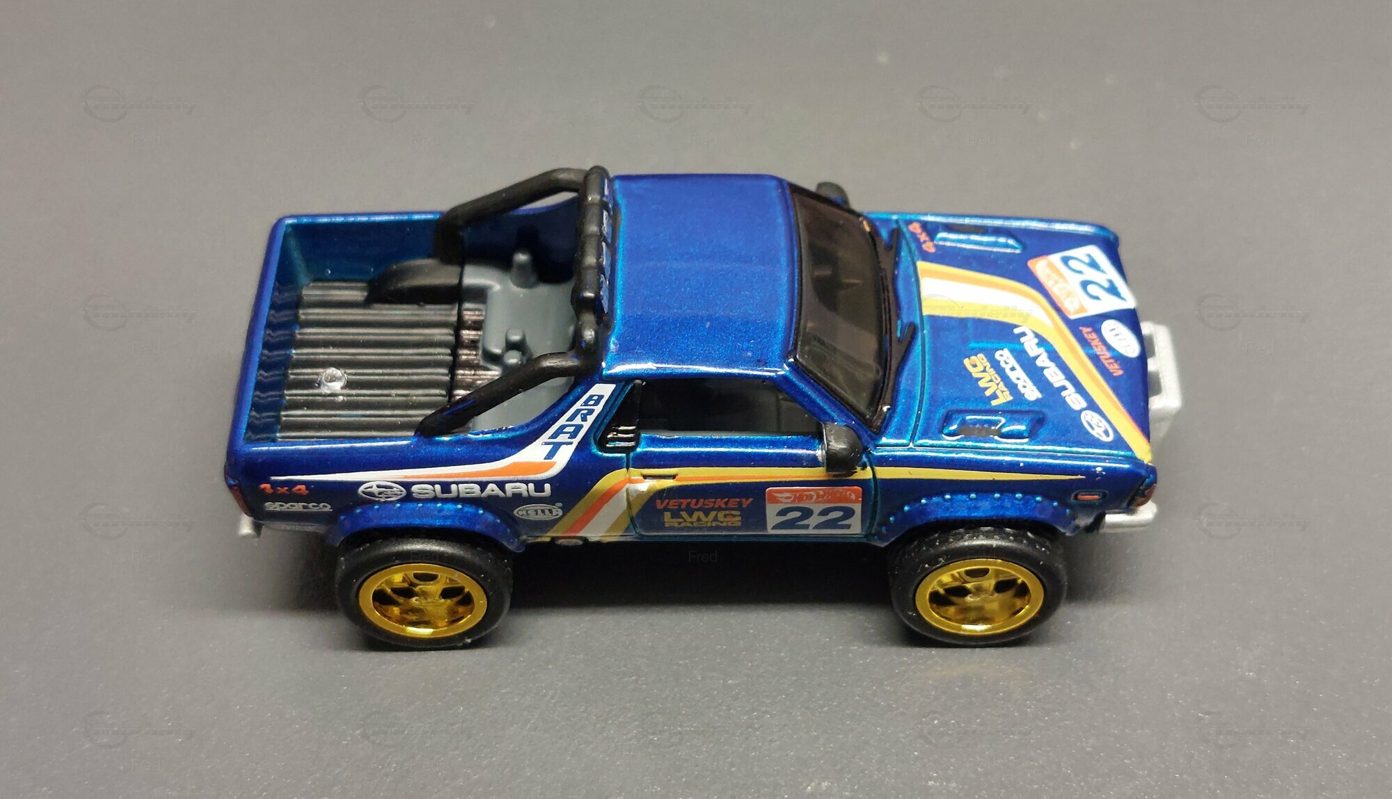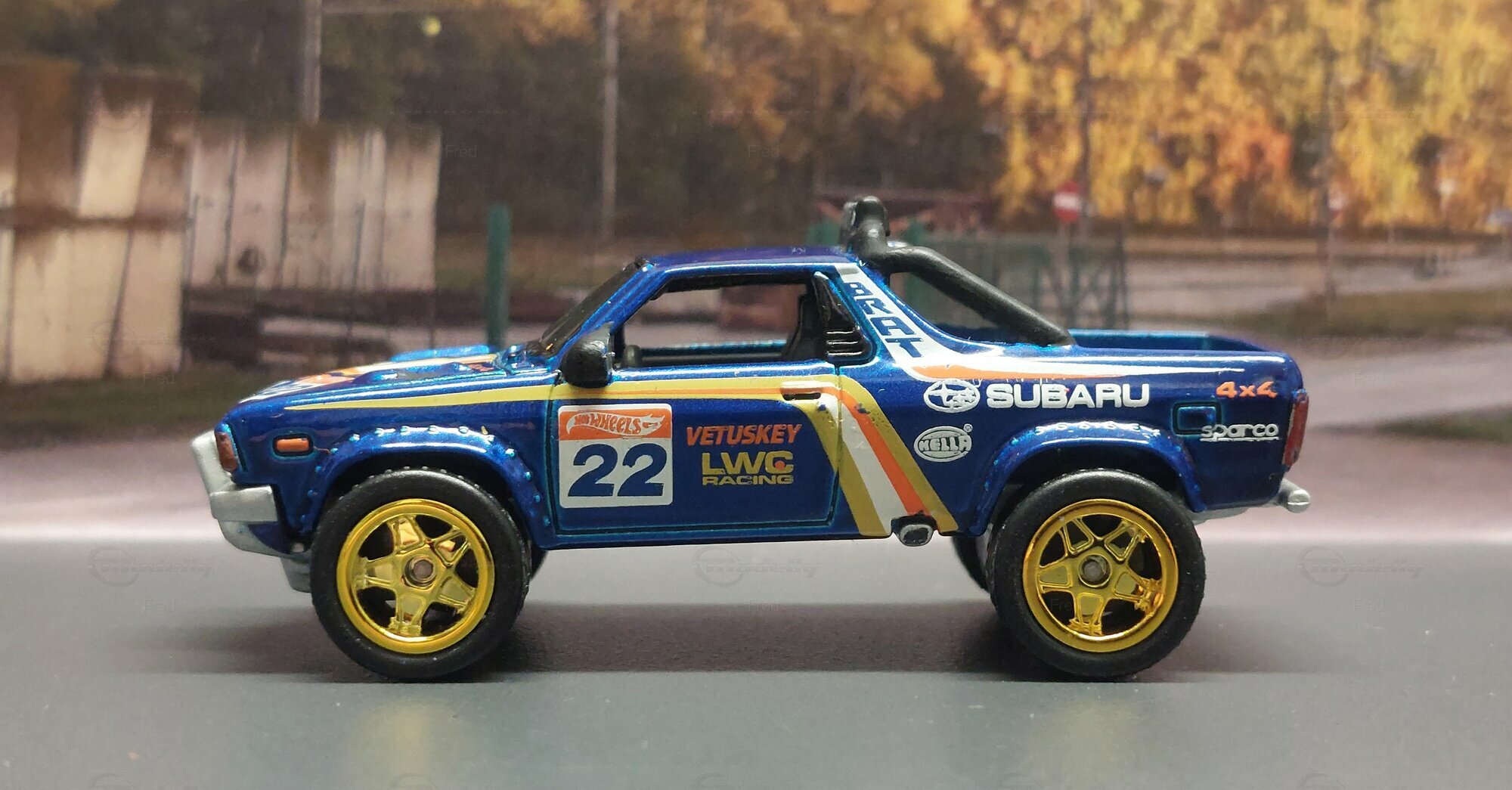 The depicted wheels may not be conclusively identified at first glance, but they seamlessly complement the sporty overall look of this model vehicle. Additionally, noticeable rally lights on the front bumper emphasize the adventurous character of the Subaru BRAT. Fred, a member on Modelly, has added this model to his collection, serving as a splendid example of the attention to detail that Hot Wheels puts into their models.