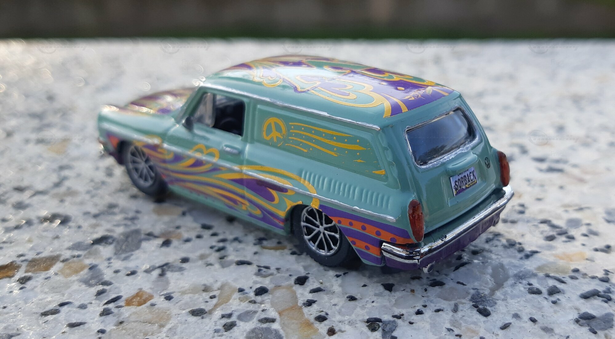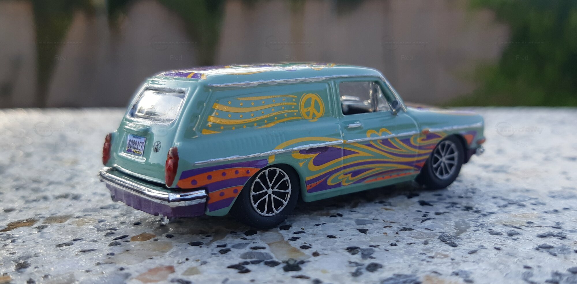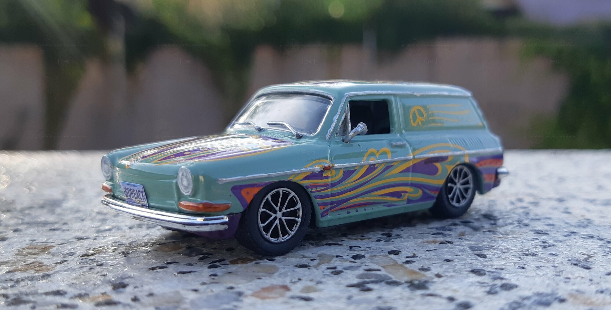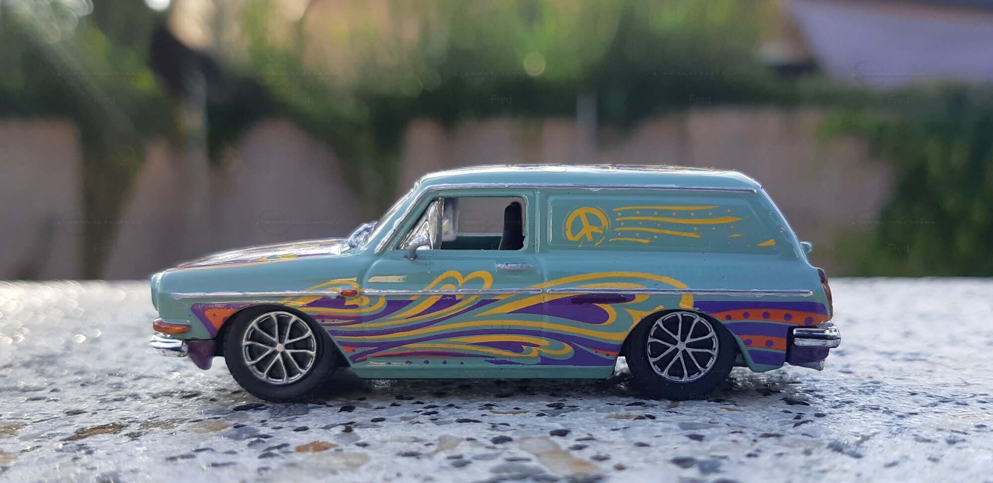 Here we have a modified 1/64 scale miniature of the Volkswagen 1600 Variant produced by Hot Wheels. The miniature is made of Diecast material. It’s worth mentioning that this model does not represent the original product released by Hot Wheels but a customized version. This specific example from Fred's Modelly collection showcases a post-painted psychedelic design, reminiscent of the colorful culture of the 60s. The model's striking exterior exudes a sense of nostalgia while combining historical accuracy with a touch of artistic freedom.
