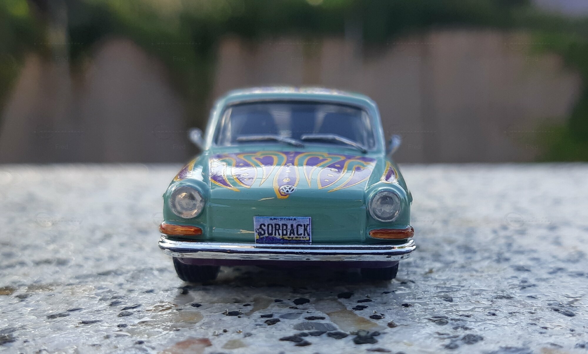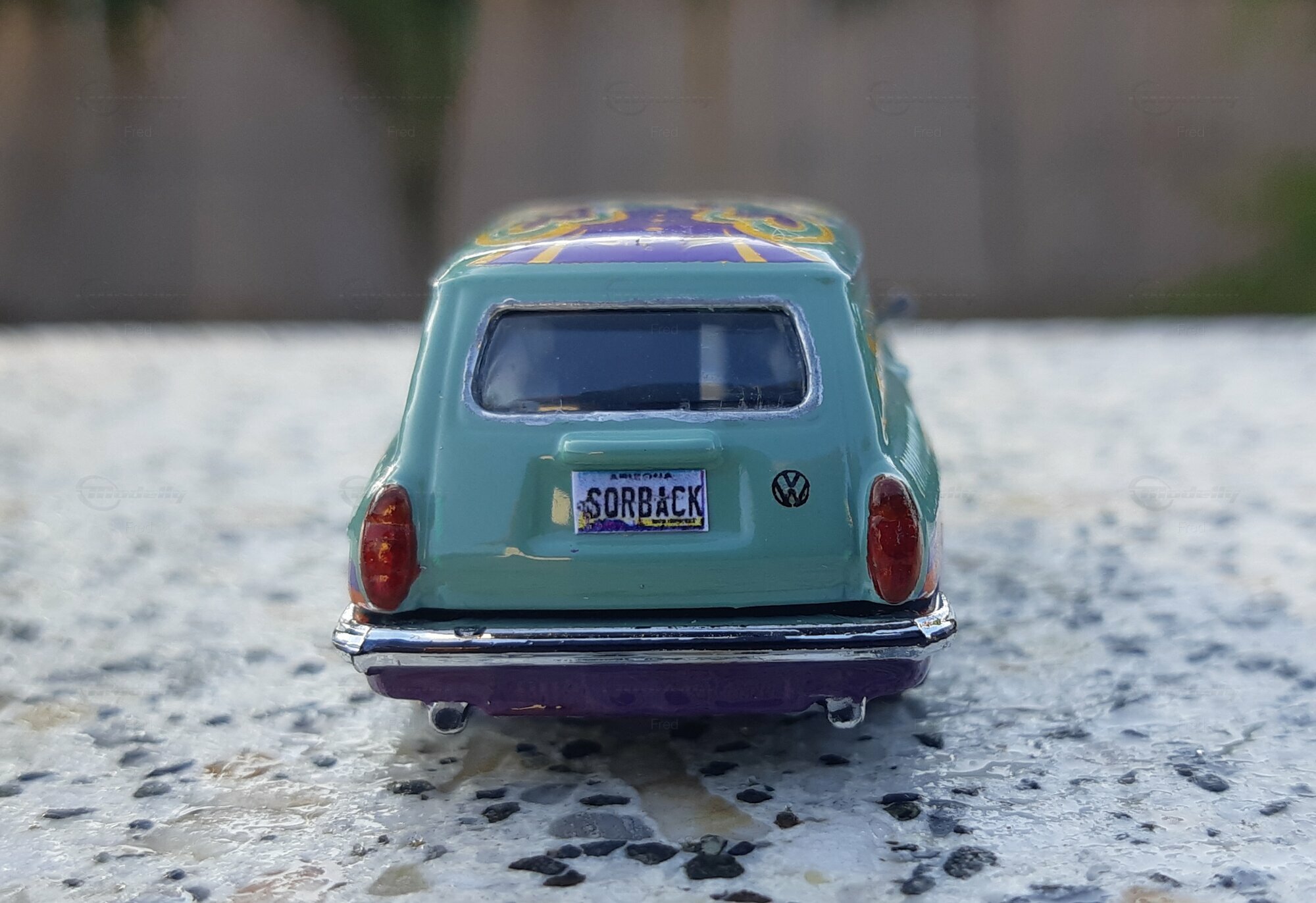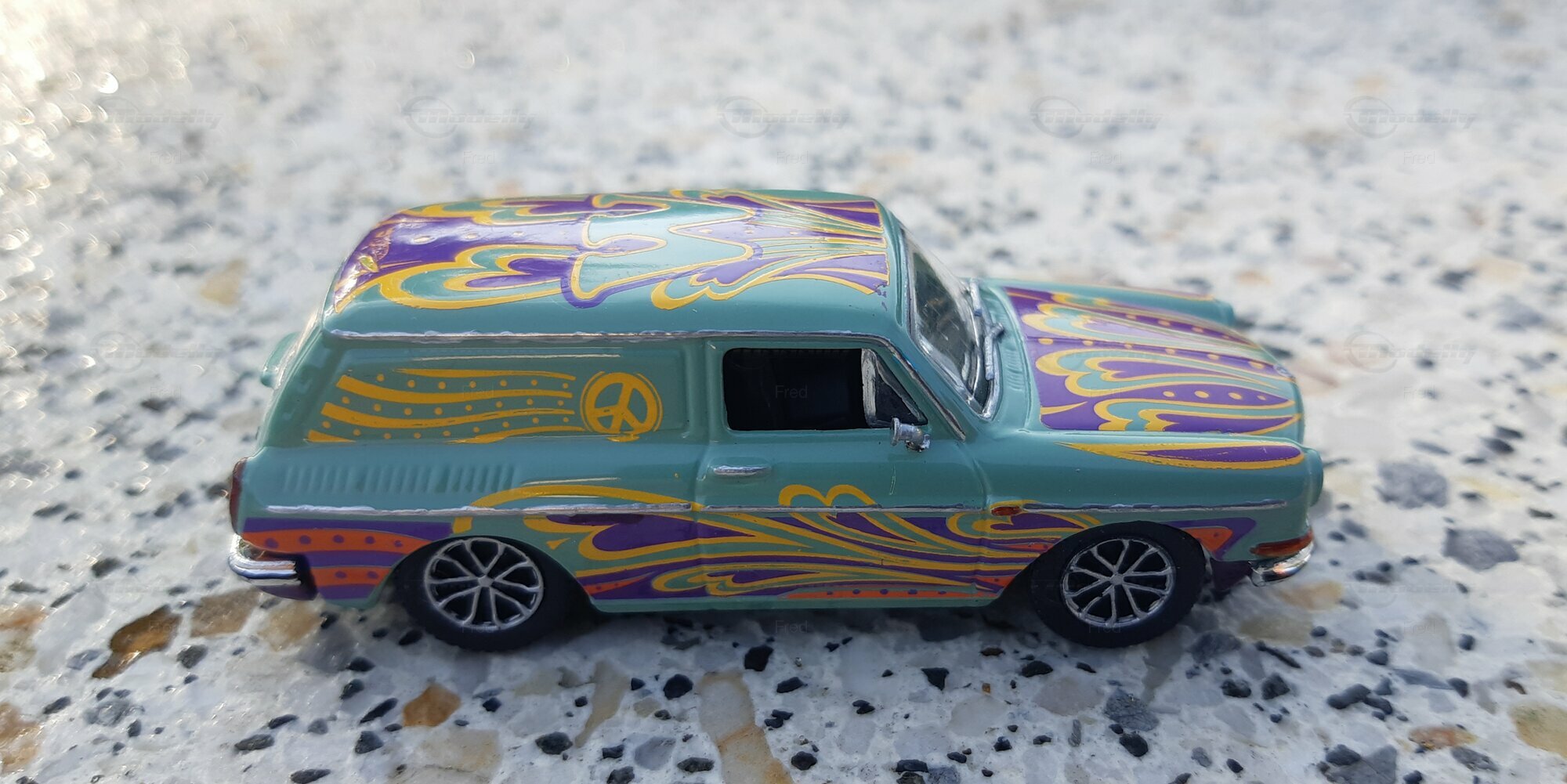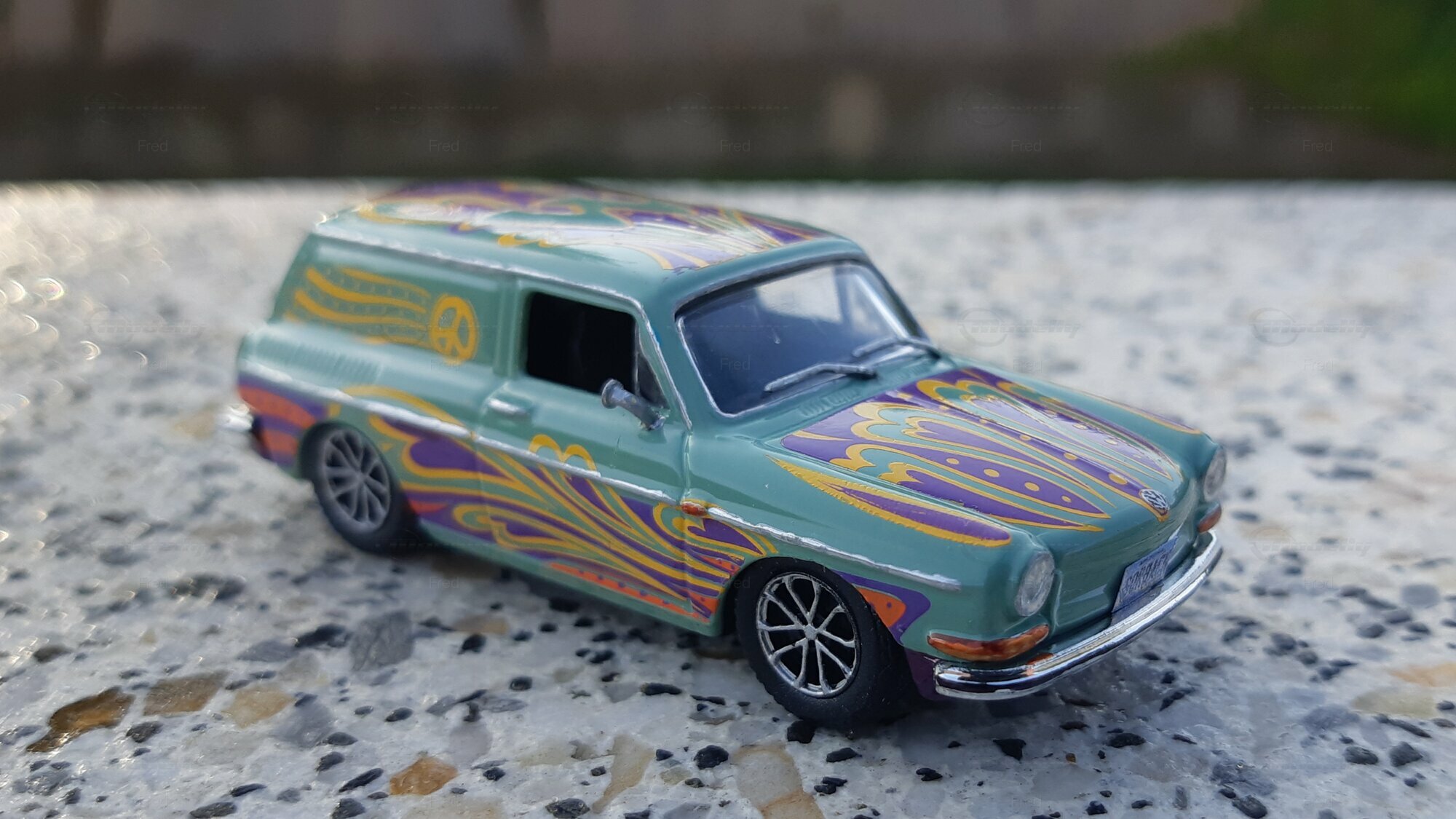Here we have a modified 1/64 scale miniature of the Volkswagen 1600 Variant produced by Hot Wheels. The miniature is made of Diecast material. It’s worth mentioning that this model does not represent the original product released by Hot Wheels but a customized version. This specific example from Fred's Modelly collection showcases a post-painted psychedelic design, reminiscent of the colorful culture of the 60s. The model's striking exterior exudes a sense of nostalgia while combining historical accuracy with a touch of artistic freedom.