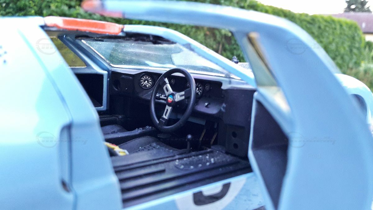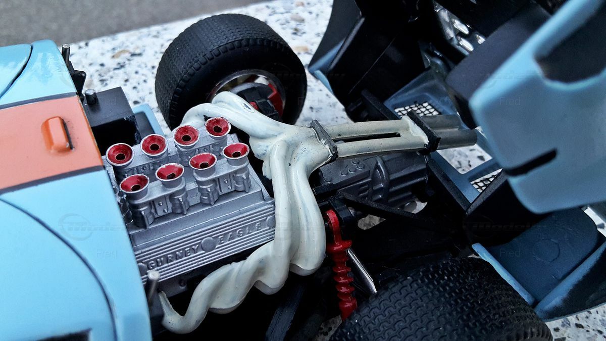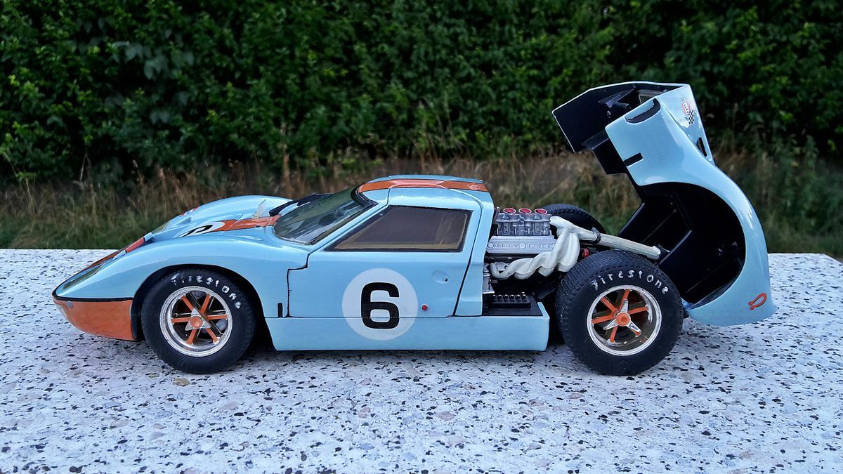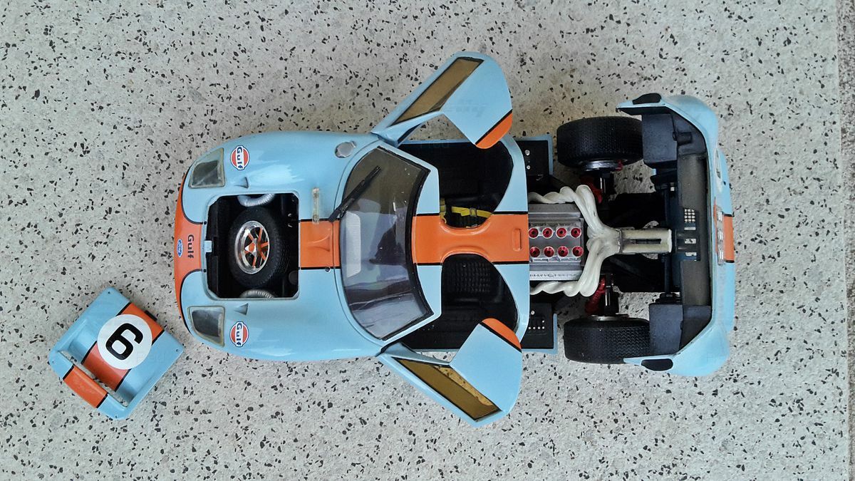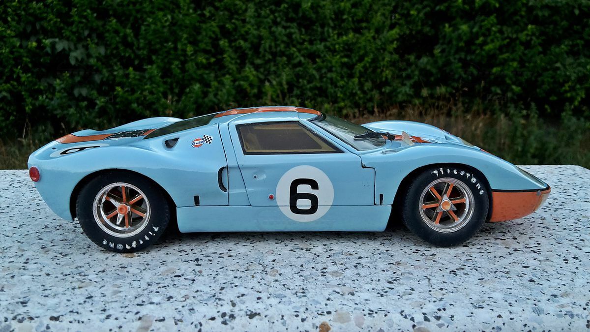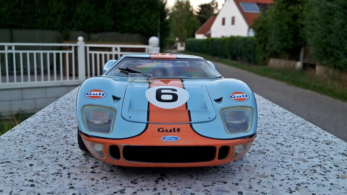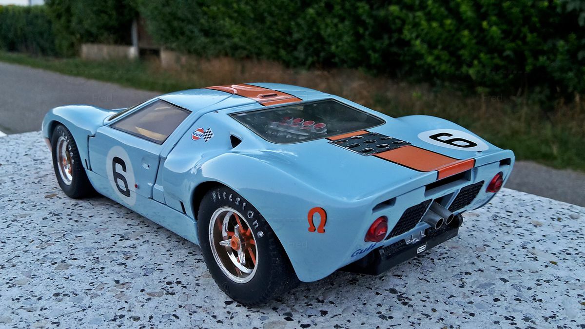 In the numerous photos, the attention to detail of this modified 1/18 scale model of the Ford GT40 is evident. The striking paint job in the Gulf colors of sky blue and orange, with race number 6 and prominent sponsor logos of Gulf and Firestone, immediately catches the eye. The shapes and contours of the vehicle are faithfully replicated, including the ventilation slits and engine cover. The wheels and tires have realistic rubber surfaces with markings, enhancing the authentic look further. Every detail of this model, from the headlights to the rear end, has been meticulously recreated to capture the essence of the original as best as possible.