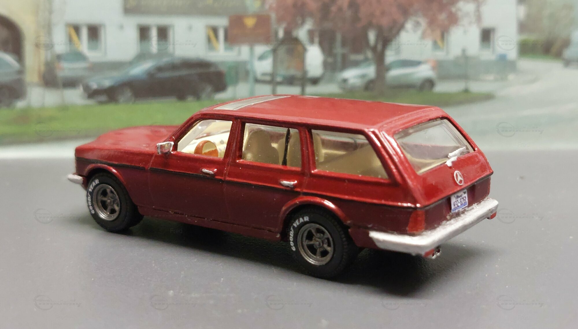 The model car shown here in 1/64 scale was manufactured by Matchbox and is based on the Mercedes-Benz T-Model (W123). However, it is a modified model that does not represent the original product produced by Matchbox. This model is made of diecast material and was added to the collection of Modelly member "Fred". A special feature of this model is the Goodyear tires, which are clearly visible in the pictures and add an extra level of authenticity to the vehicle. The miniature model in its modified form features a striking deep red paint job, with various attachments that mimic the original.
