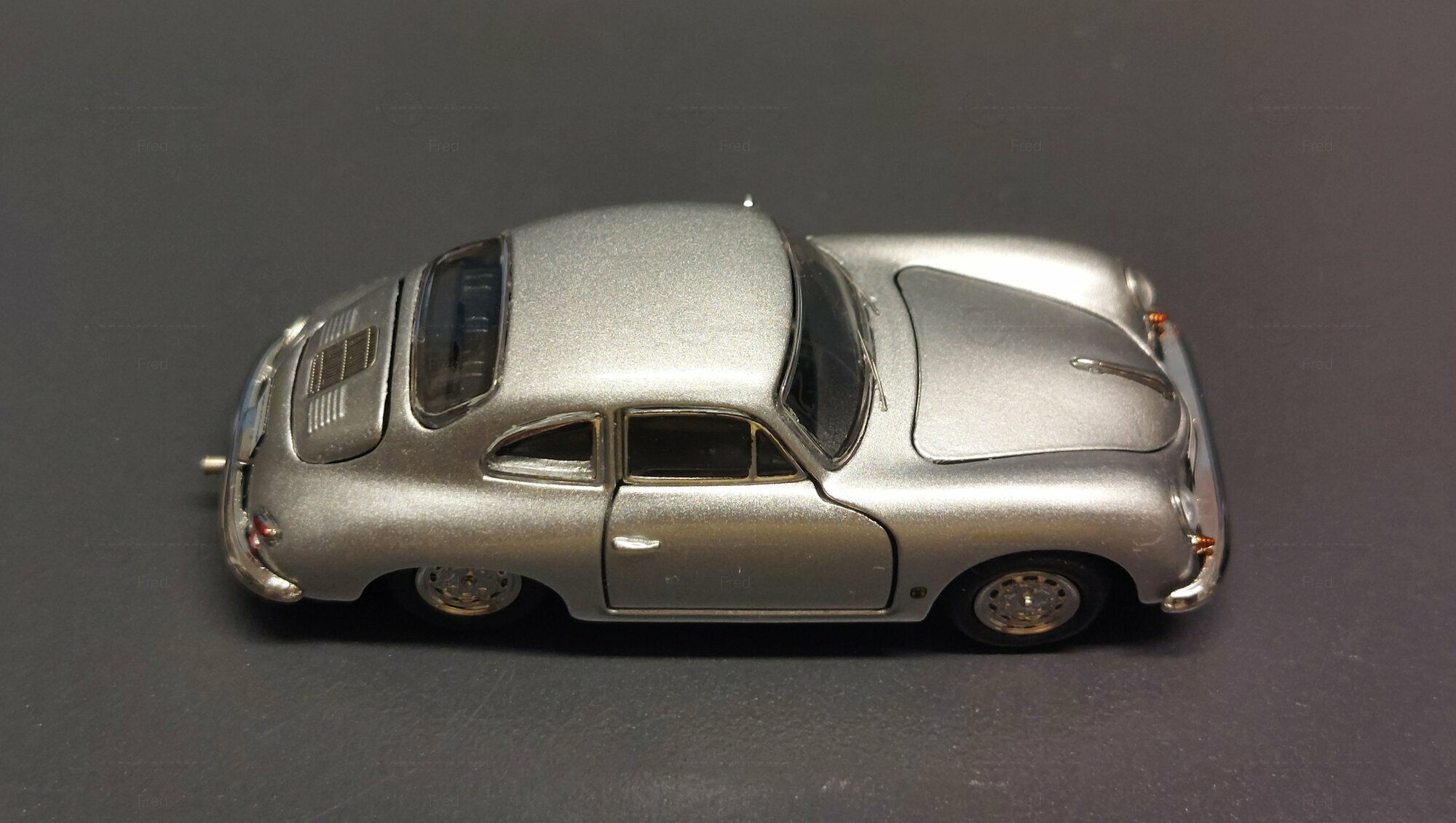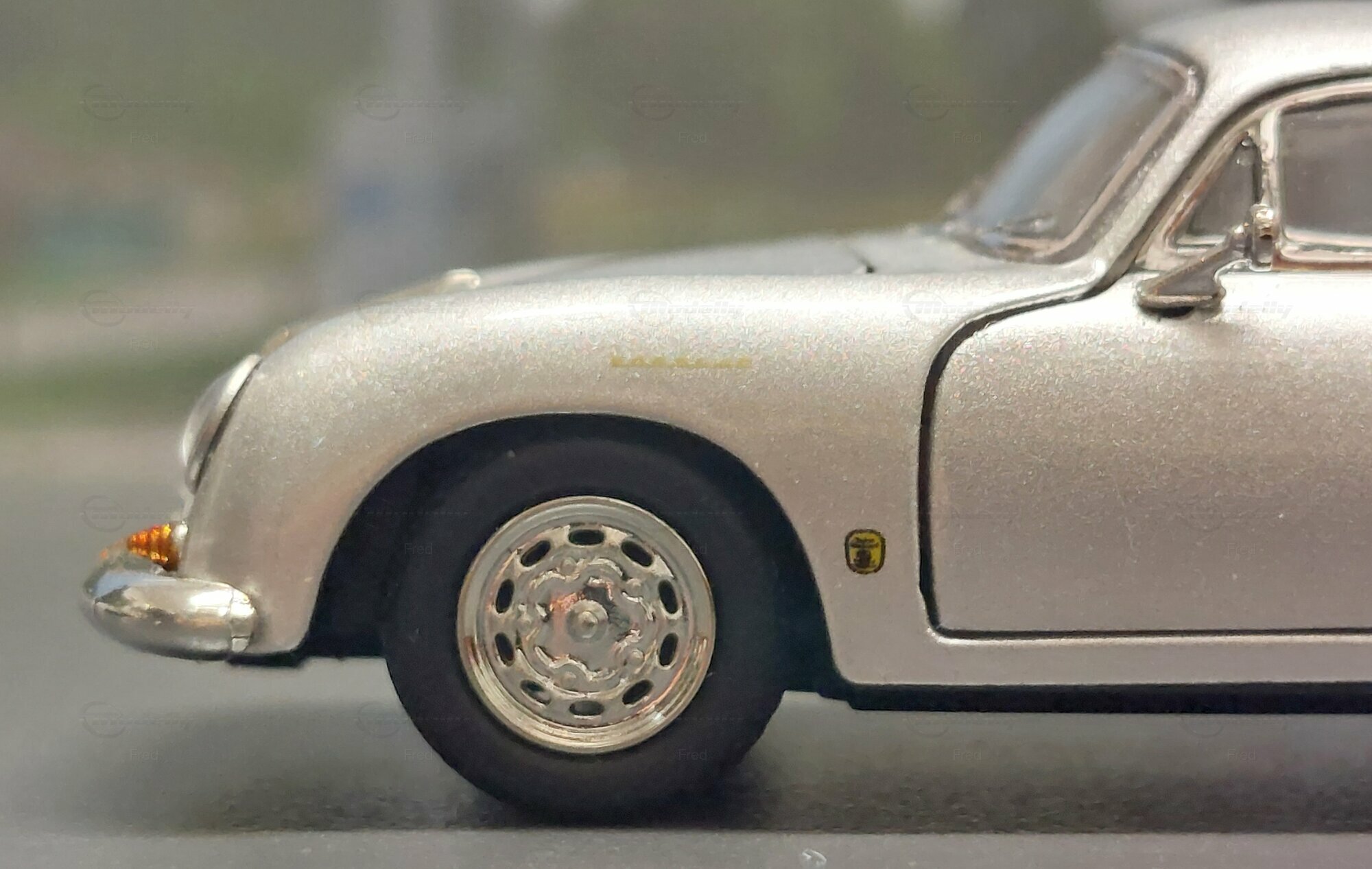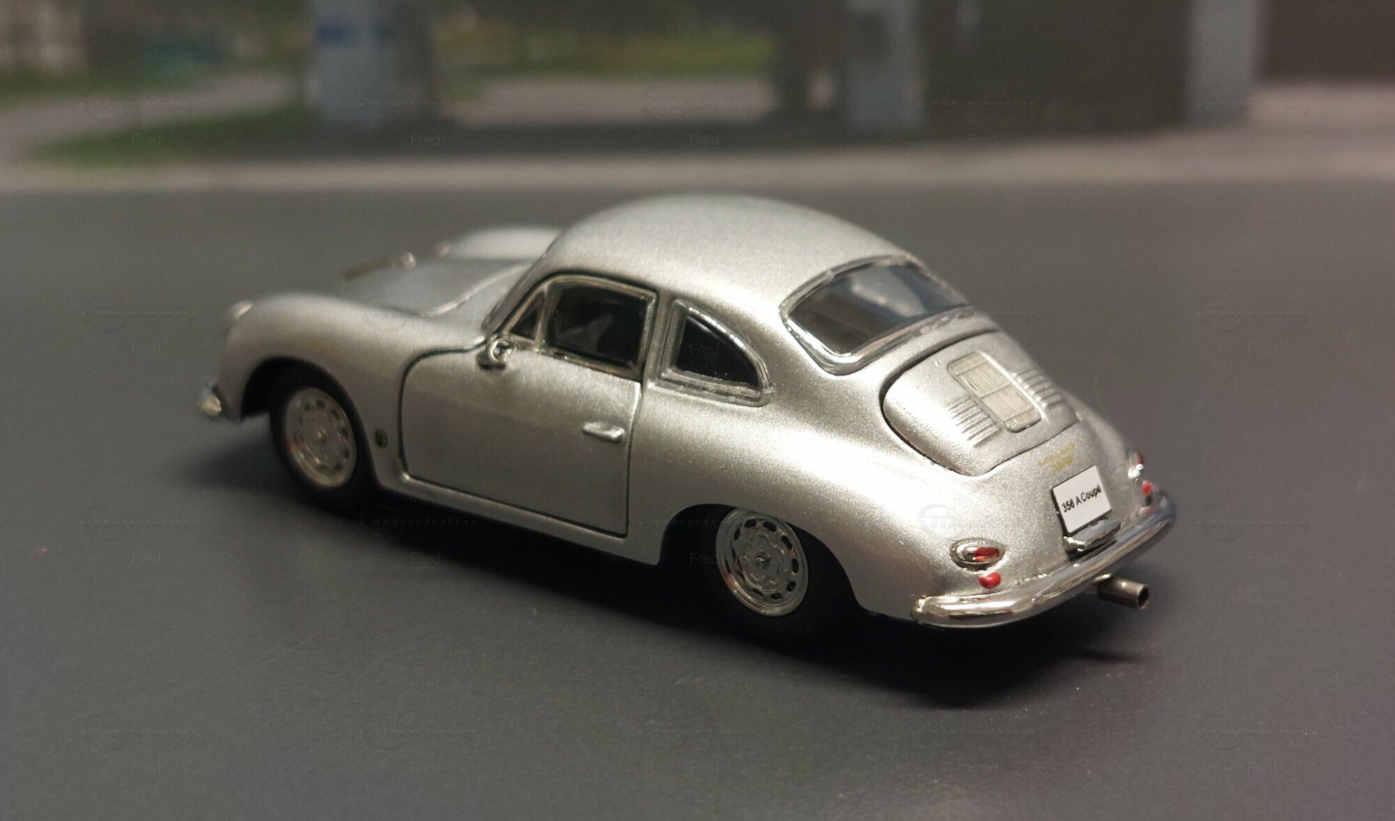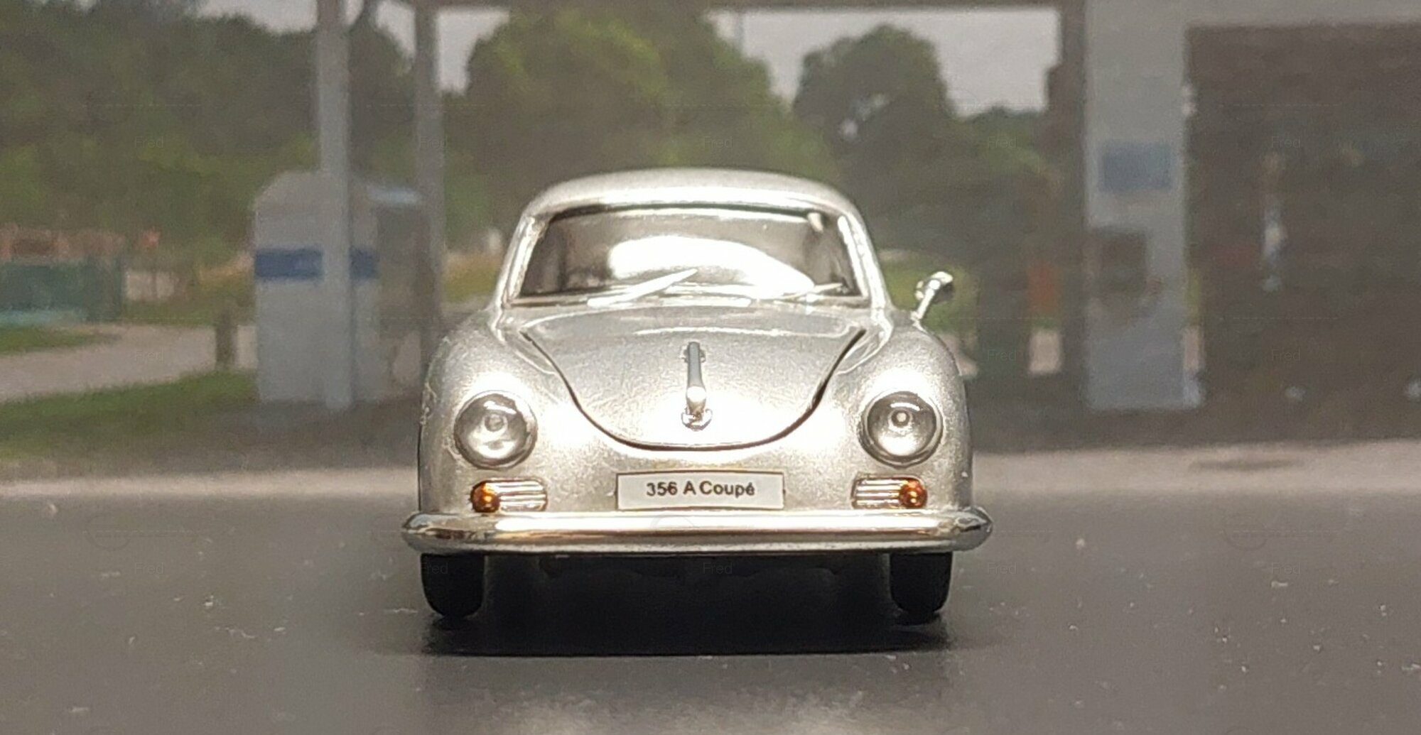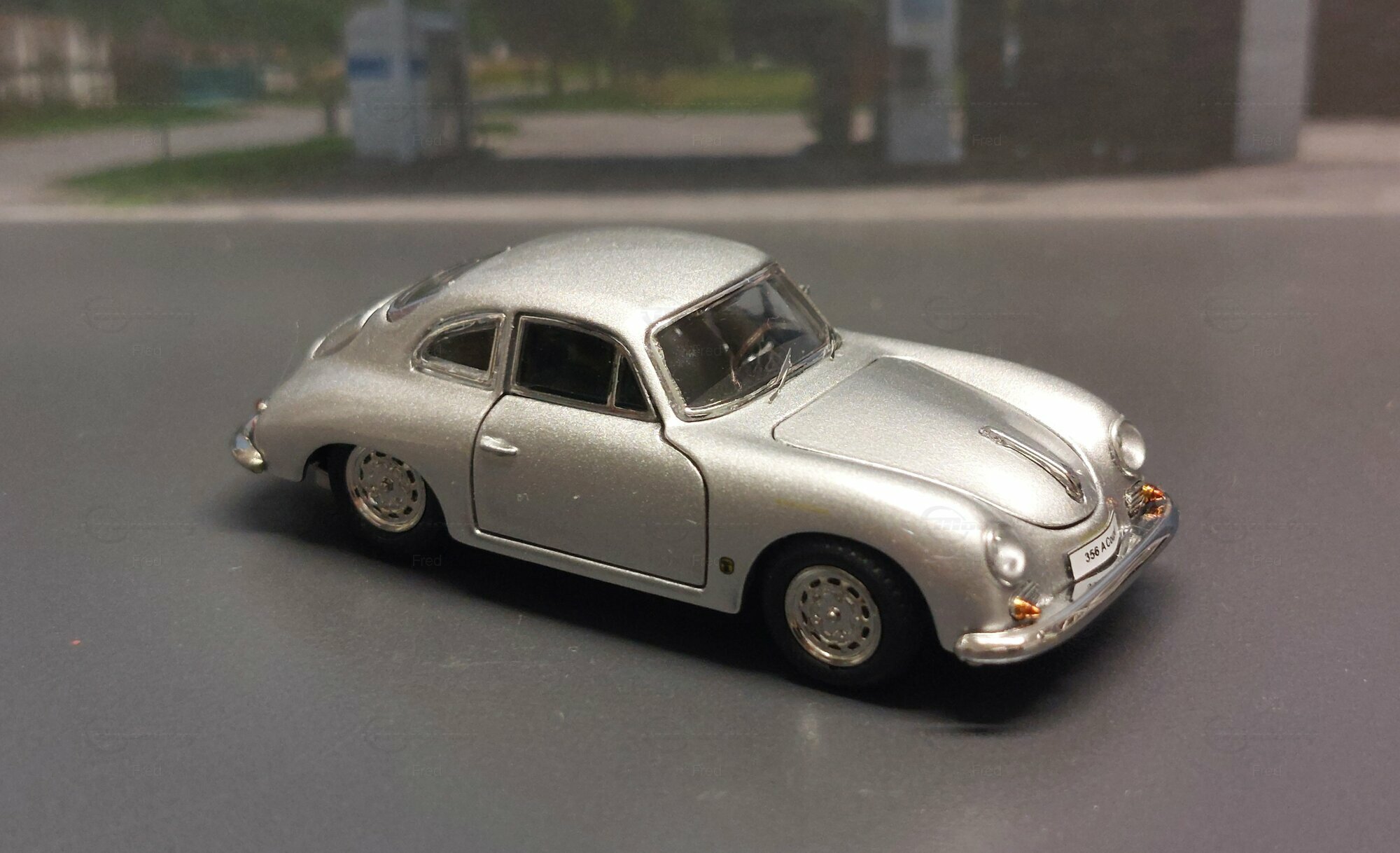 The model car shown here in 1/64 scale was manufactured by Peako and is a detailed replica of the Porsche 356 A Coupe. This model is made of high-quality die-cast material, giving it a sturdy and premium feel. It is a limited edition, with only 999 units produced worldwide. This particular model is part of the collection of Modelly member "Fred". The model showcases the Porsche 356 A in a silver finish, capturing the classic style and elegant look of the original. The proportions and details such as the round headlights, bumper shape, and curved fenders are accurately depicted.