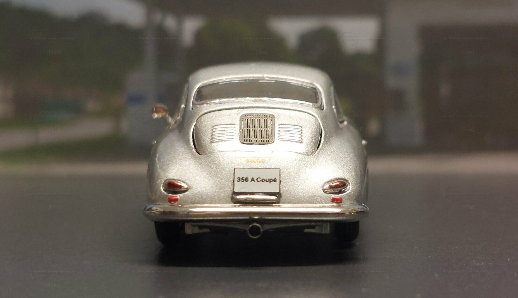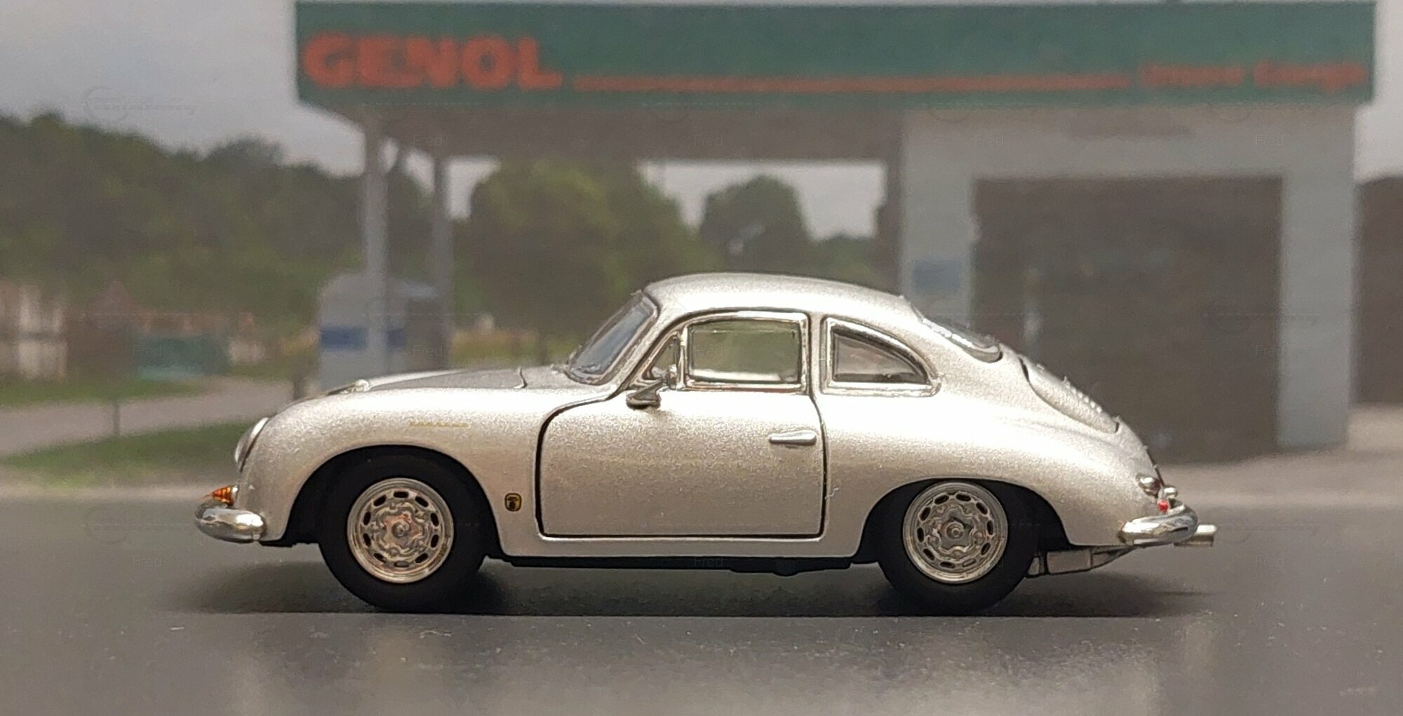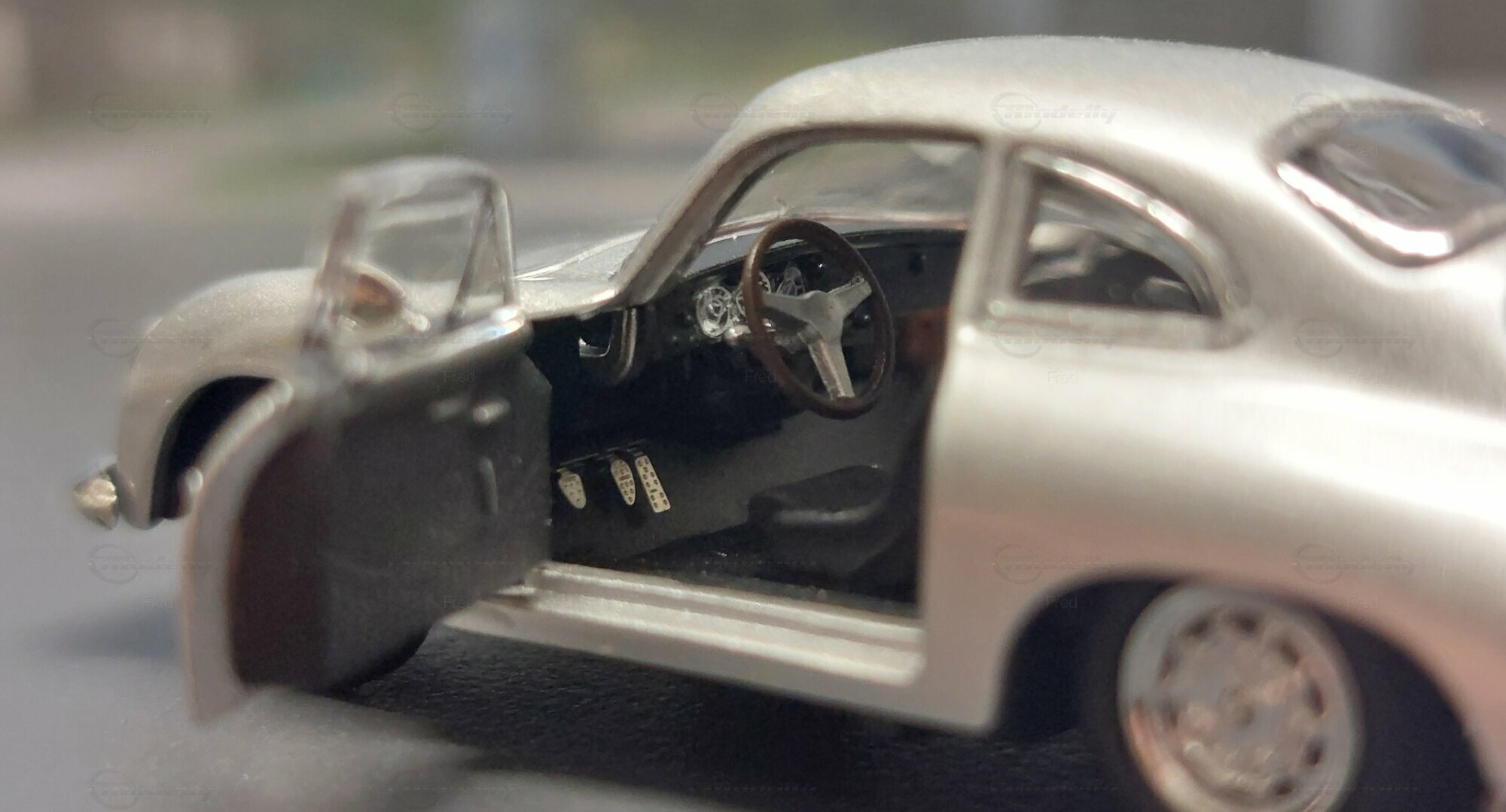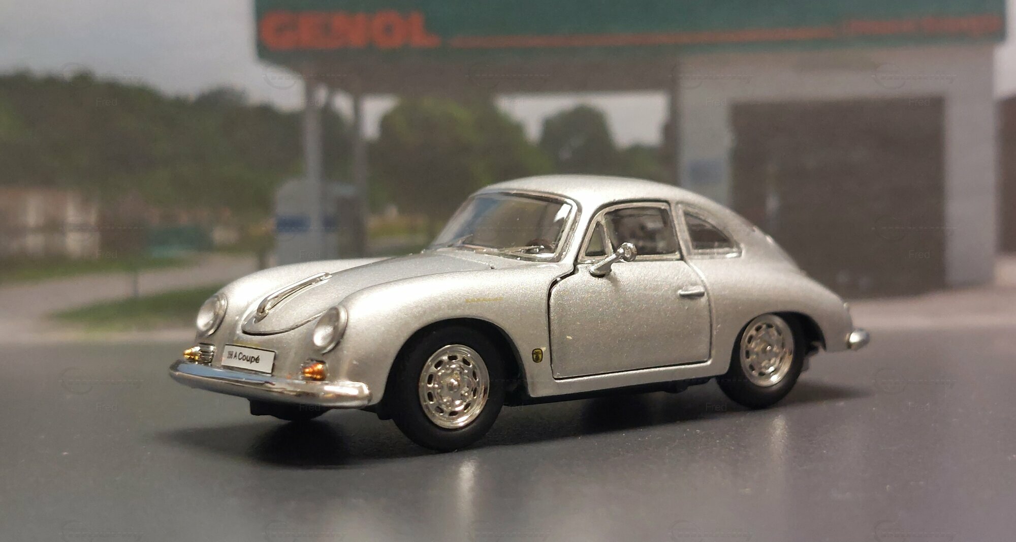 The model car shown here in 1/64 scale was manufactured by Peako and is a detailed replica of the Porsche 356 A Coupe. This model is made of high-quality die-cast material, giving it a sturdy and premium feel. It is a limited edition, with only 999 units produced worldwide. This particular model is part of the collection of Modelly member "Fred". The model showcases the Porsche 356 A in a silver finish, capturing the classic style and elegant look of the original. The proportions and details such as the round headlights, bumper shape, and curved fenders are accurately depicted.