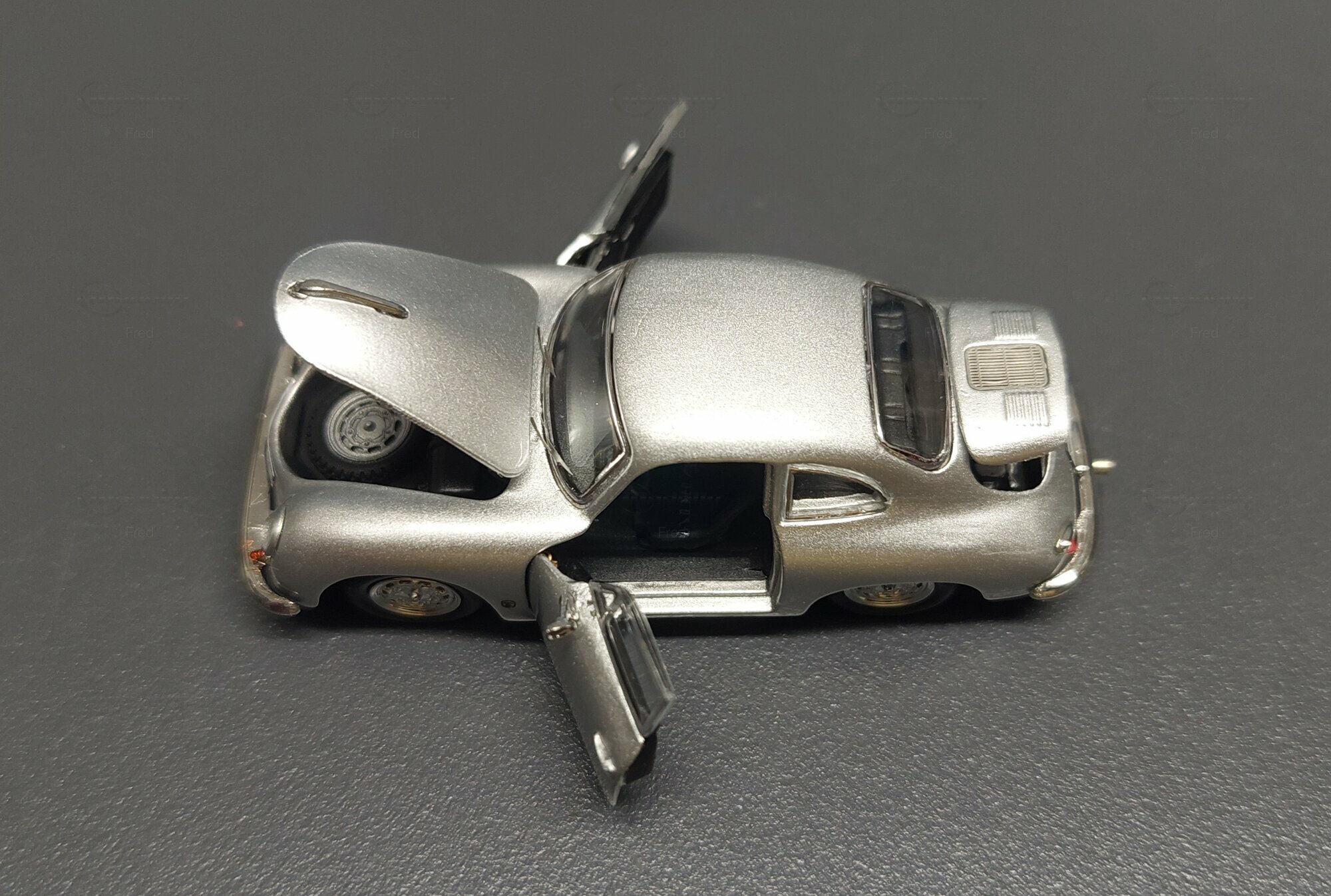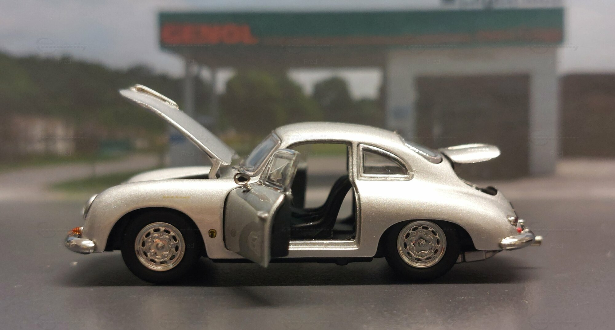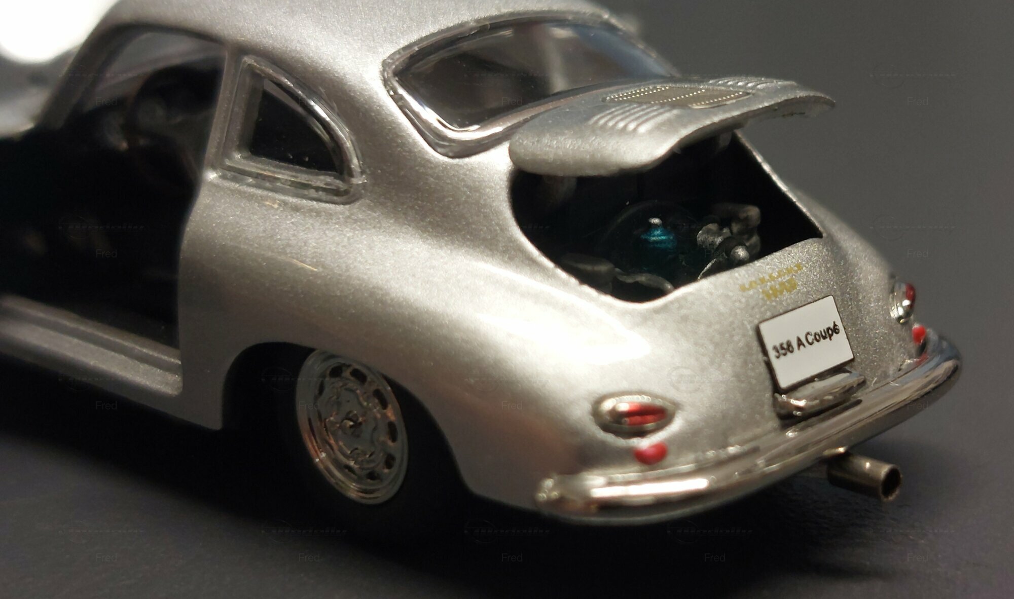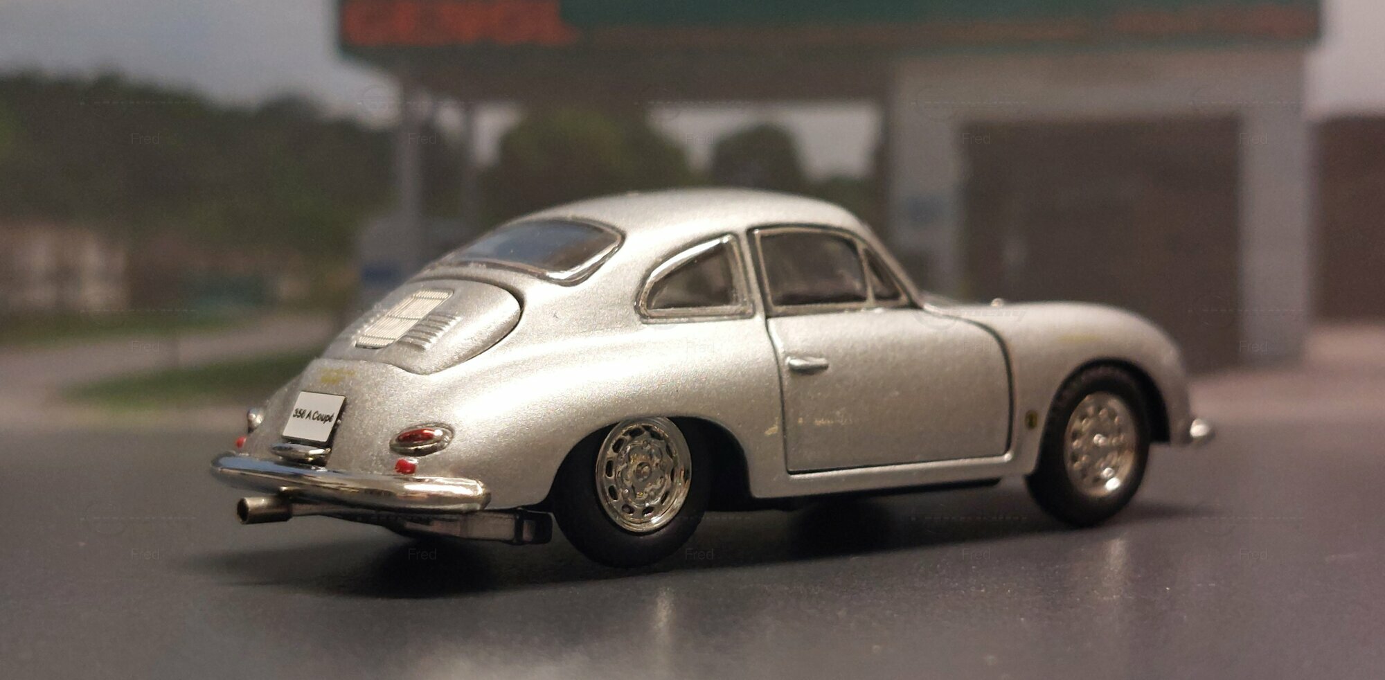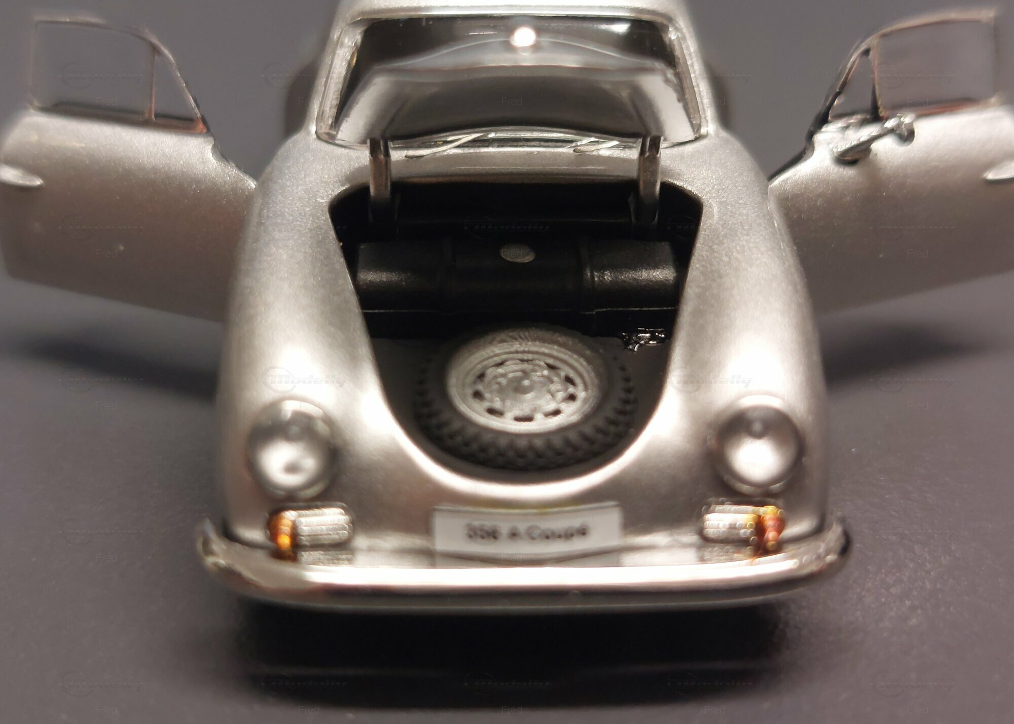The model car shown here in 1/64 scale was manufactured by Peako and is a detailed replica of the Porsche 356 A Coupe. This model is made of high-quality die-cast material, giving it a sturdy and premium feel. It is a limited edition, with only 999 units produced worldwide. This particular model is part of the collection of Modelly member "Fred". The model showcases the Porsche 356 A in a silver finish, capturing the classic style and elegant look of the original. The proportions and details such as the round headlights, bumper shape, and curved fenders are accurately depicted.