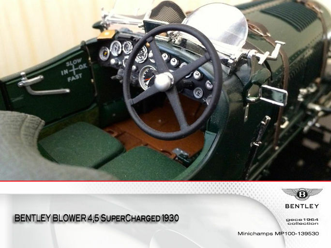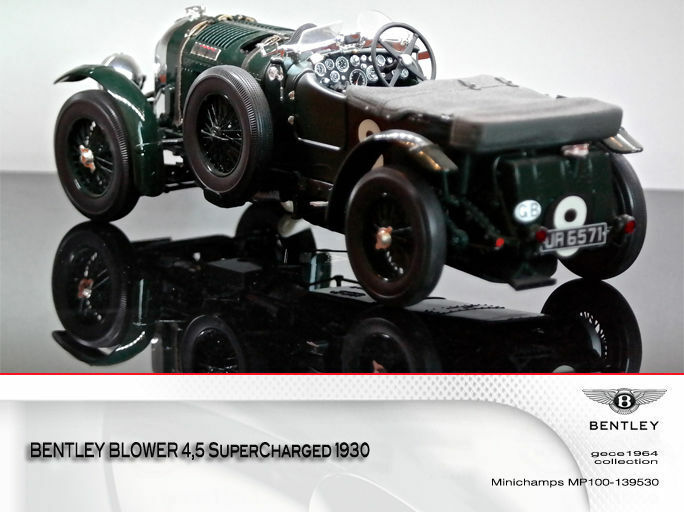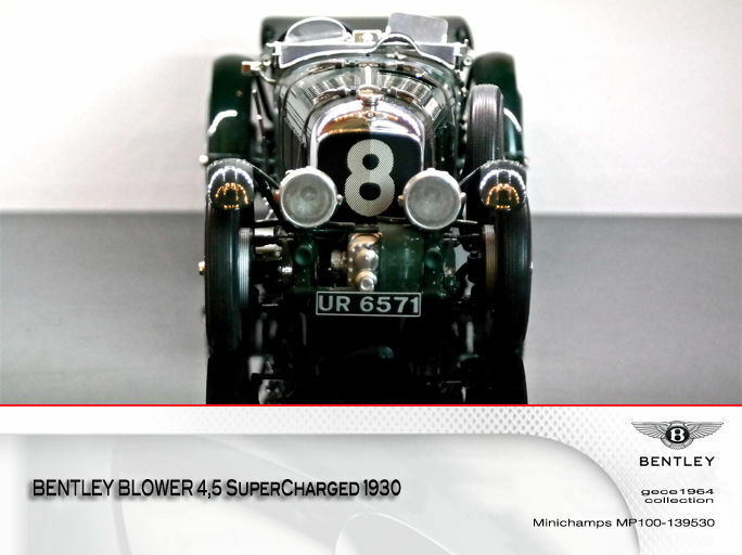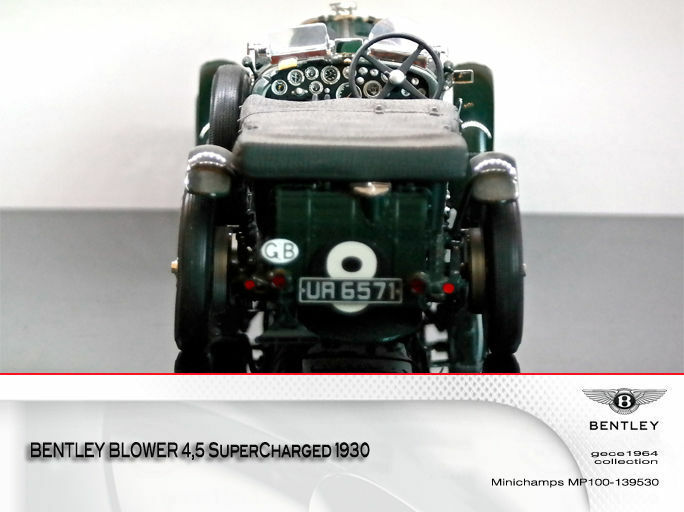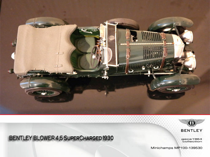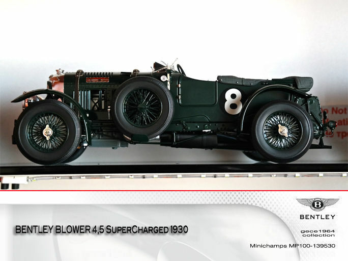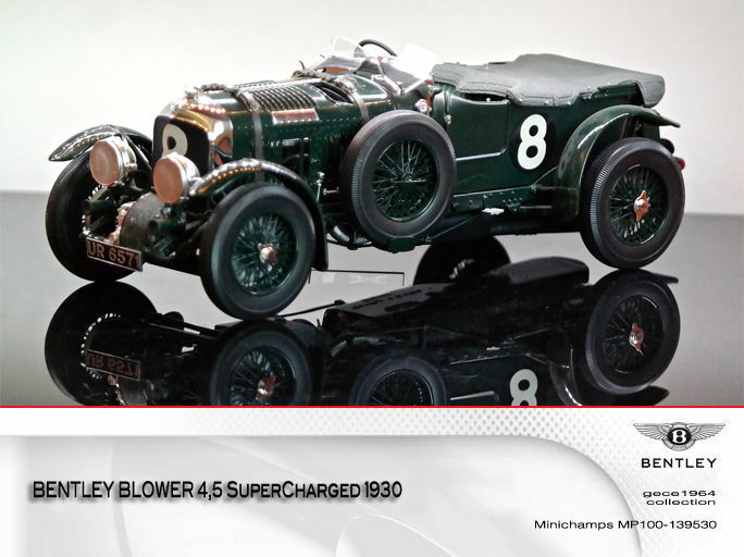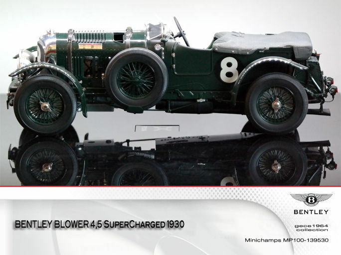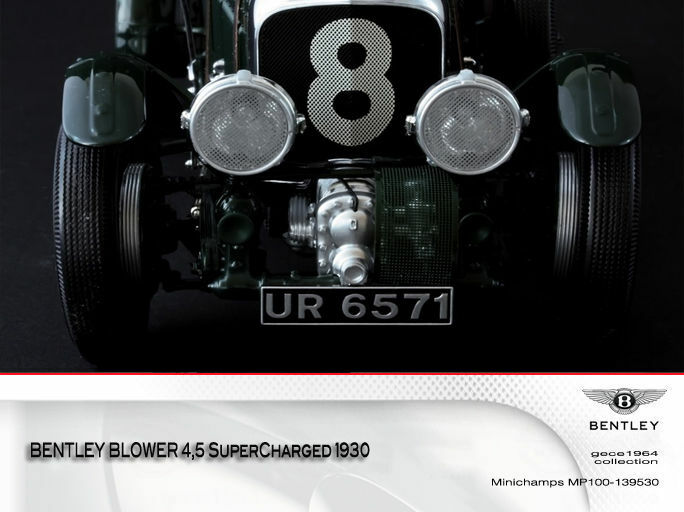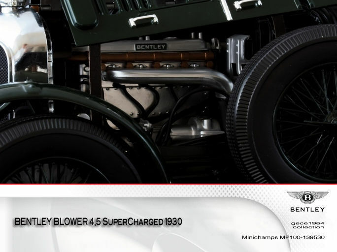 Die Automarke Bentley Motors Ltd. wurde im Januar 1919 von Walter Owen Bentley, gegründet, der vorher mit seinem Bruder unter dem Namen Bentley & Bentley einen Handel für DFP-Automobile betrieben hatte. W.O. Bentley war selbst leidenschaftlicher Rennfahrer und gewann einige Rennen mit selbst verbesserten Autos. Die Bentley Blower, angetrieben von einem aufgeladenen 4,5 Liter Motor, wurden entwickelt und gebaut von Sir Henry Tim Birkin. Die Entscheidung zum Bau der aufgeladenen Bentleys basierte auf dem Wunsch Birkins nach mehr Leistung des vorhandenen Triebwerks, während W.O. Bentley die Hubraumvergrößerung bevorzugte. Neben fünf Rennwagen des Birkin / Paget Rennteams wurden in einer zweiten Serie 50 Strassenautos gebaut, um die Homologation zur Teilnahme bei den 24 Stunden von Le Mans erteilt zu bekommen. Obwohl sich die Blower Bentleys als schneller als die ebenfalls teilnehmenden Speed Six erwiesen, waren sie weniger zuverlässig und gewannen nie in Le Mans. Bis zum heutigen Tage ist der Rundenrekord auf der Strecke jener Tage ungebrochen, was beweist, dass es nicht an mangelnder Leistung Birkins Autos lag. Ohne Zweifel sind die Blower Bentleys, auch wenn ihnen große Rennsiege versagt blieben, die charismatischsten und berühmtesten Fahrzeuge, die je die Hallen von Bentley verlassen haben. Modellbesonderheiten: