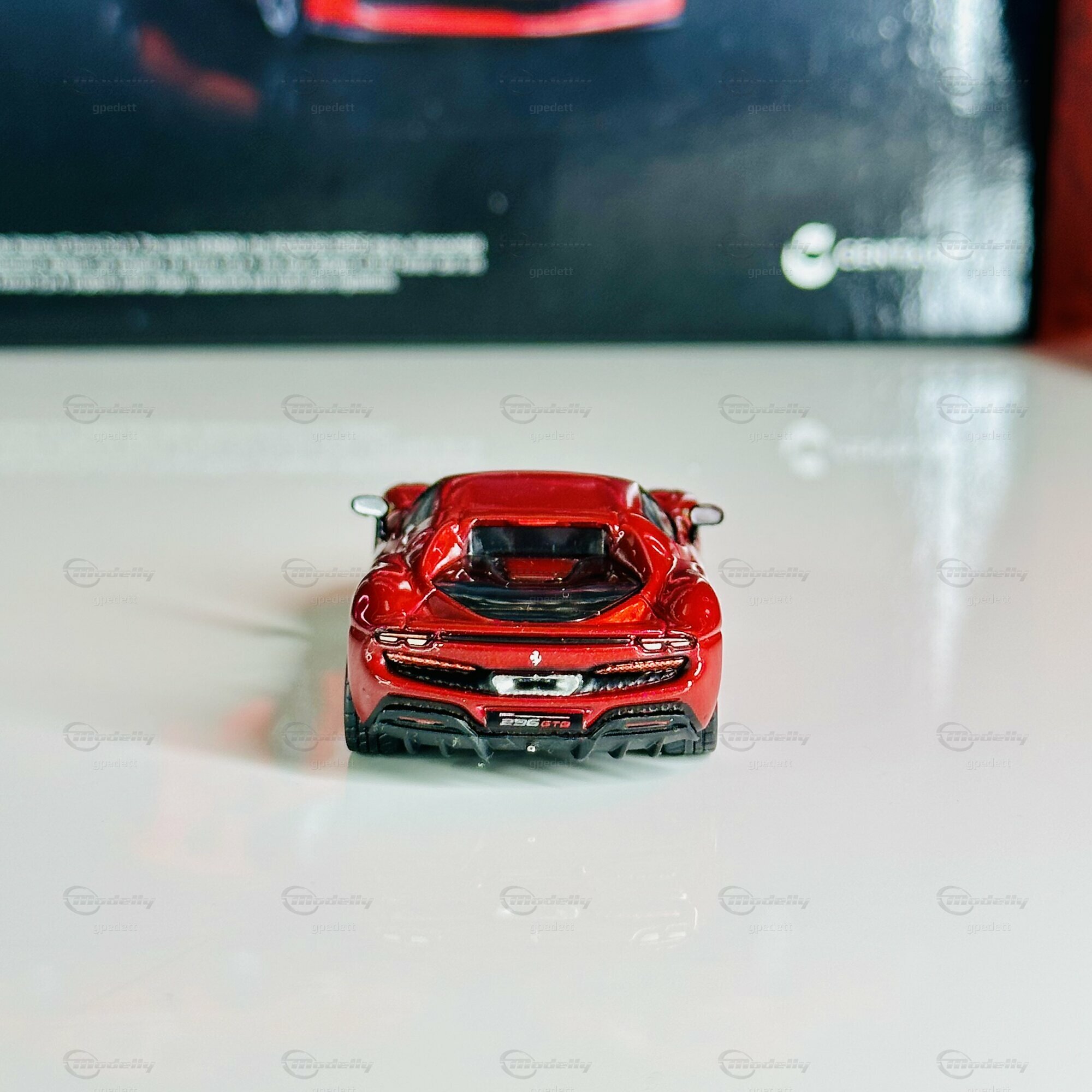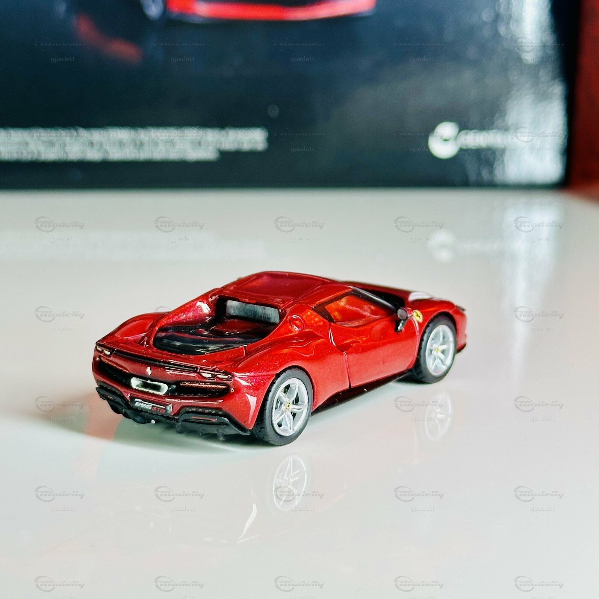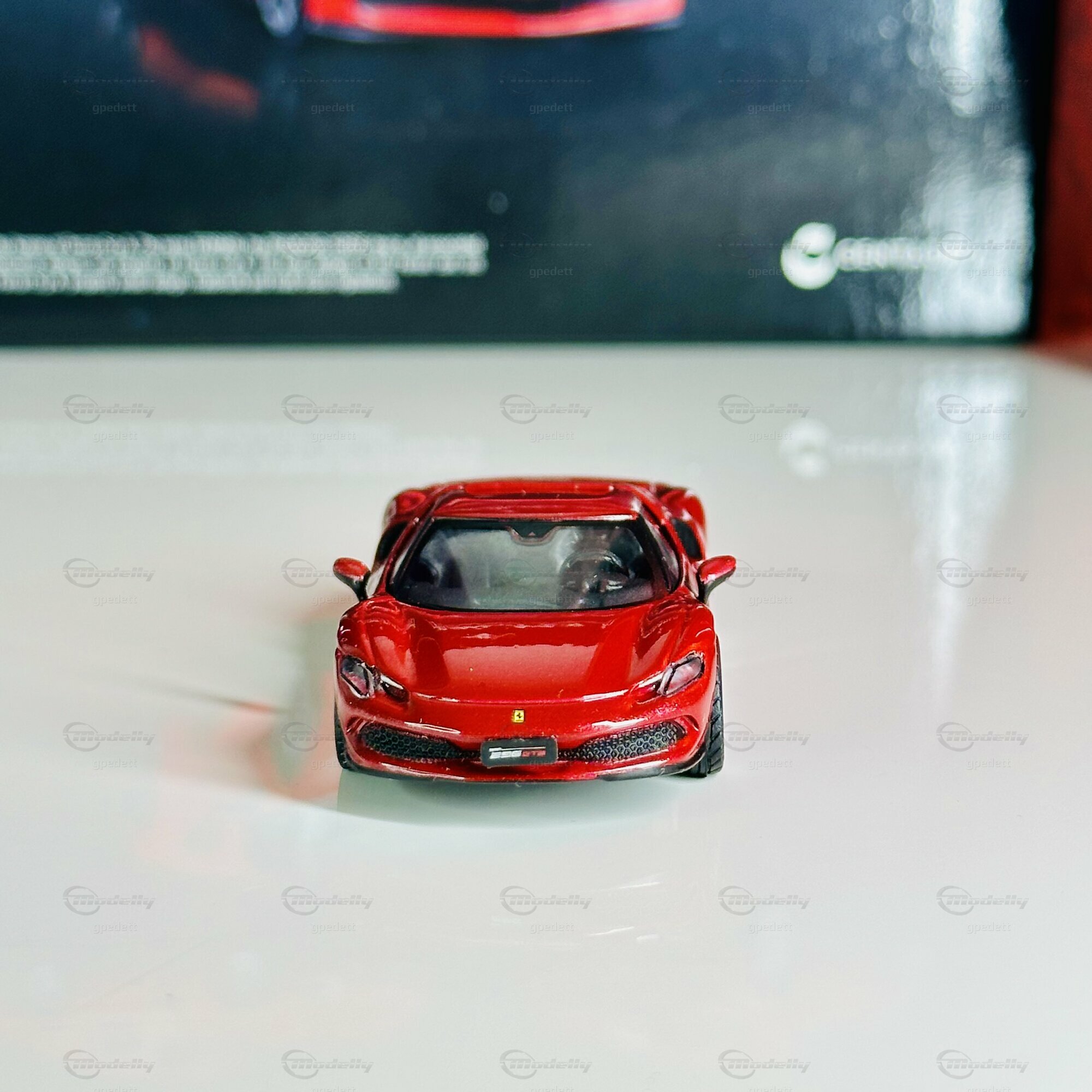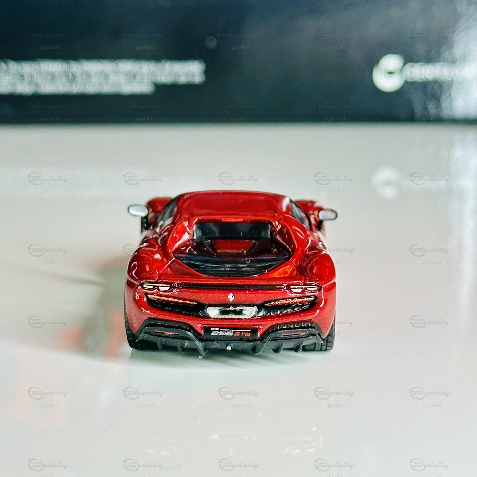 The showcased model car is in the scale of 1/64 and was manufactured by Centauria. The level of detail in this model is impressive. It is made of die-cast material, which increases its durability and feel. The paint job is in a shiny red color that is very close to the typical Ferrari red. The shapes of the model are precise, reflecting the aerodynamic curves of the original car. The iconic Ferrari emblem is placed in the typical spots, while the sharp edges and aggressive front grille give the miniature model a strong presence. The model's rims are also meticulously replicated and eye-catching.