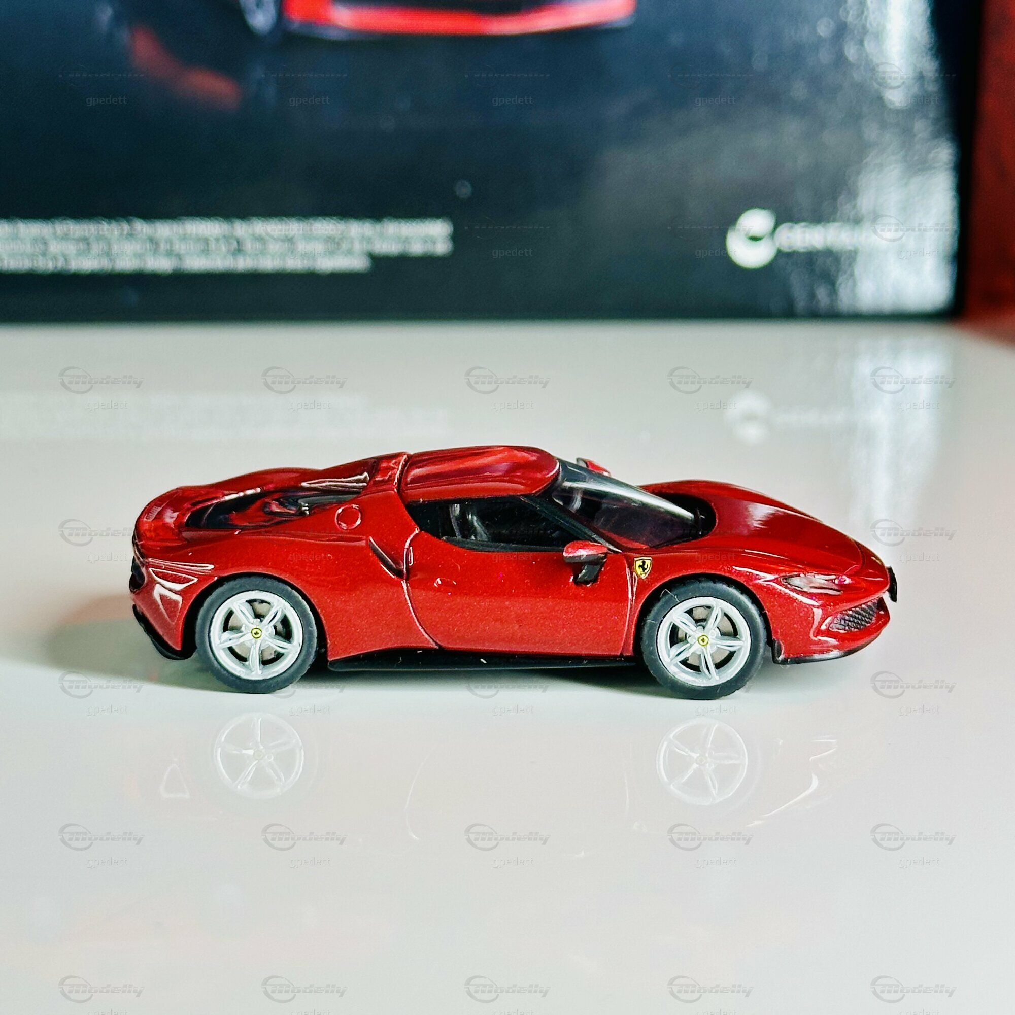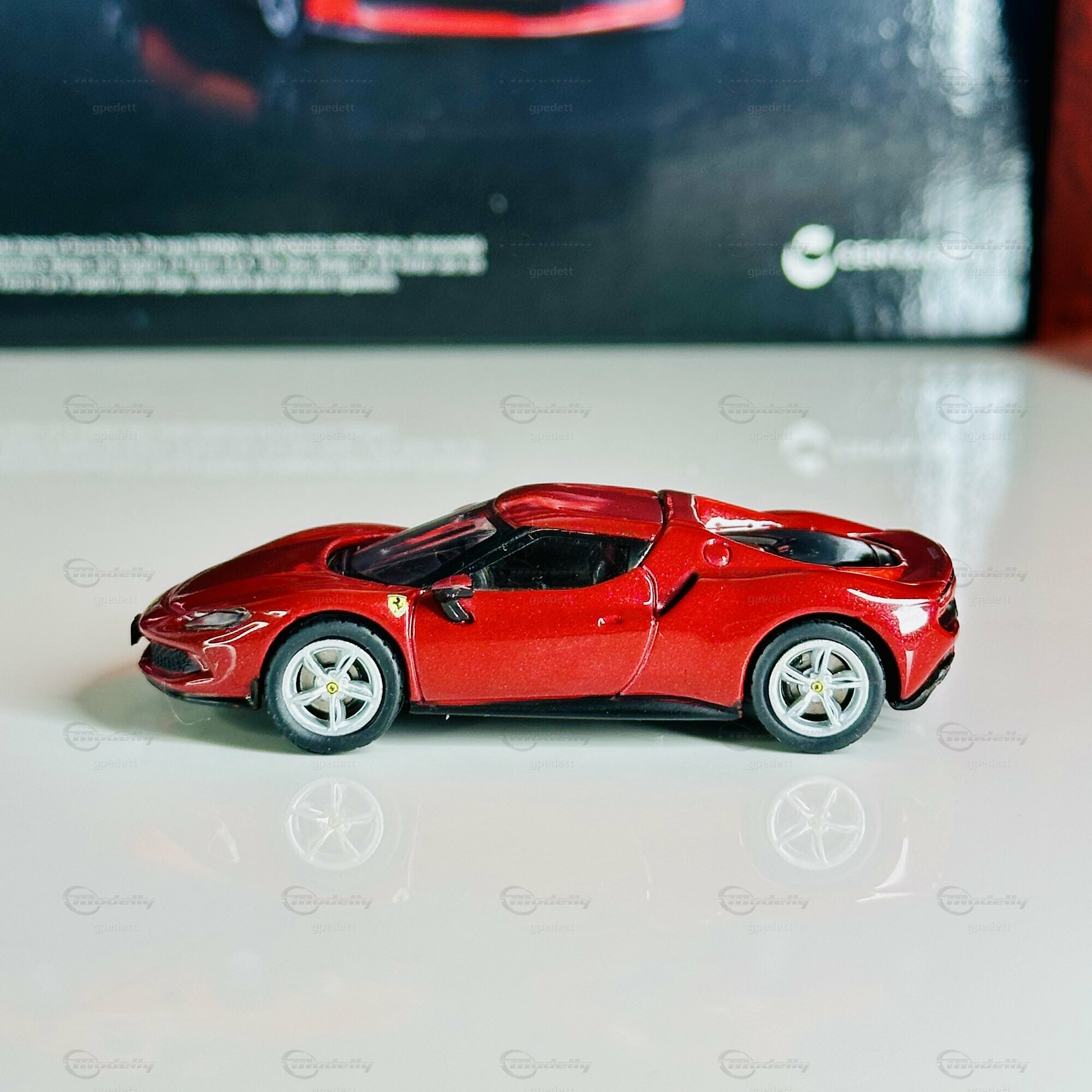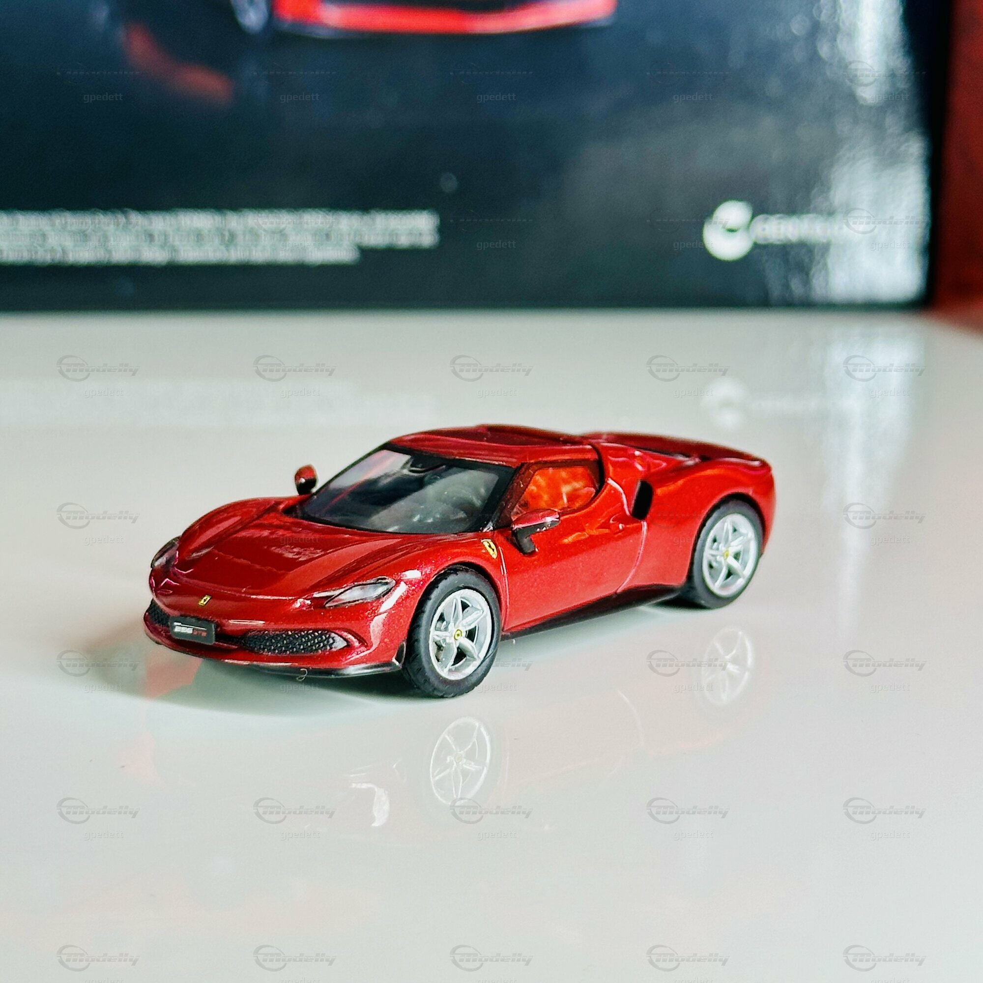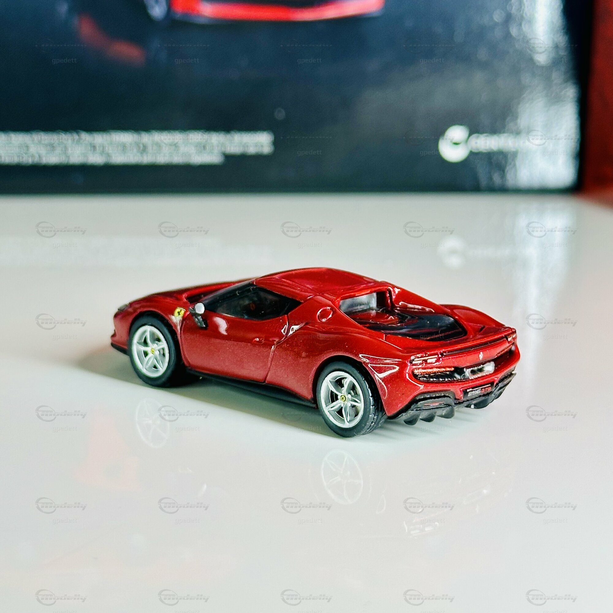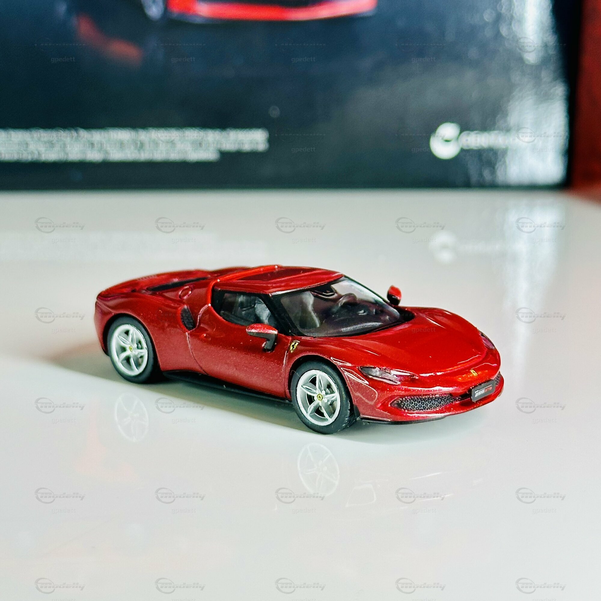 The showcased model car is in the scale of 1/64 and was manufactured by Centauria. The level of detail in this model is impressive. It is made of die-cast material, which increases its durability and feel. The paint job is in a shiny red color that is very close to the typical Ferrari red. The shapes of the model are precise, reflecting the aerodynamic curves of the original car. The iconic Ferrari emblem is placed in the typical spots, while the sharp edges and aggressive front grille give the miniature model a strong presence. The model's rims are also meticulously replicated and eye-catching.