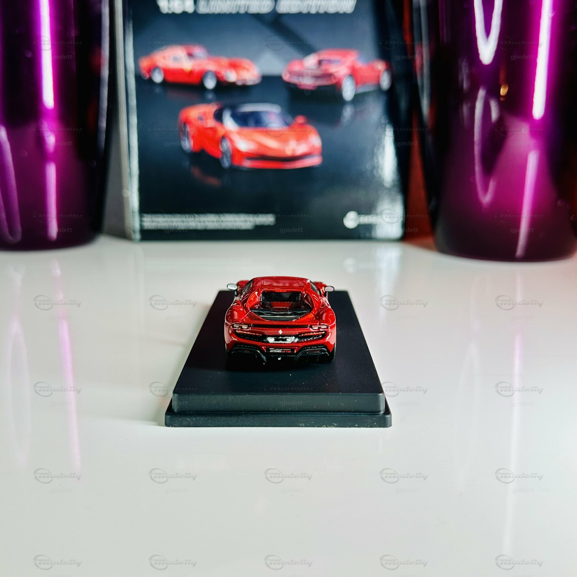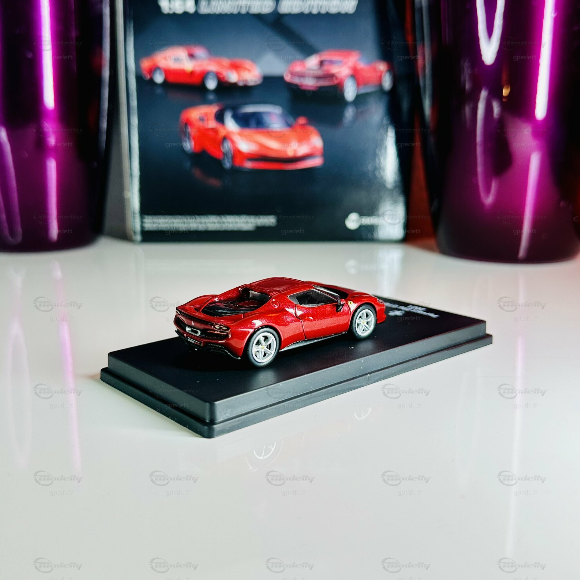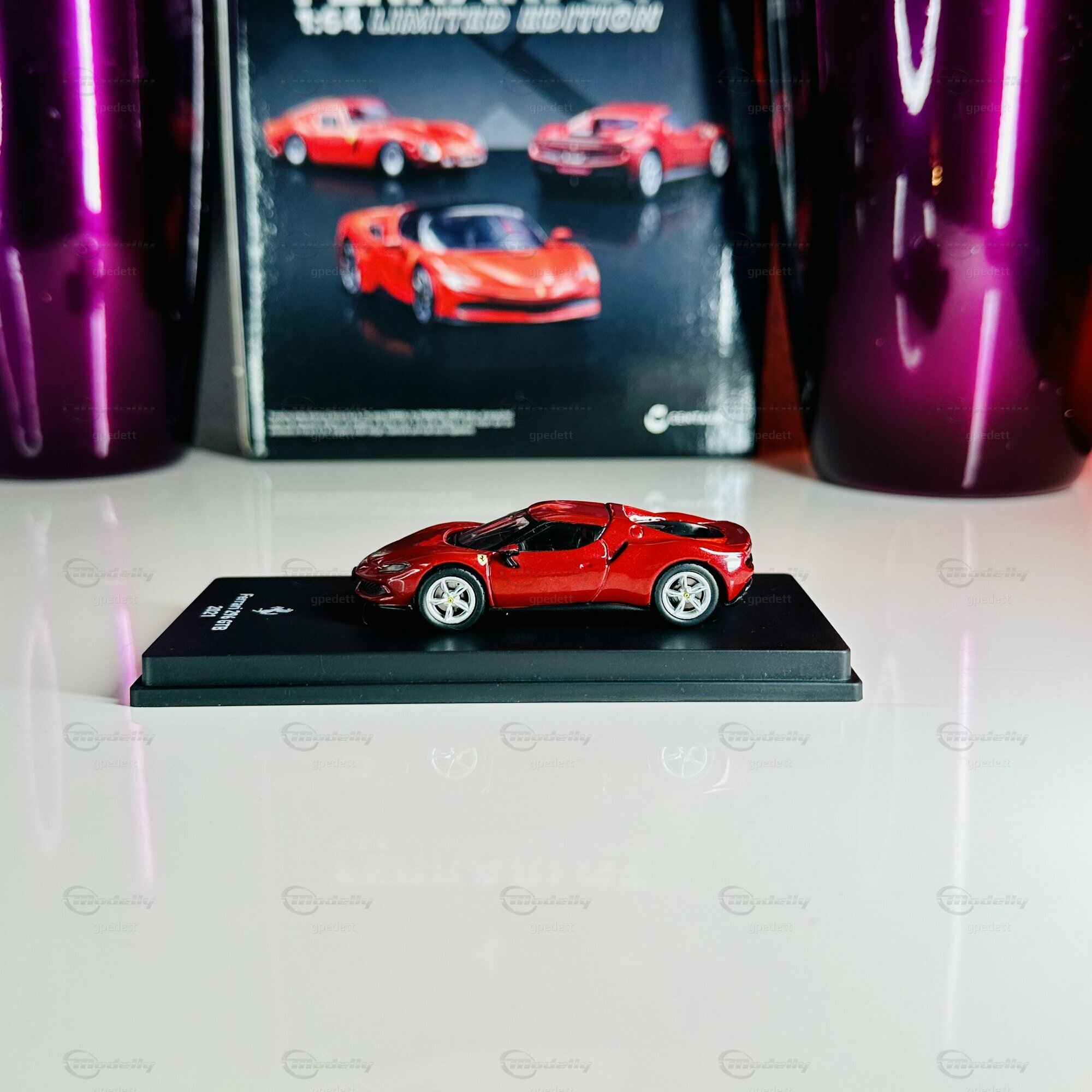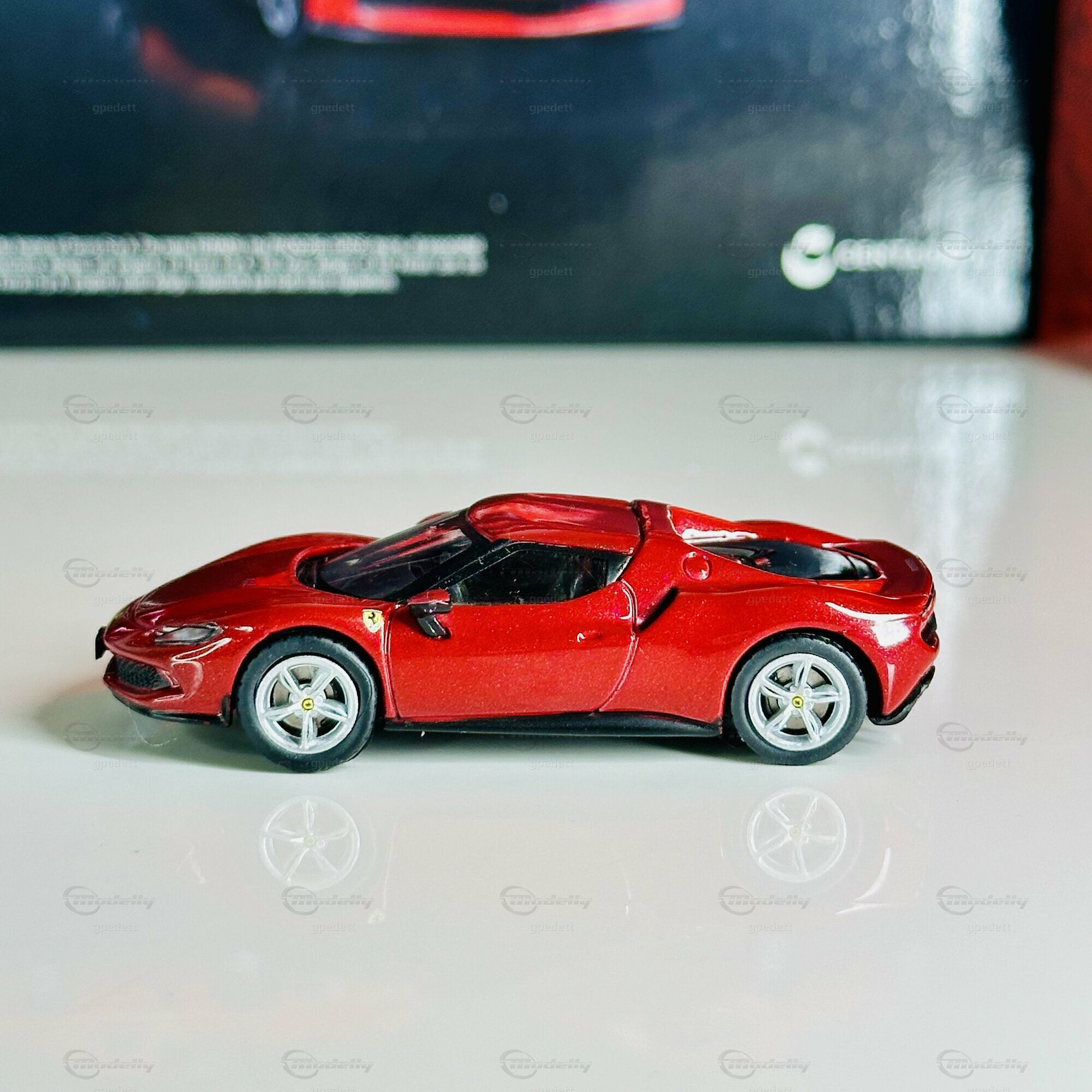 The showcased model car is in the scale of 1/64 and was manufactured by Centauria. The level of detail in this model is impressive. It is made of die-cast material, which increases its durability and feel. The paint job is in a shiny red color that is very close to the typical Ferrari red. The shapes of the model are precise, reflecting the aerodynamic curves of the original car. The iconic Ferrari emblem is placed in the typical spots, while the sharp edges and aggressive front grille give the miniature model a strong presence. The model's rims are also meticulously replicated and eye-catching.