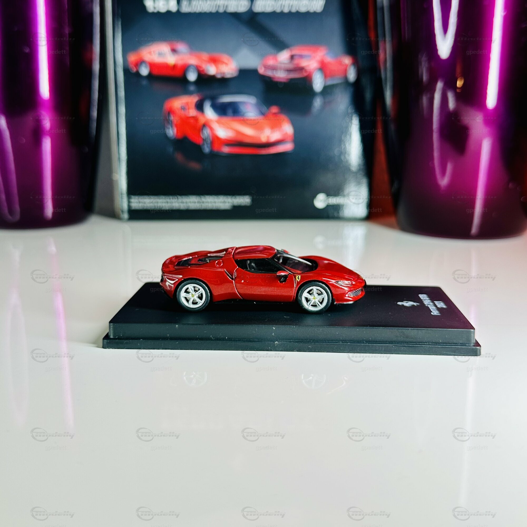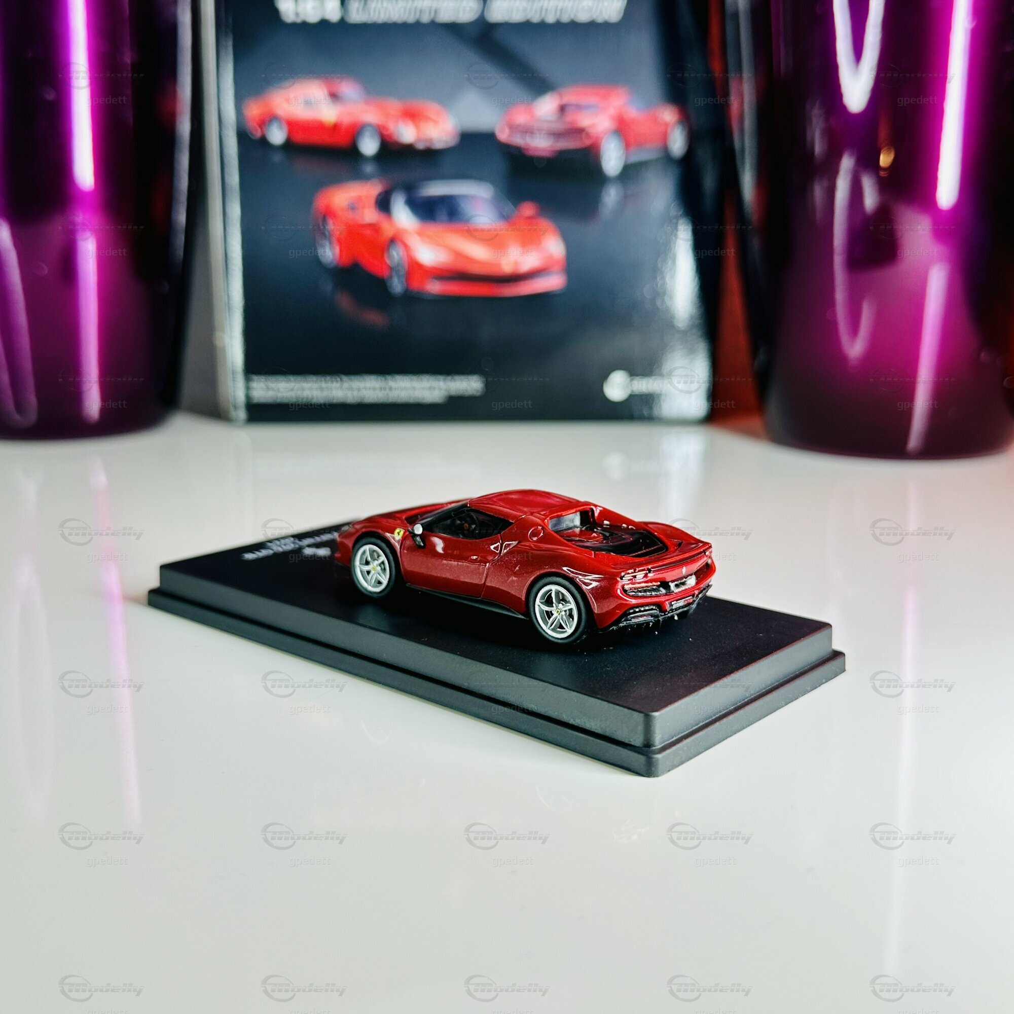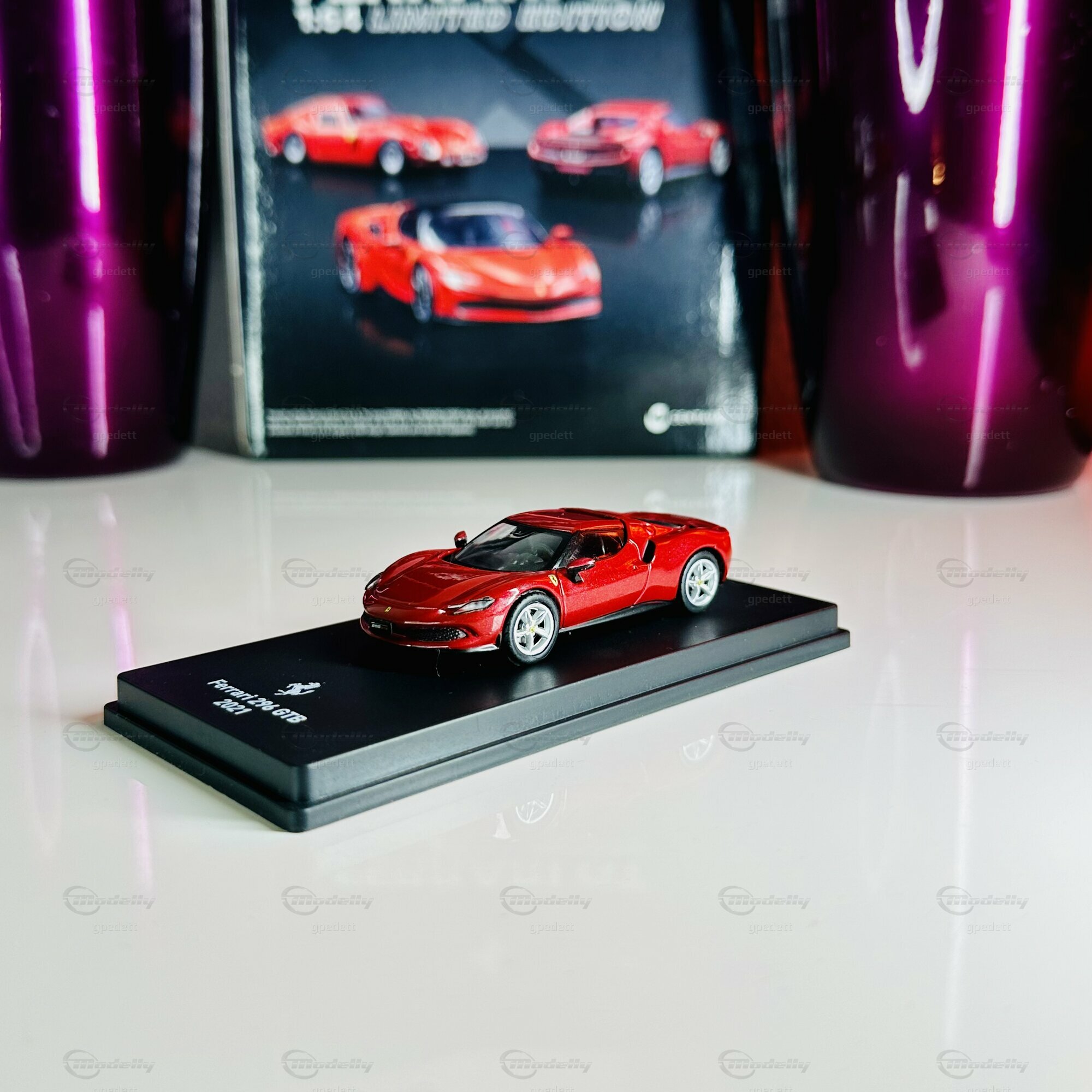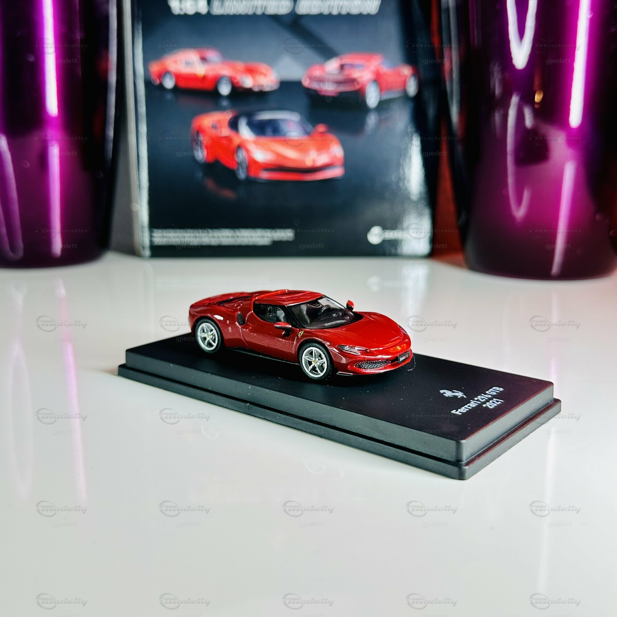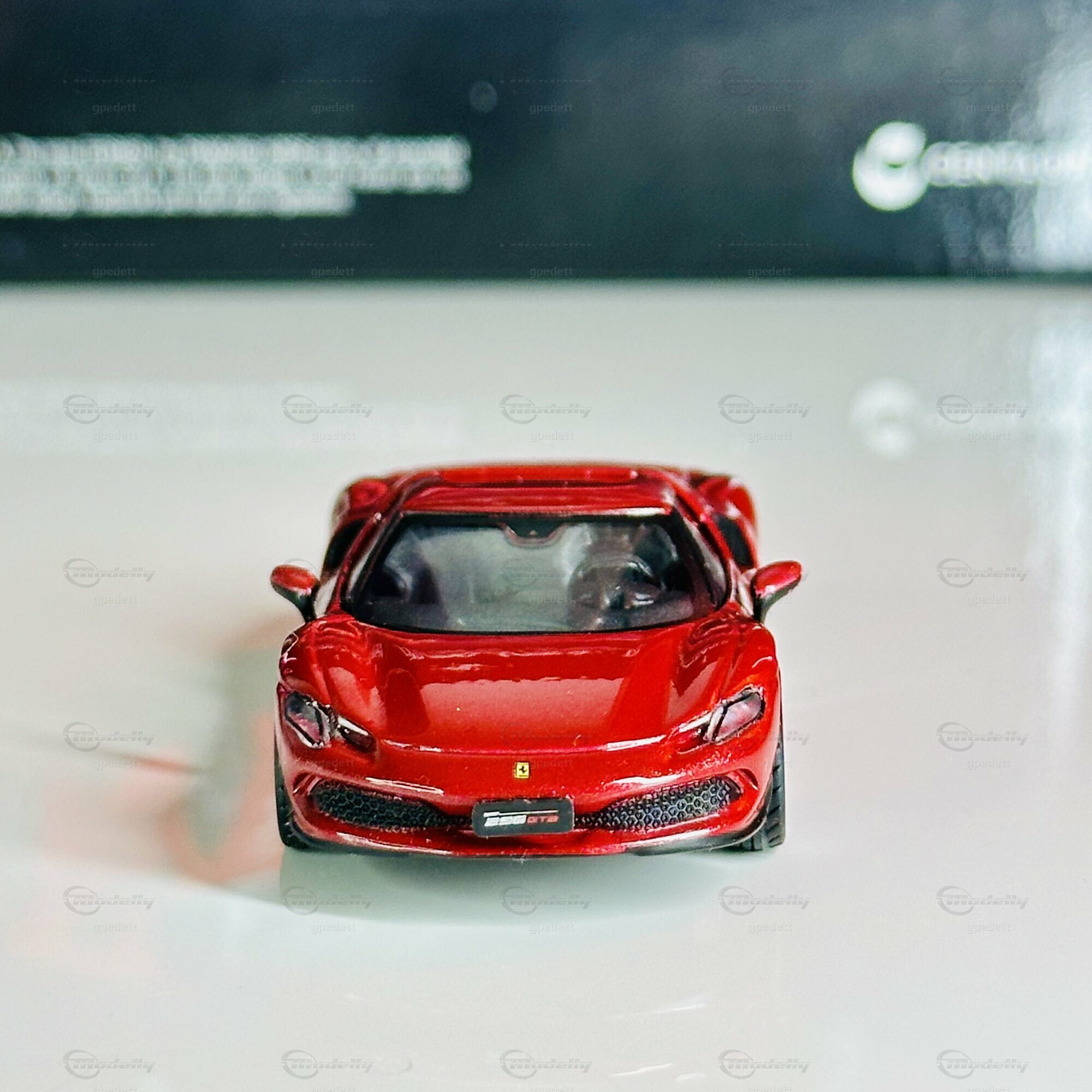 The showcased model car is in the scale of 1/64 and was manufactured by Centauria. The level of detail in this model is impressive. It is made of die-cast material, which increases its durability and feel. The paint job is in a shiny red color that is very close to the typical Ferrari red. The shapes of the model are precise, reflecting the aerodynamic curves of the original car. The iconic Ferrari emblem is placed in the typical spots, while the sharp edges and aggressive front grille give the miniature model a strong presence. The model's rims are also meticulously replicated and eye-catching.