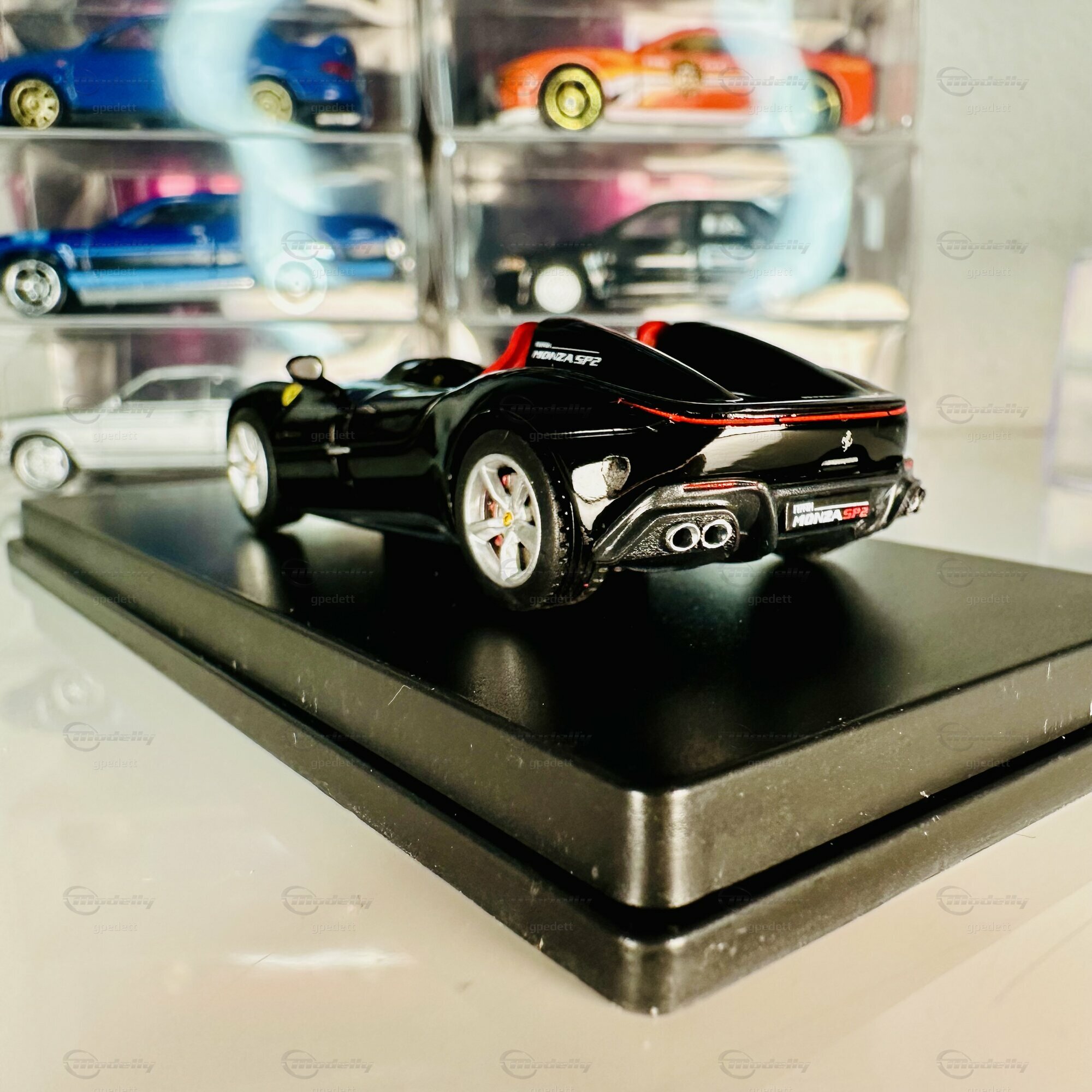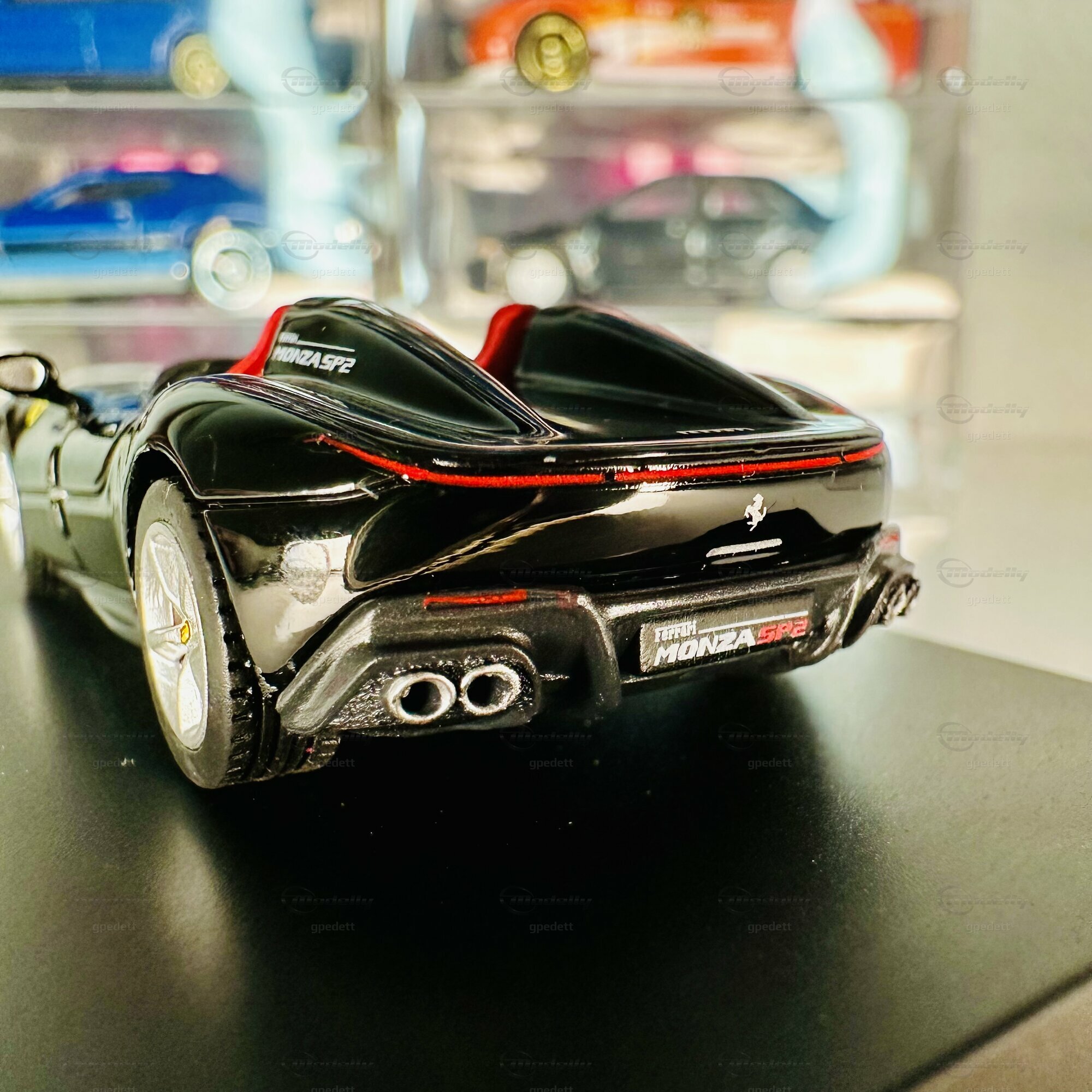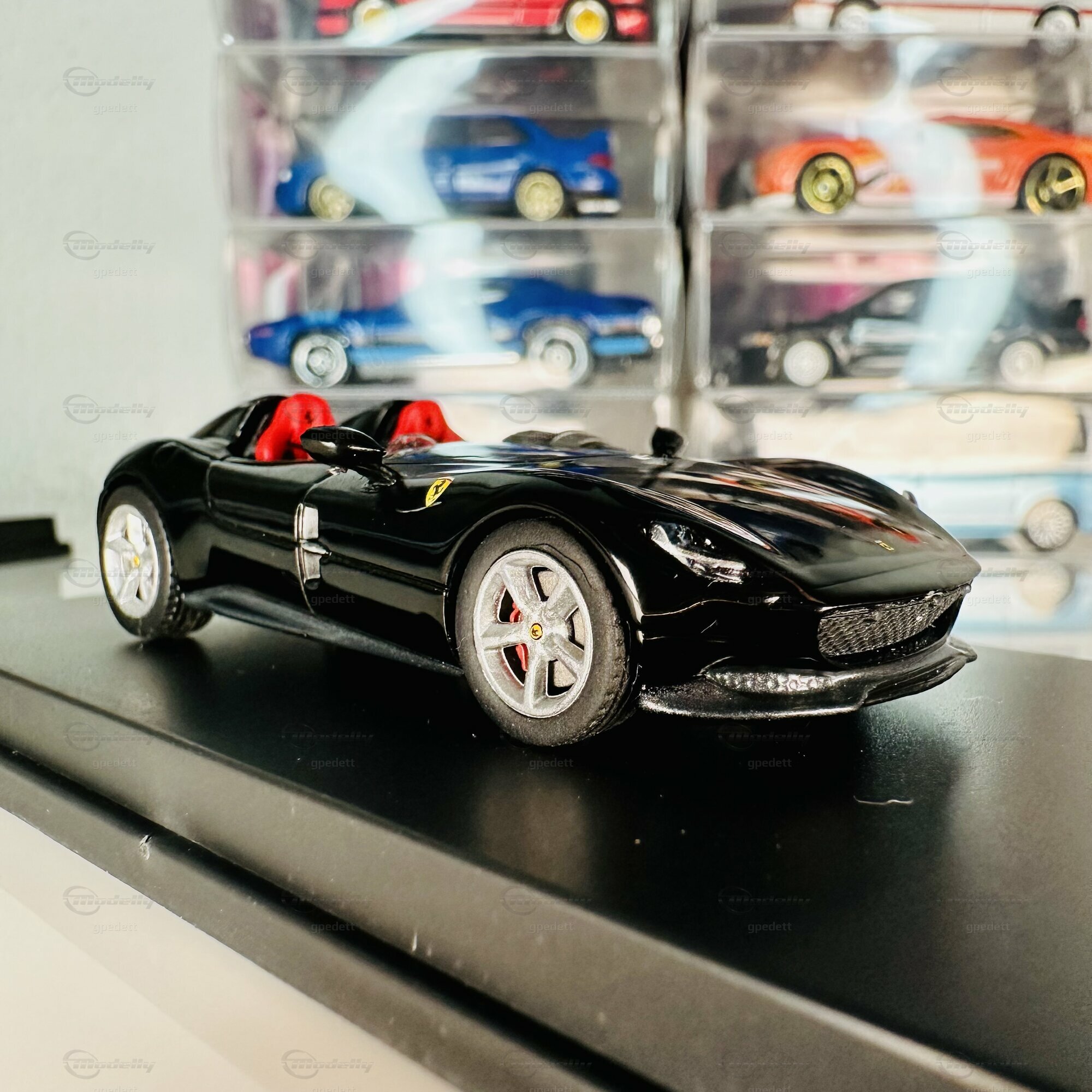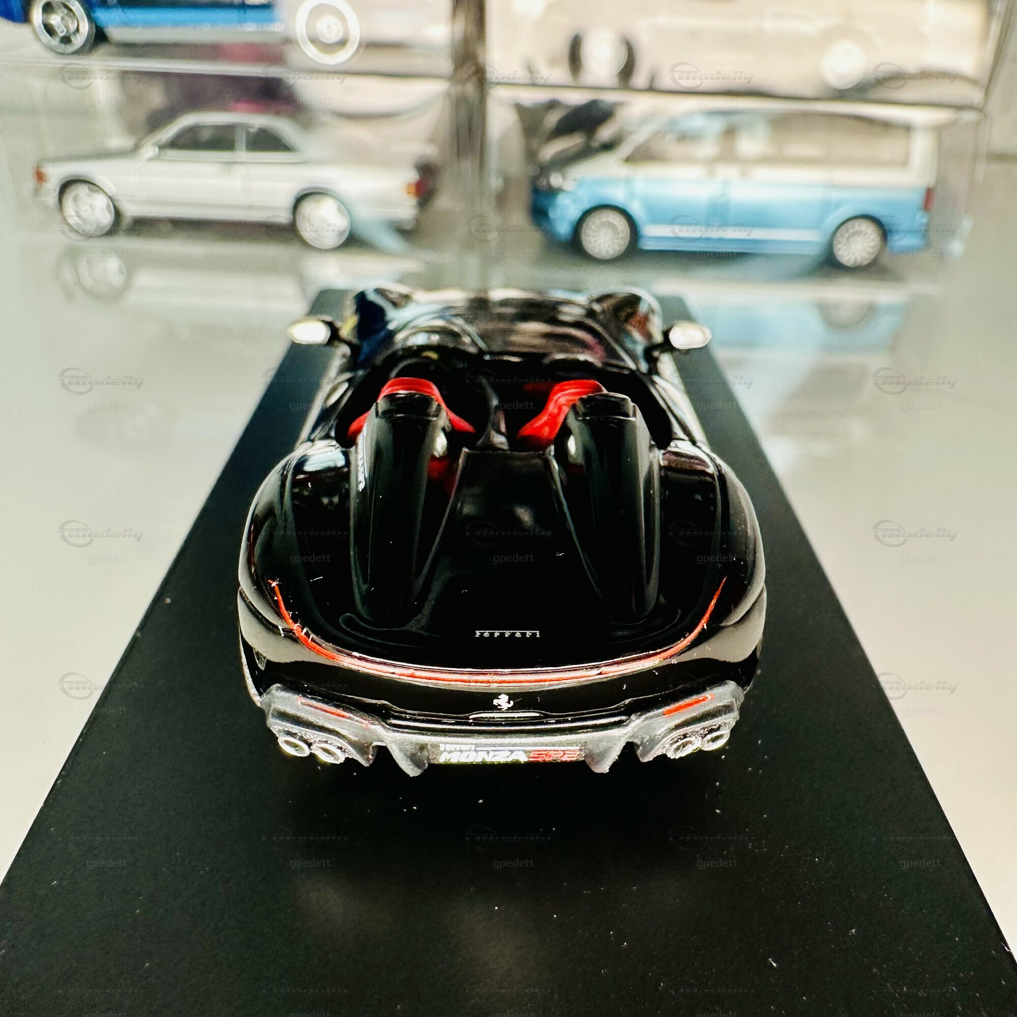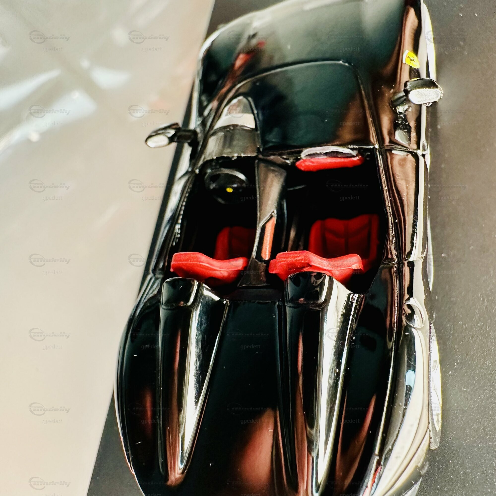 The model car shown is a precise 1/64-scale representation of the Ferrari Monza SP2. This accurate replica is manufactured by Centauria and belongs to the collection of Modelly member "gpedett". The miniature is made of die-cast material, ensuring high precision in details. The photos display a glossy black finish that perfectly captures the elegance of the original. The red seats stand out, creating a pleasant contrast to the black bodywork and emphasizing the sportiness. The front of the model showcases the typical aerodynamic shape of the Ferrari Monza SP2, featuring distinctive air intakes and the iconic grille. At the rear, the twin exhaust pipes and the Ferrari logo are notably visible, while side lines and details are seamlessly integrated. Every component of this model, from the tires to the rims, reflects the high standards that Centauria upholds for their models.