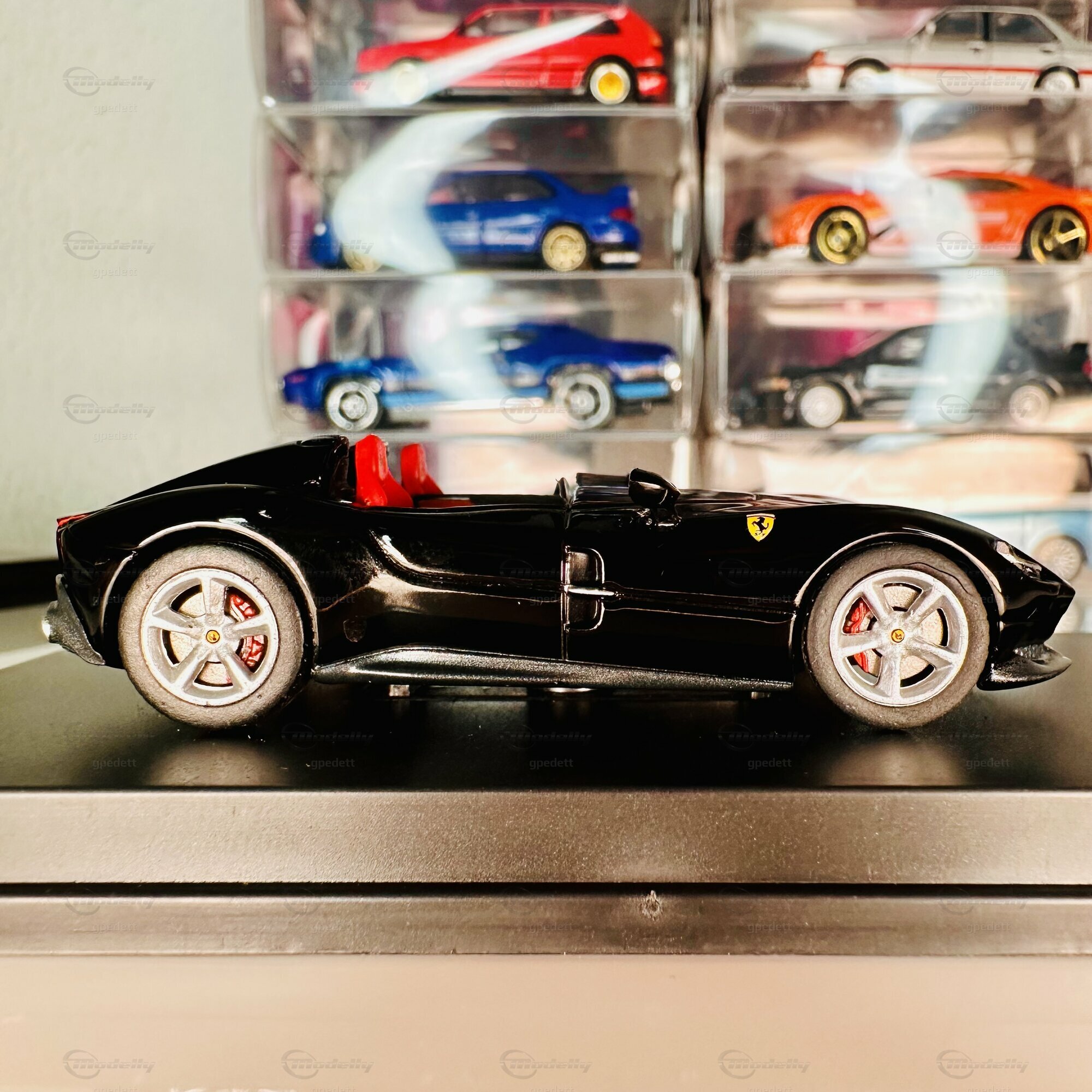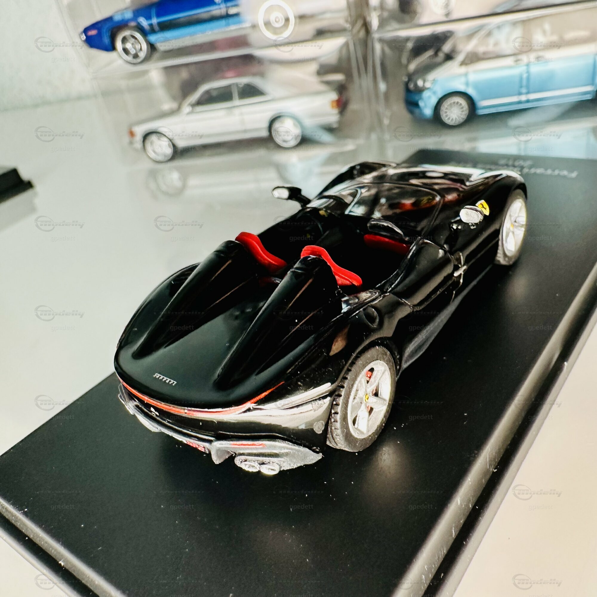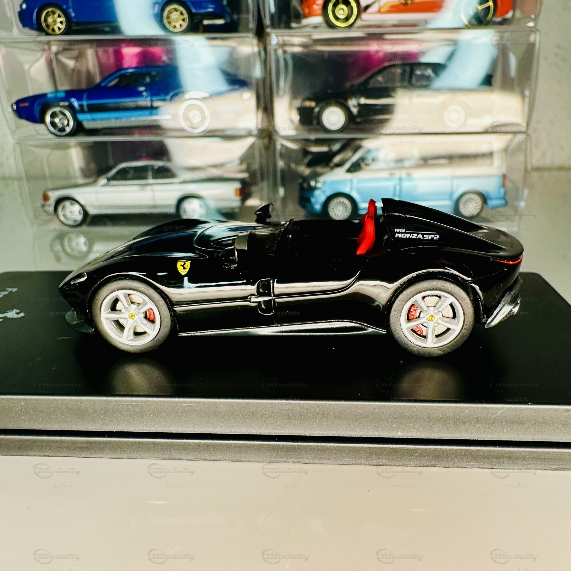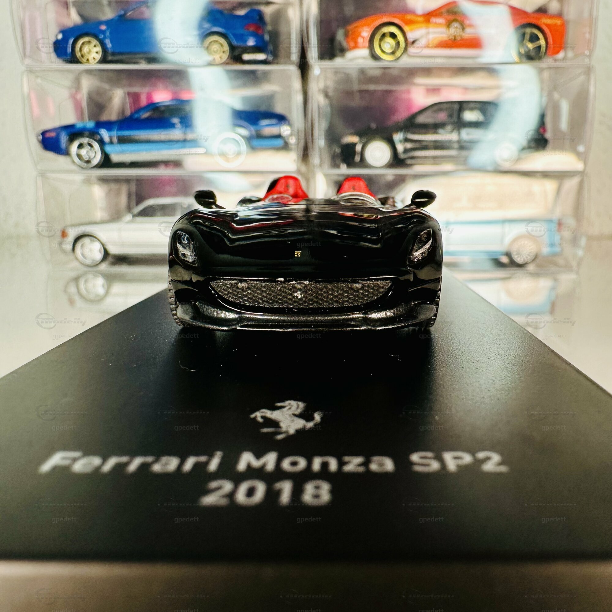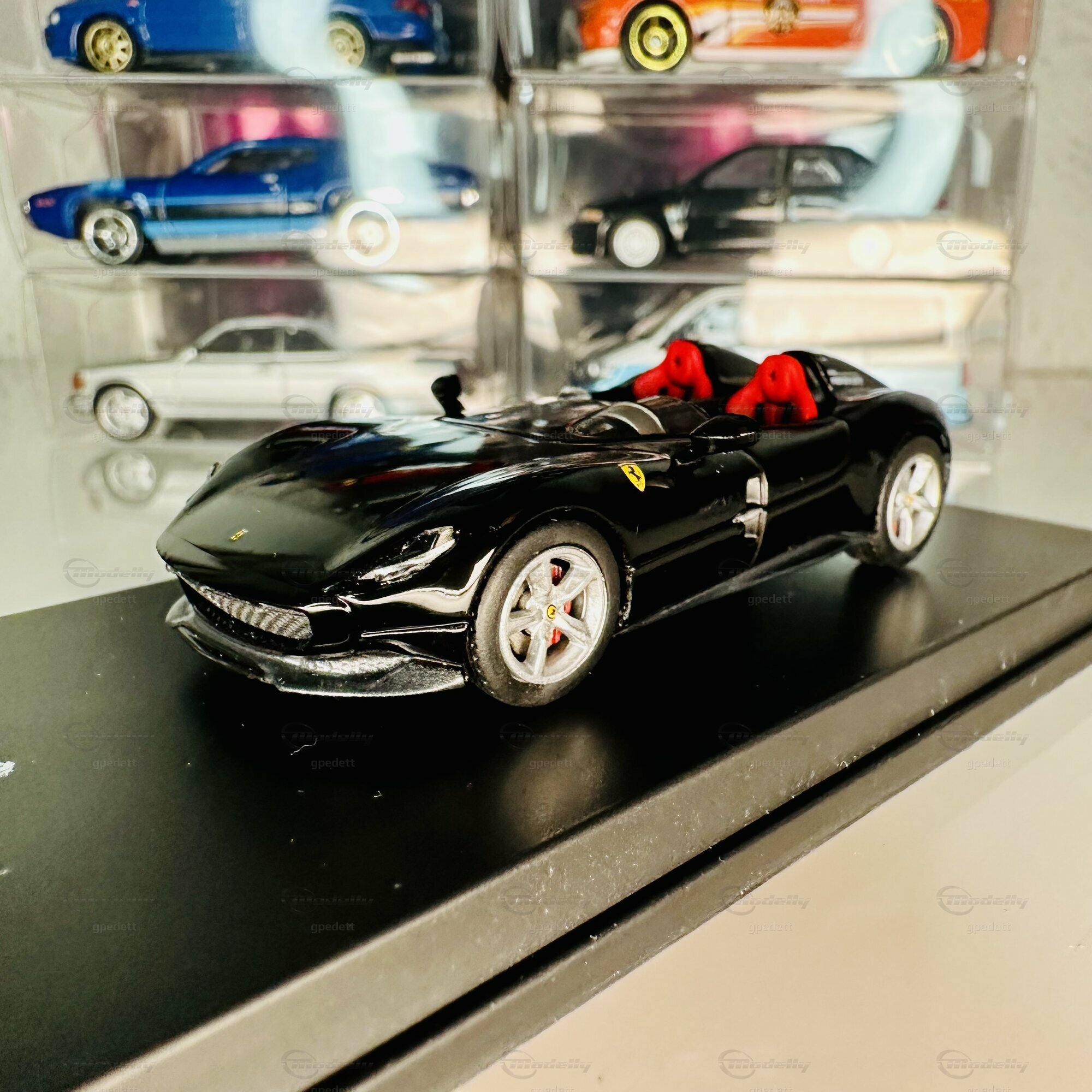 The model car shown is a precise 1/64-scale representation of the Ferrari Monza SP2. This accurate replica is manufactured by Centauria and belongs to the collection of Modelly member "gpedett". The miniature is made of die-cast material, ensuring high precision in details. The photos display a glossy black finish that perfectly captures the elegance of the original. The red seats stand out, creating a pleasant contrast to the black bodywork and emphasizing the sportiness. The front of the model showcases the typical aerodynamic shape of the Ferrari Monza SP2, featuring distinctive air intakes and the iconic grille. At the rear, the twin exhaust pipes and the Ferrari logo are notably visible, while side lines and details are seamlessly integrated. Every component of this model, from the tires to the rims, reflects the high standards that Centauria upholds for their models.