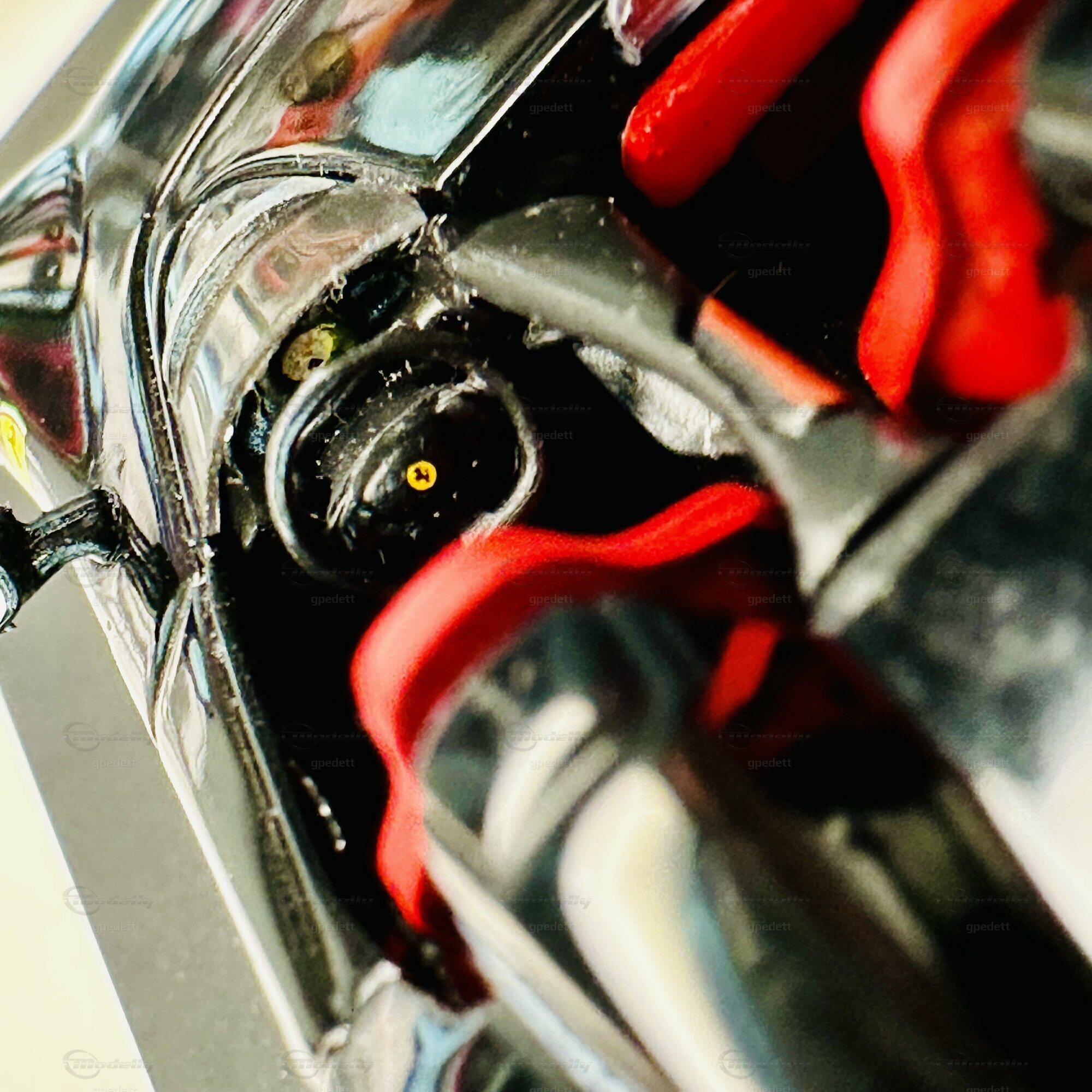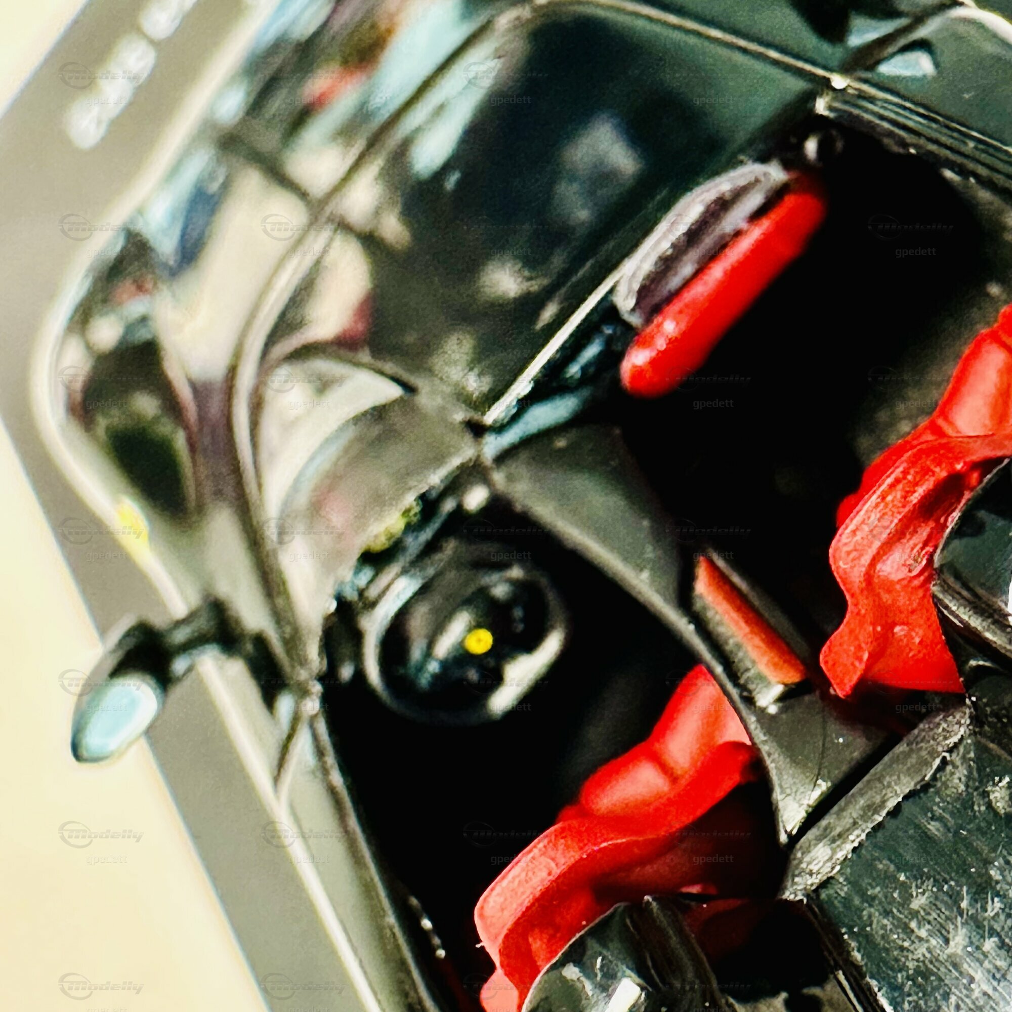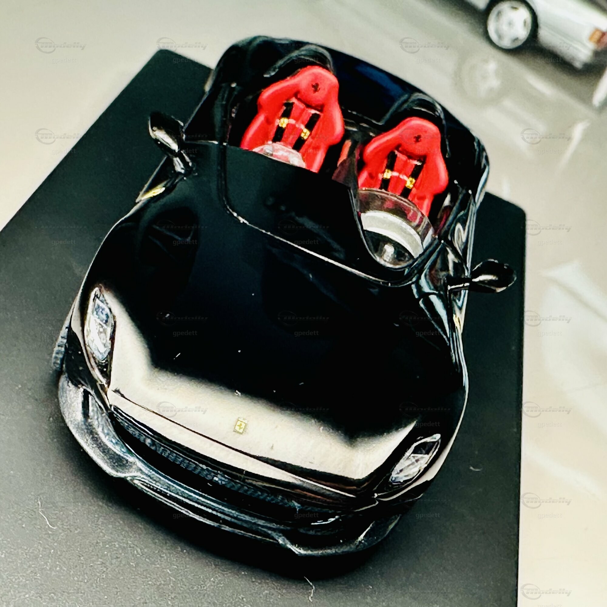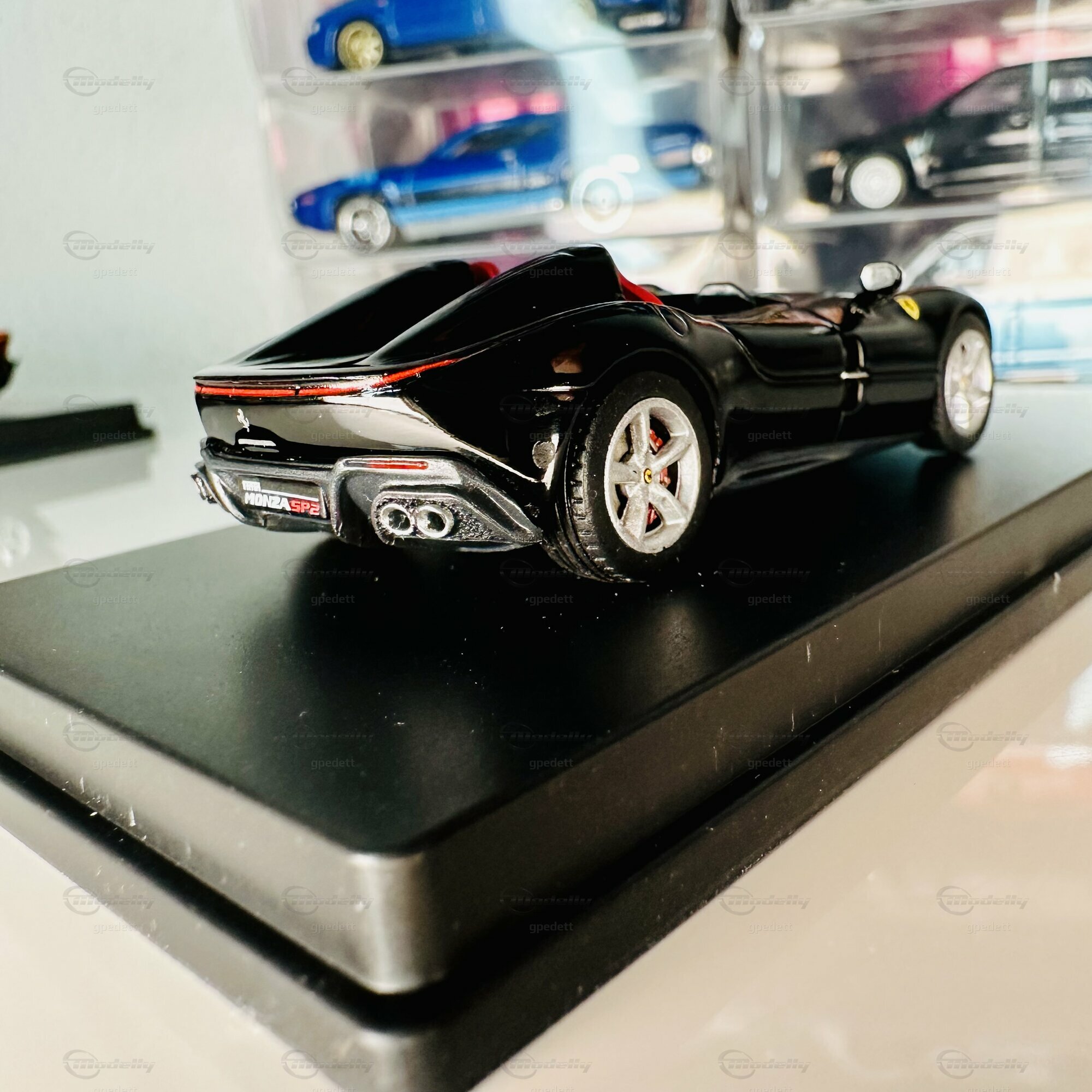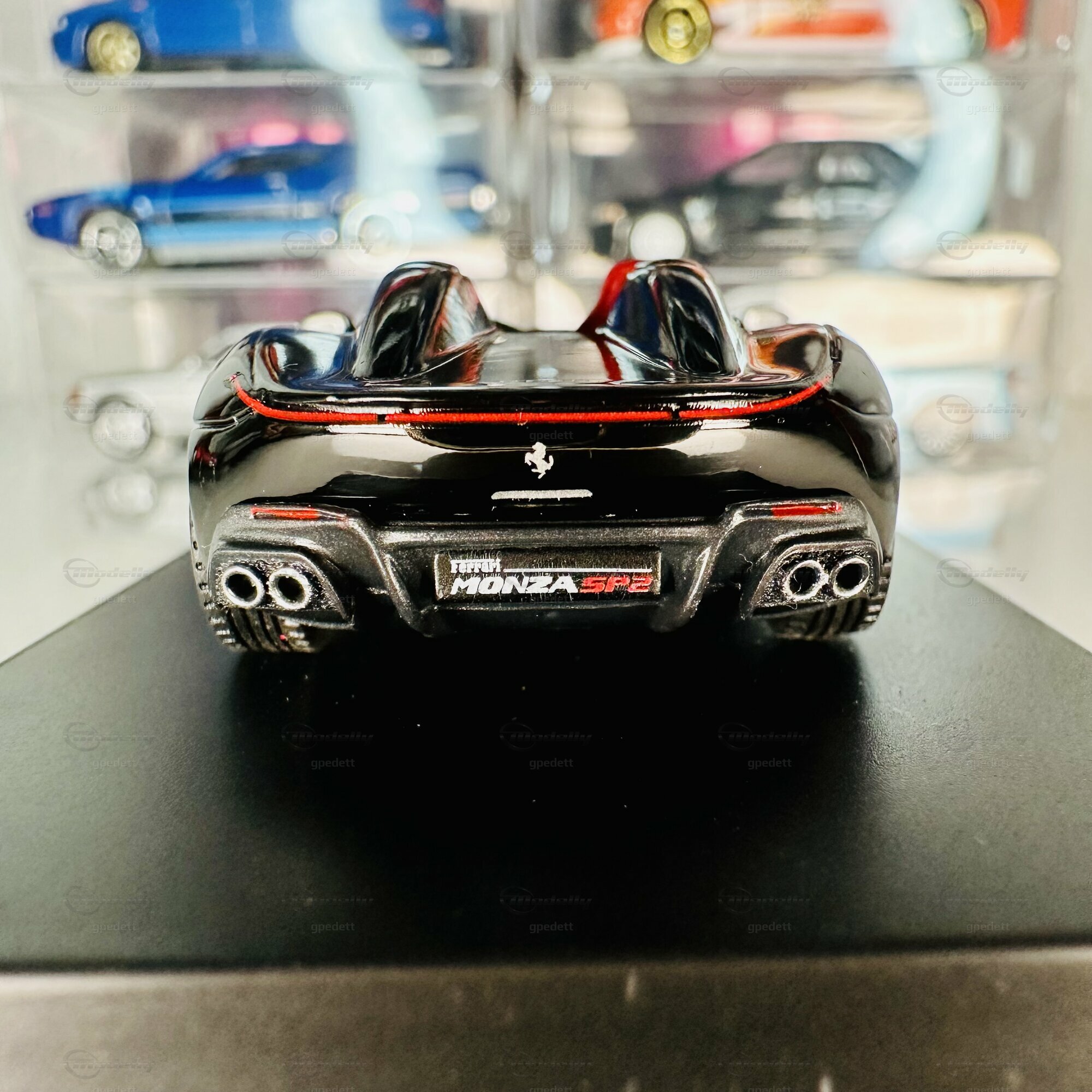 The model car shown is a precise 1/64-scale representation of the Ferrari Monza SP2. This accurate replica is manufactured by Centauria and belongs to the collection of Modelly member "gpedett". The miniature is made of die-cast material, ensuring high precision in details. The photos display a glossy black finish that perfectly captures the elegance of the original. The red seats stand out, creating a pleasant contrast to the black bodywork and emphasizing the sportiness. The front of the model showcases the typical aerodynamic shape of the Ferrari Monza SP2, featuring distinctive air intakes and the iconic grille. At the rear, the twin exhaust pipes and the Ferrari logo are notably visible, while side lines and details are seamlessly integrated. Every component of this model, from the tires to the rims, reflects the high standards that Centauria upholds for their models.
