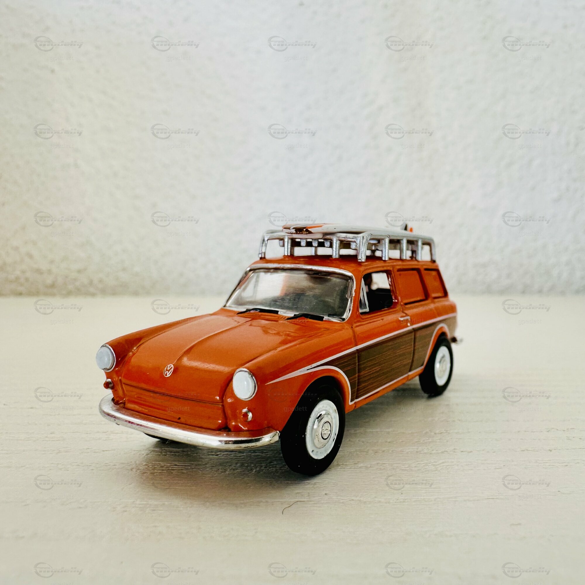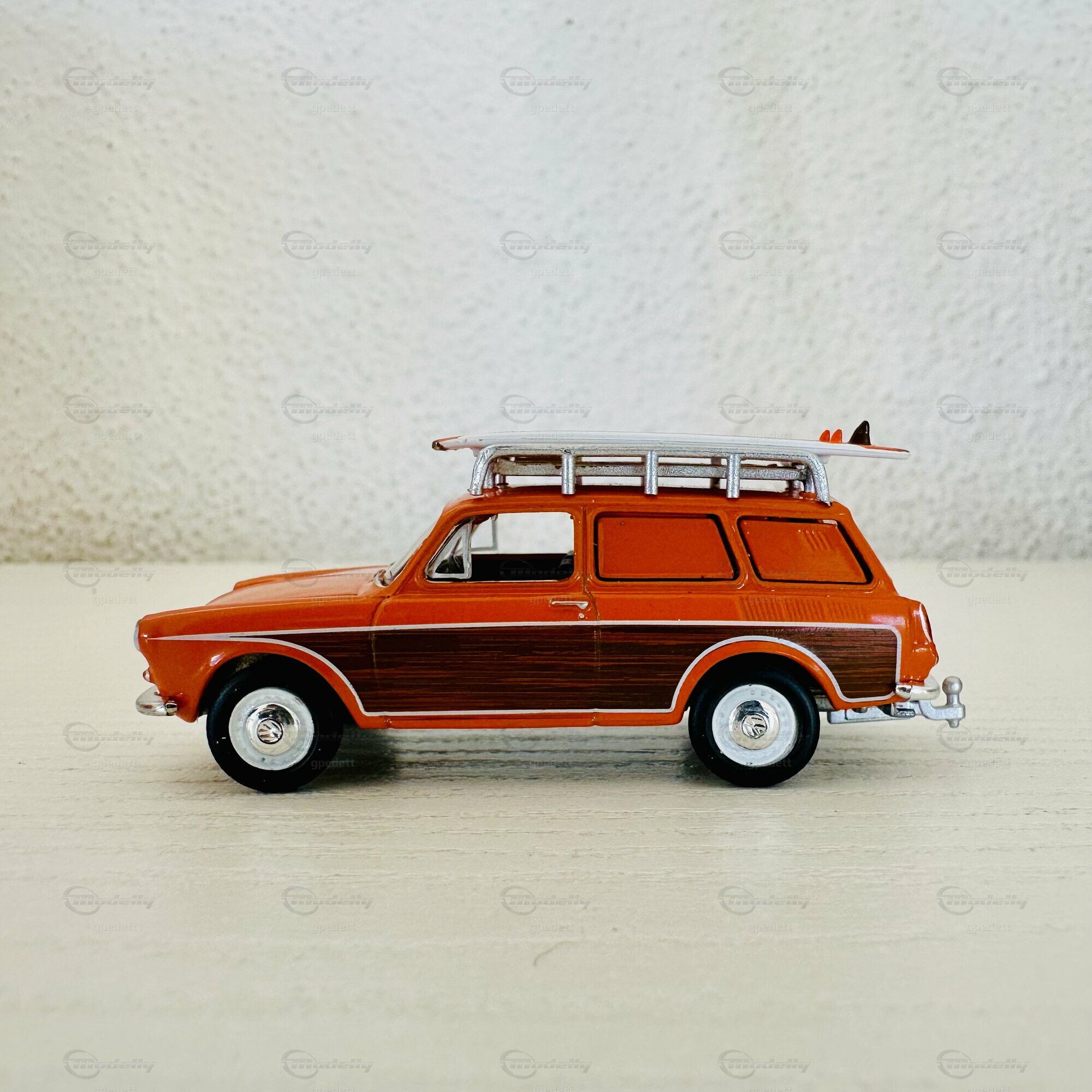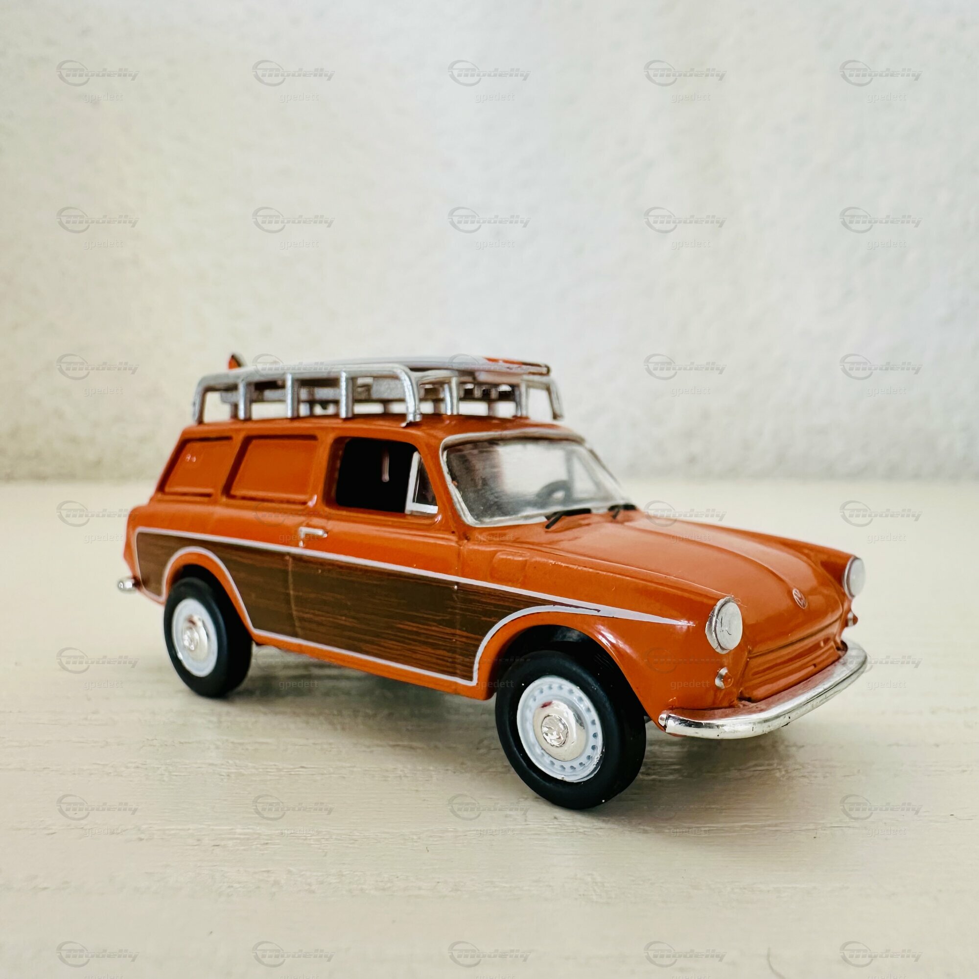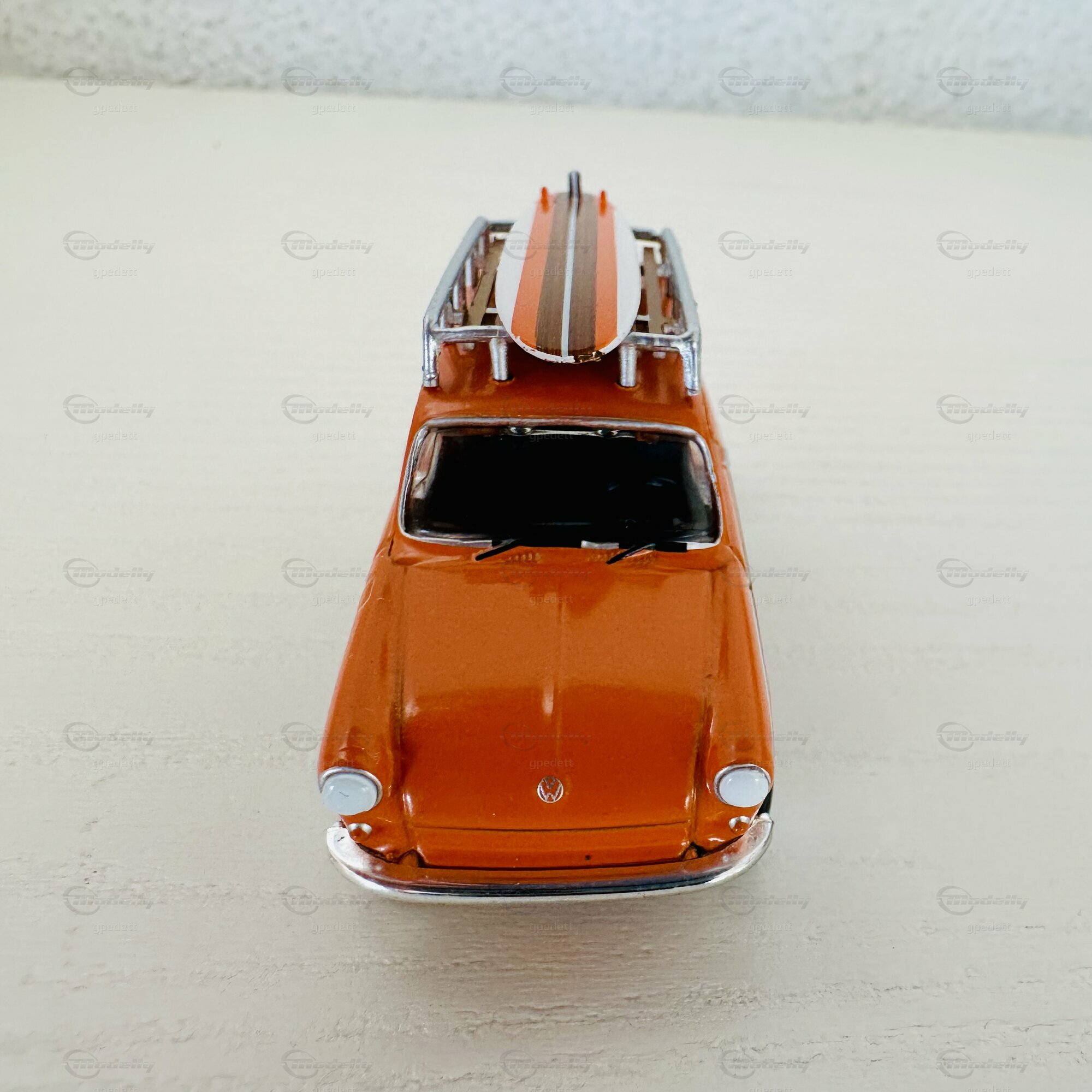 Design and Theme: The 1963 Volkswagen Type 3 "Woody" is presented with faux wood paneling on its sides, emulating the classic 'woody' station wagons that were popular in the mid-20th century, especially in beach and surf communities. The addition of a surfboard mounted on the roof racks further enhances its appeal, evoking images of sunny days at the beach and the surf culture of the 1960s.
