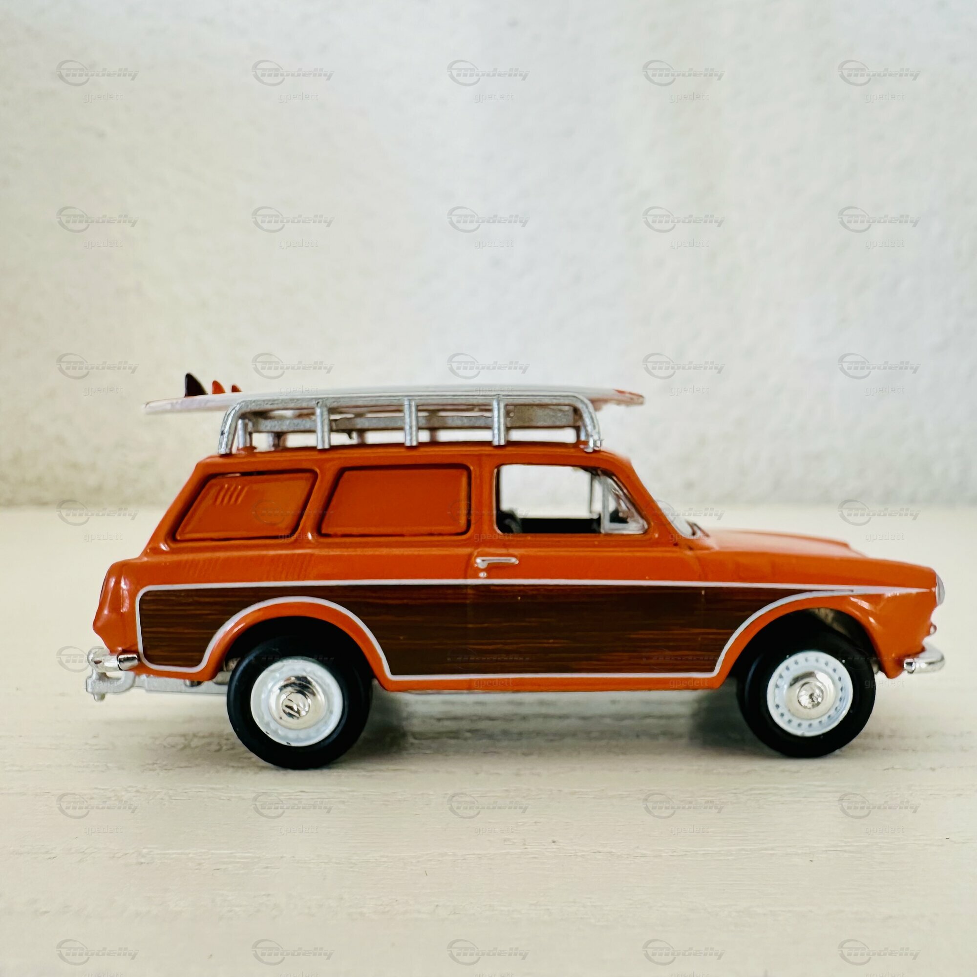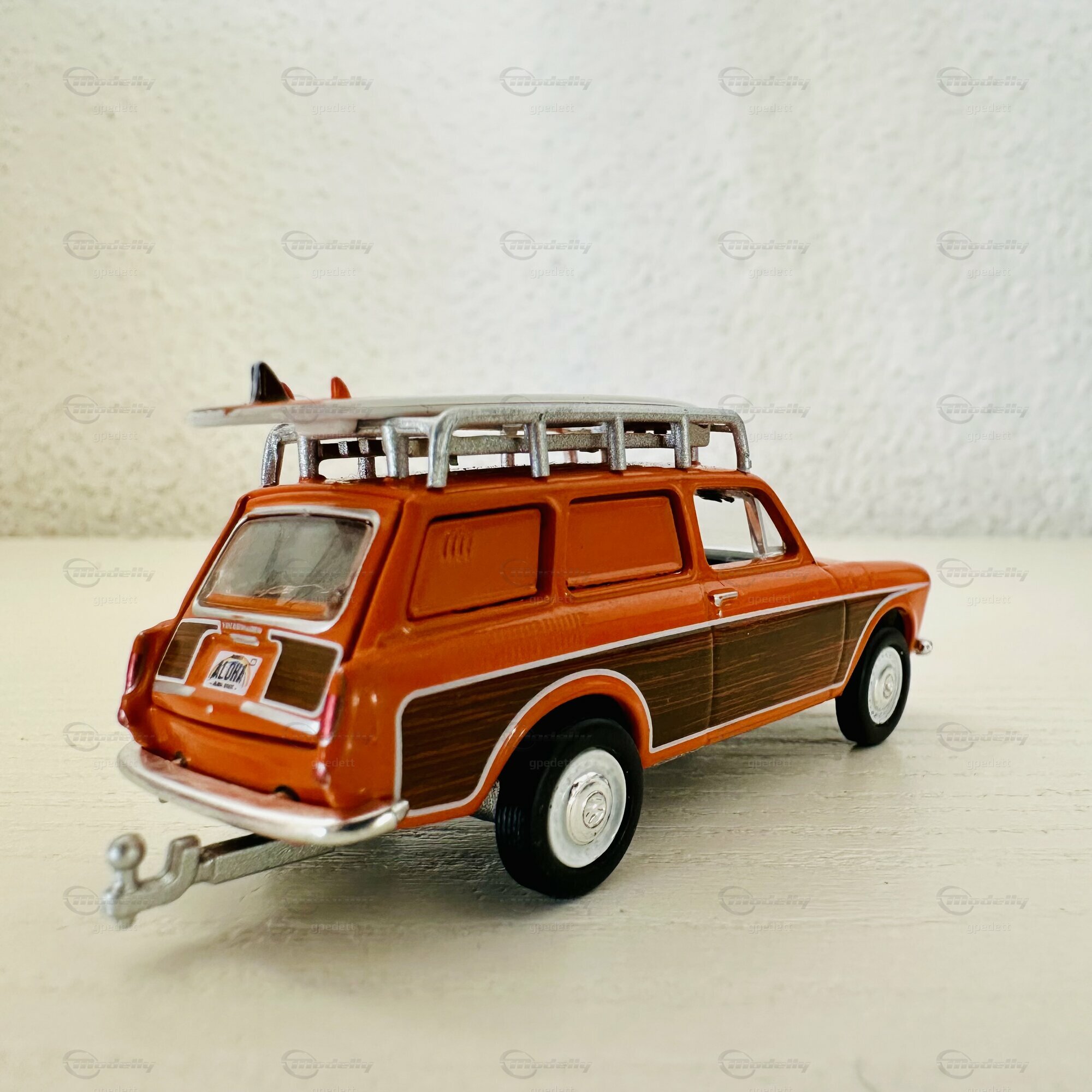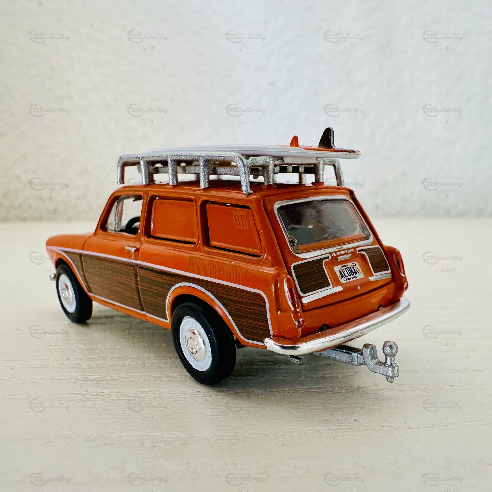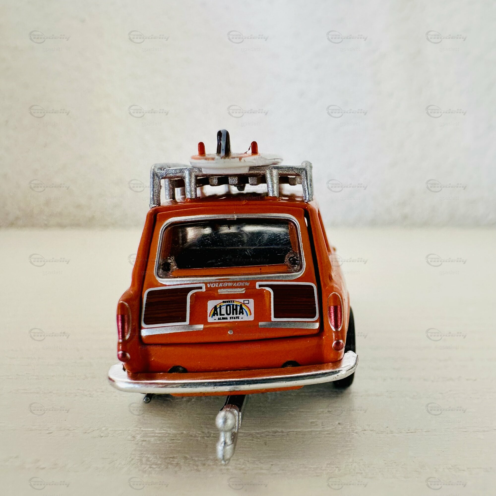 Design and Theme: The 1963 Volkswagen Type 3 "Woody" is presented with faux wood paneling on its sides, emulating the classic 'woody' station wagons that were popular in the mid-20th century, especially in beach and surf communities. The addition of a surfboard mounted on the roof racks further enhances its appeal, evoking images of sunny days at the beach and the surf culture of the 1960s.