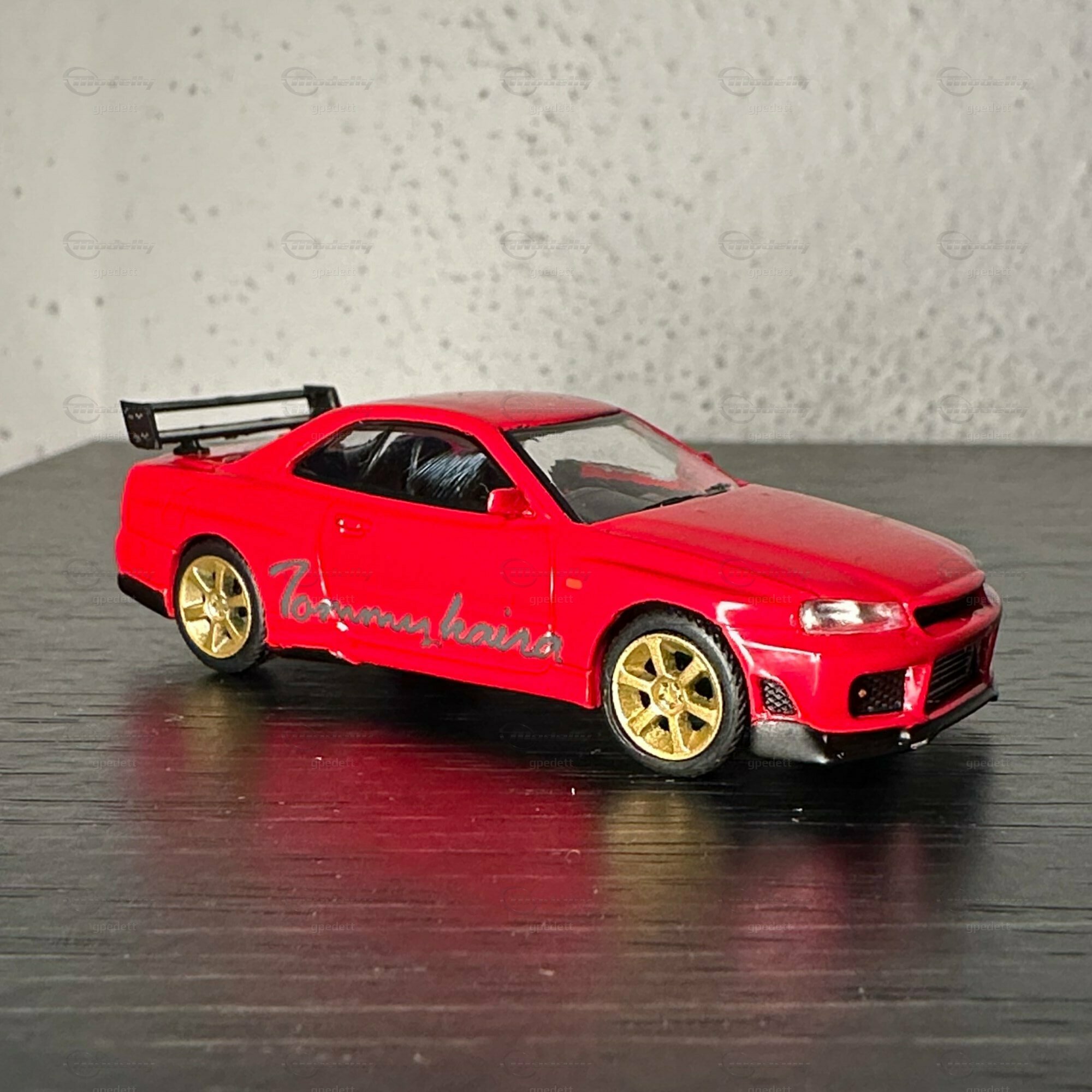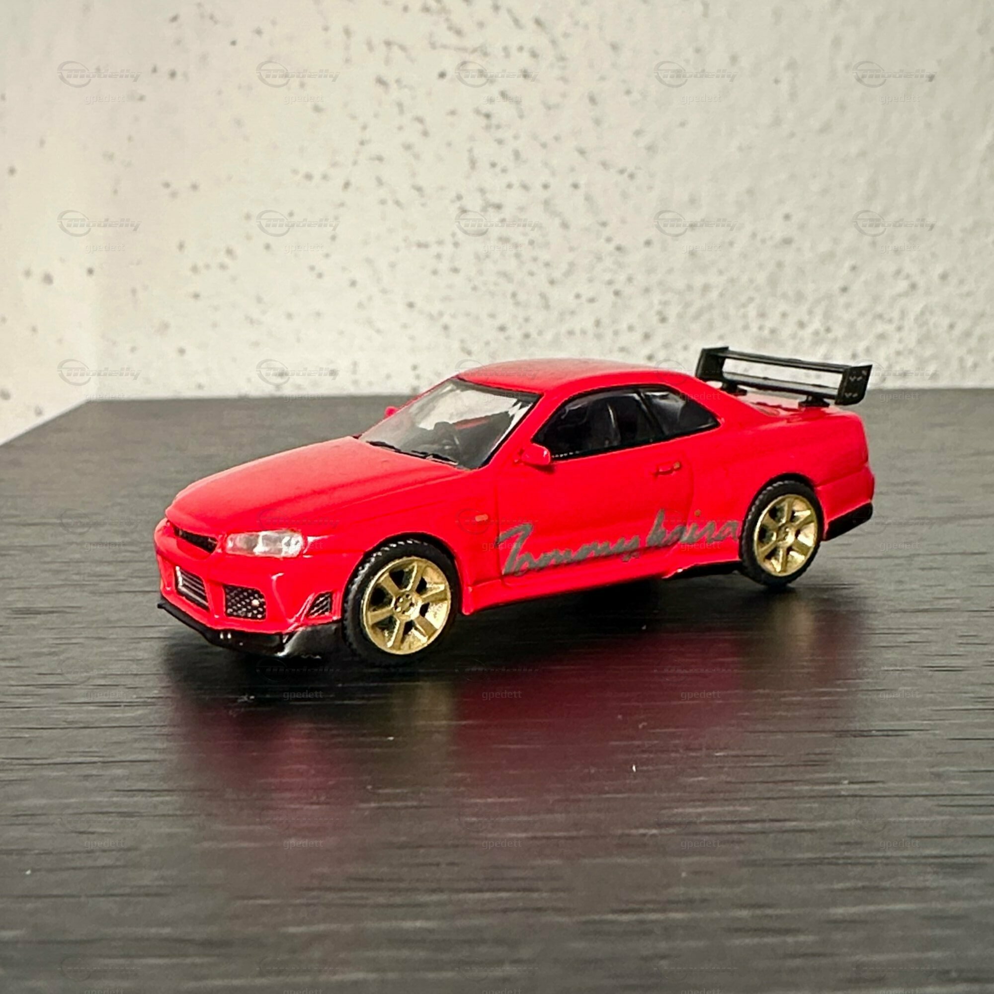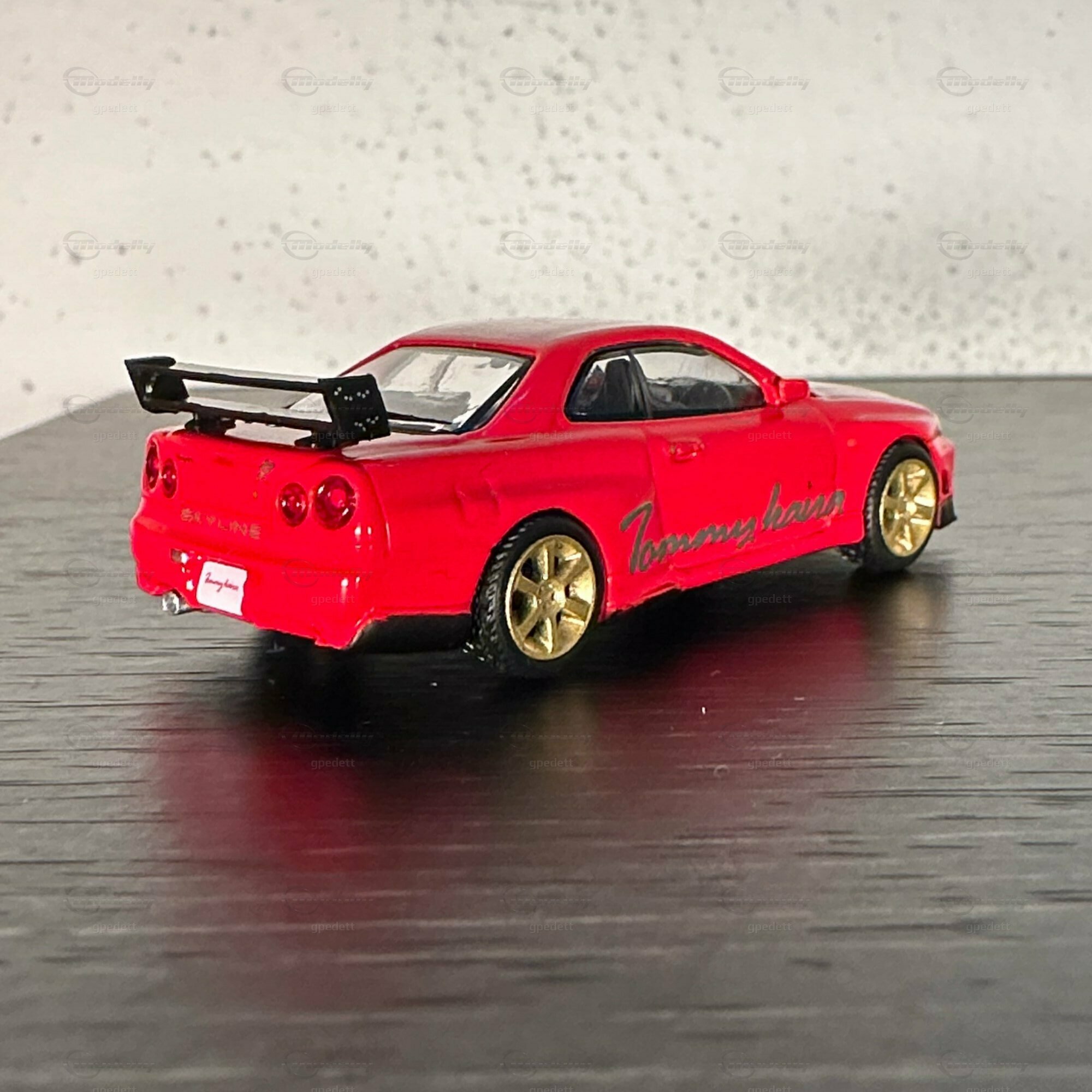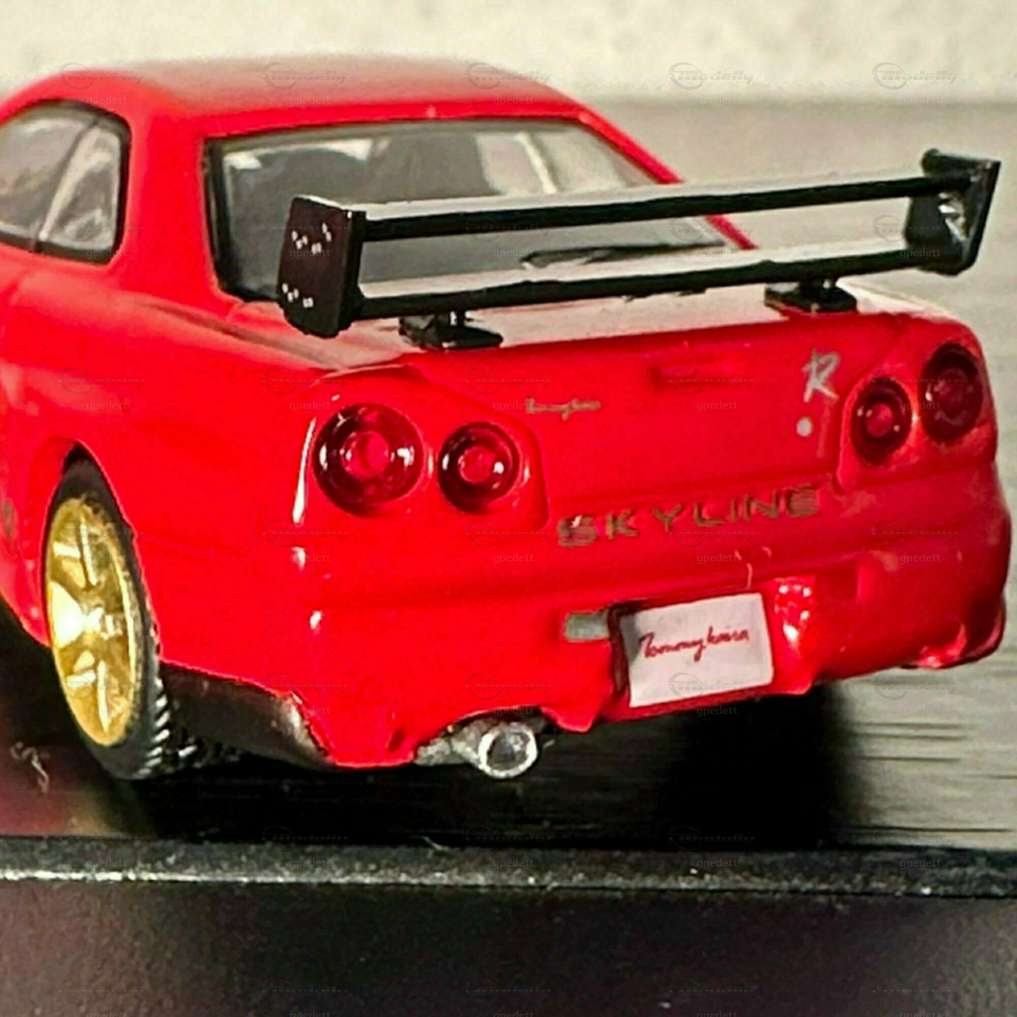"Check out this miniature masterpiece 🏎️ - the iconic Nissan Skyline GT-R (R34) in full glory! Renowned for its starring role in 'Fast and Furious' 🎬, this Japanese automotive legend packs a punch with its ATTESA E-TS all-wheel drive and the twin-turbo RB26DETT inline-6 engine 🌪️. Featuring golden wheels, a massive rear wing, and a fiery red paint job with 'Tommy kaira' scripting, a nod to the famed Japanese tuner that amps up Nissan's like no other 🇯🇵🔧. Dream big, drive small! #NissanGTR #MiniaturePerfection #Tommykaira #JDM"