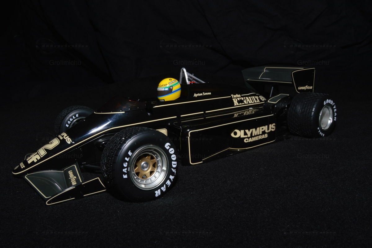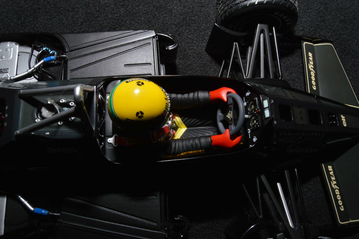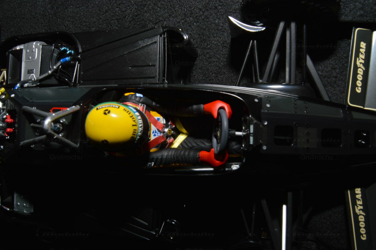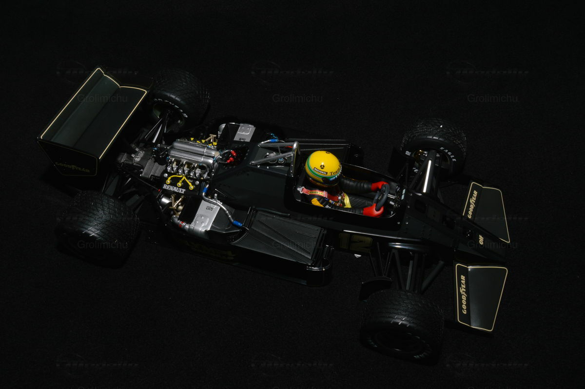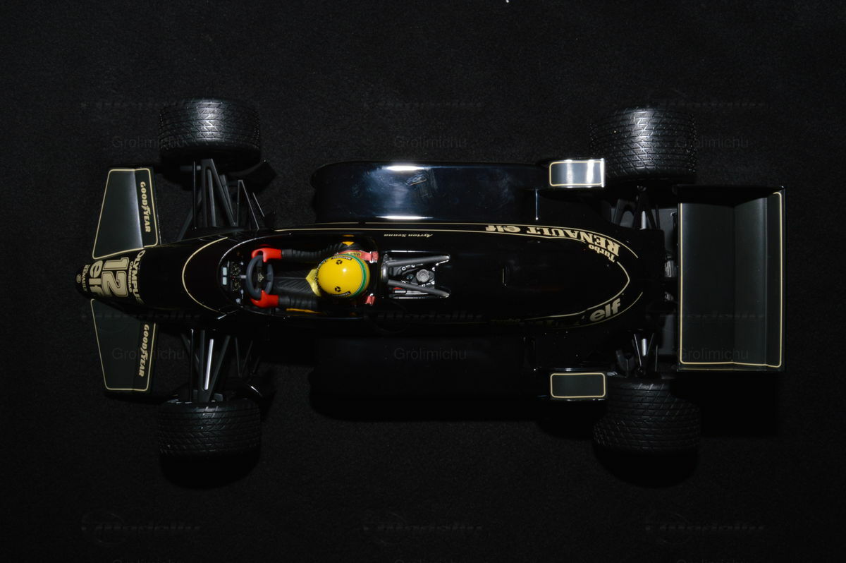 The scale model car shown here in 1/12 scale is part of the Minichamps Ayrton Senna Collection and is crafted from high-quality diecast material. This model showcases the Lotus 97T in impressive detail. The miniature included in the collection of Modelly member "Grolimichu" offers a precise reproduction of real vehicle details, such as the highlighted turbo lines, distinctive spoilers, and a detailed replication of the cockpit, including Ayrton Senna's helmet. This model also displays intricate drivetrain and suspension components, reflecting the technical sophistication of the original.
