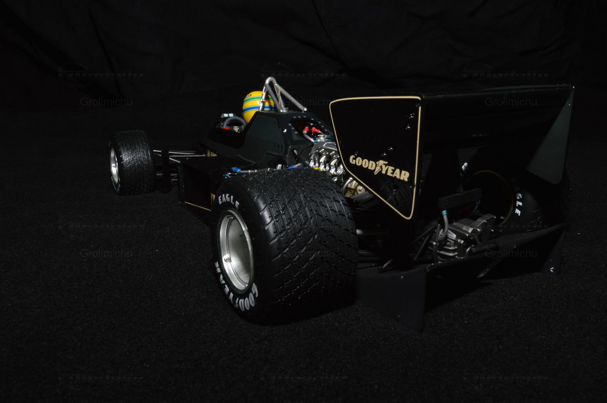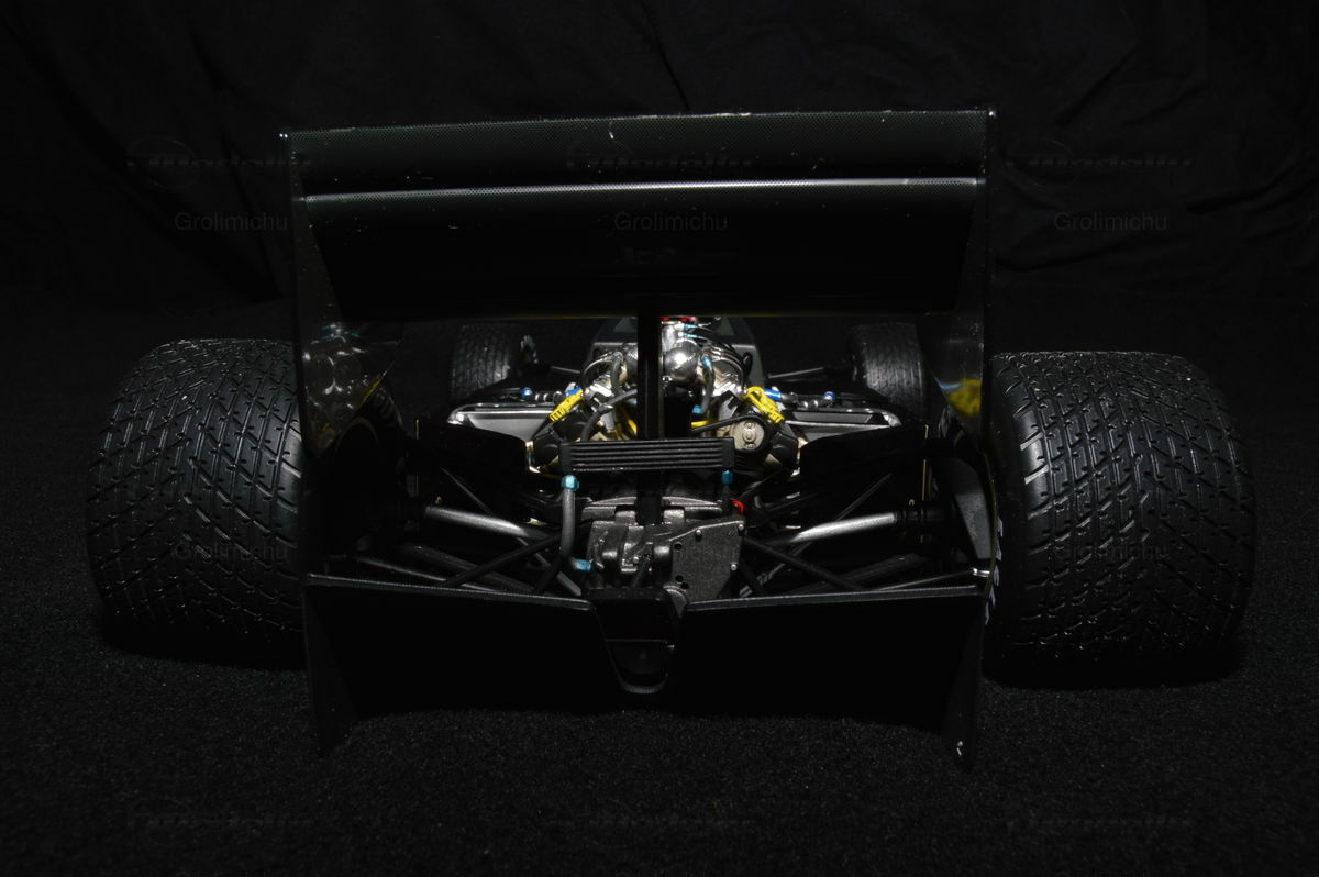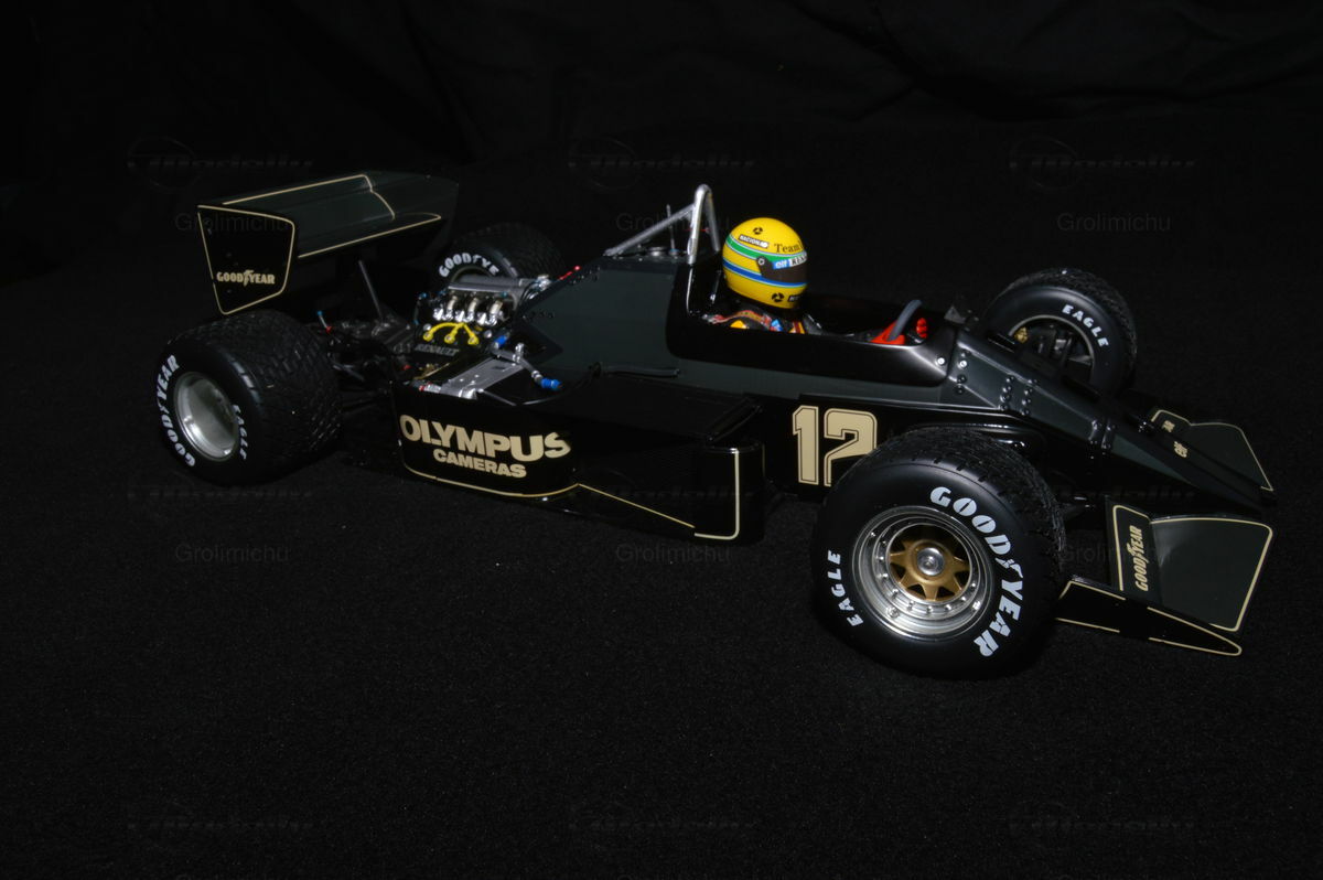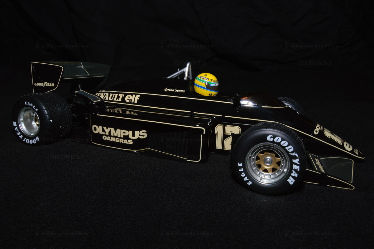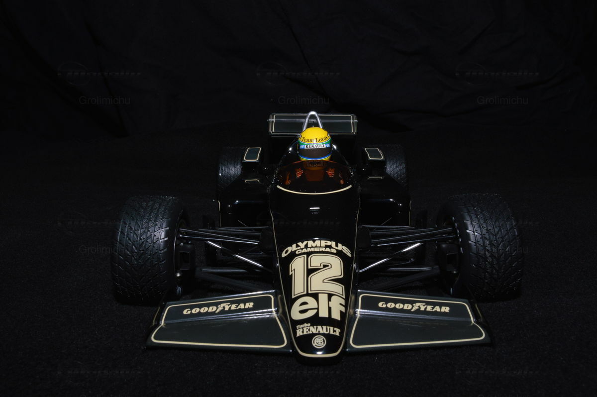 The scale model car shown here in 1/12 scale is part of the Minichamps Ayrton Senna Collection and is crafted from high-quality diecast material. This model showcases the Lotus 97T in impressive detail. The miniature included in the collection of Modelly member "Grolimichu" offers a precise reproduction of real vehicle details, such as the highlighted turbo lines, distinctive spoilers, and a detailed replication of the cockpit, including Ayrton Senna's helmet. This model also displays intricate drivetrain and suspension components, reflecting the technical sophistication of the original.