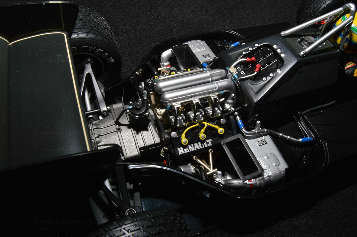 The meticulous attention to detail of this scale model from the Minichamps Ayrton Senna Collection is underscored by the realistic replication of the engine, power unit, and fine sponsor logos such as John Player Special, Goodyear, and Renault. The 1/12 scale allows for even small details like aerodynamic elements and bodywork structure to be clearly visible. This makes the model particularly valuable for collectors and enthusiasts of Formula 1 history, serving as an excellent centerpiece in any collection. The craftsmanship and attention to detail that went into every phase of its production are clearly evident in this miniature.