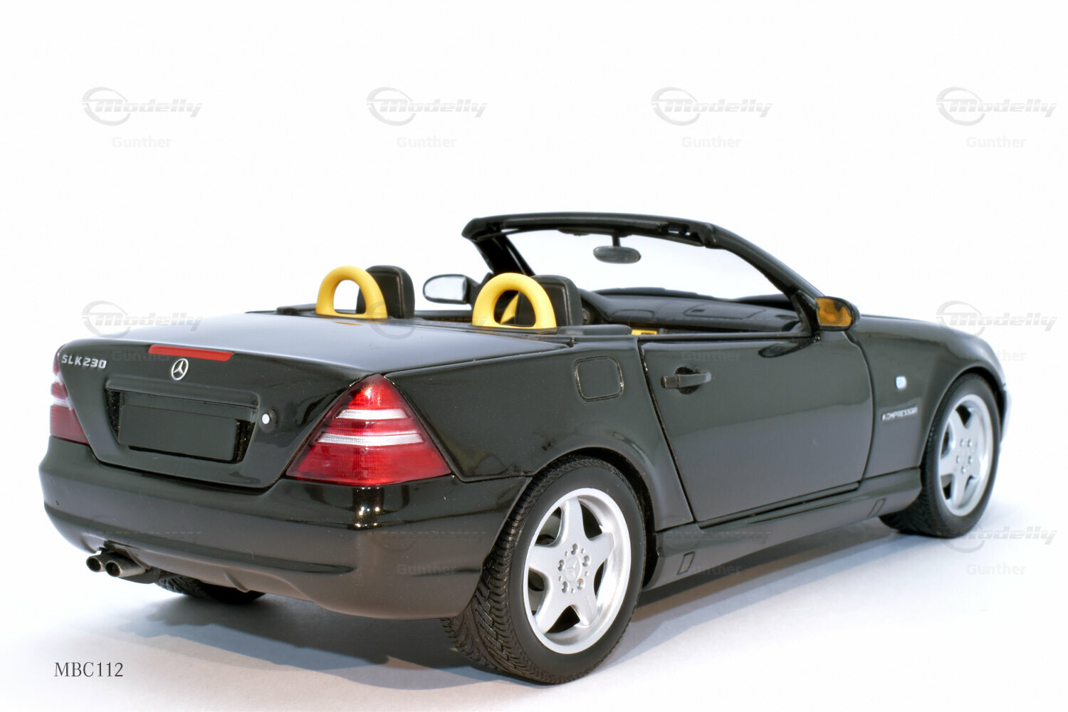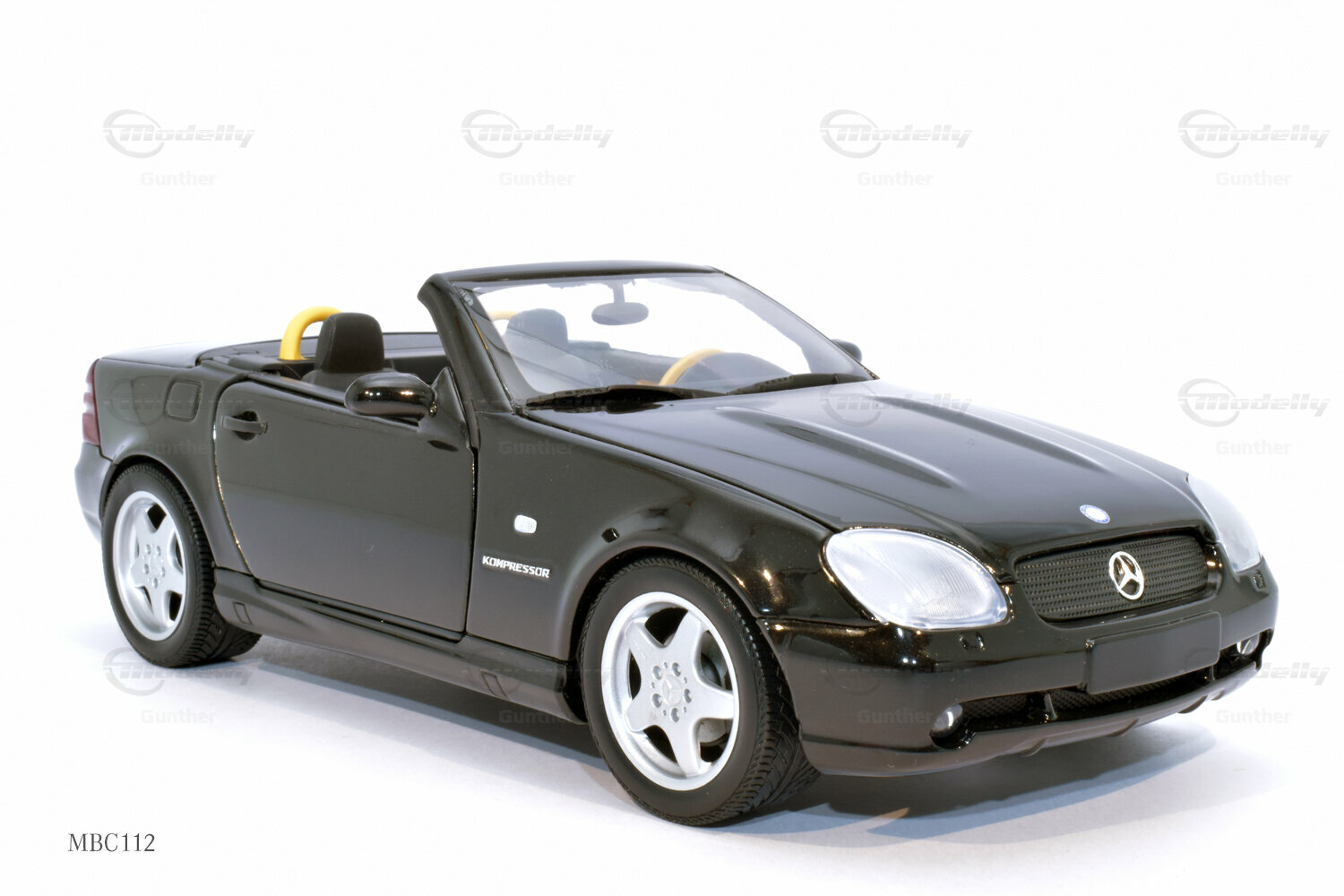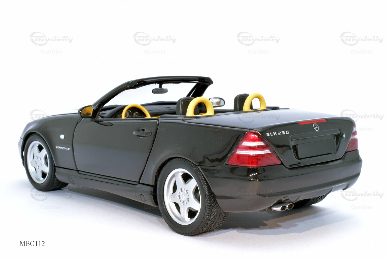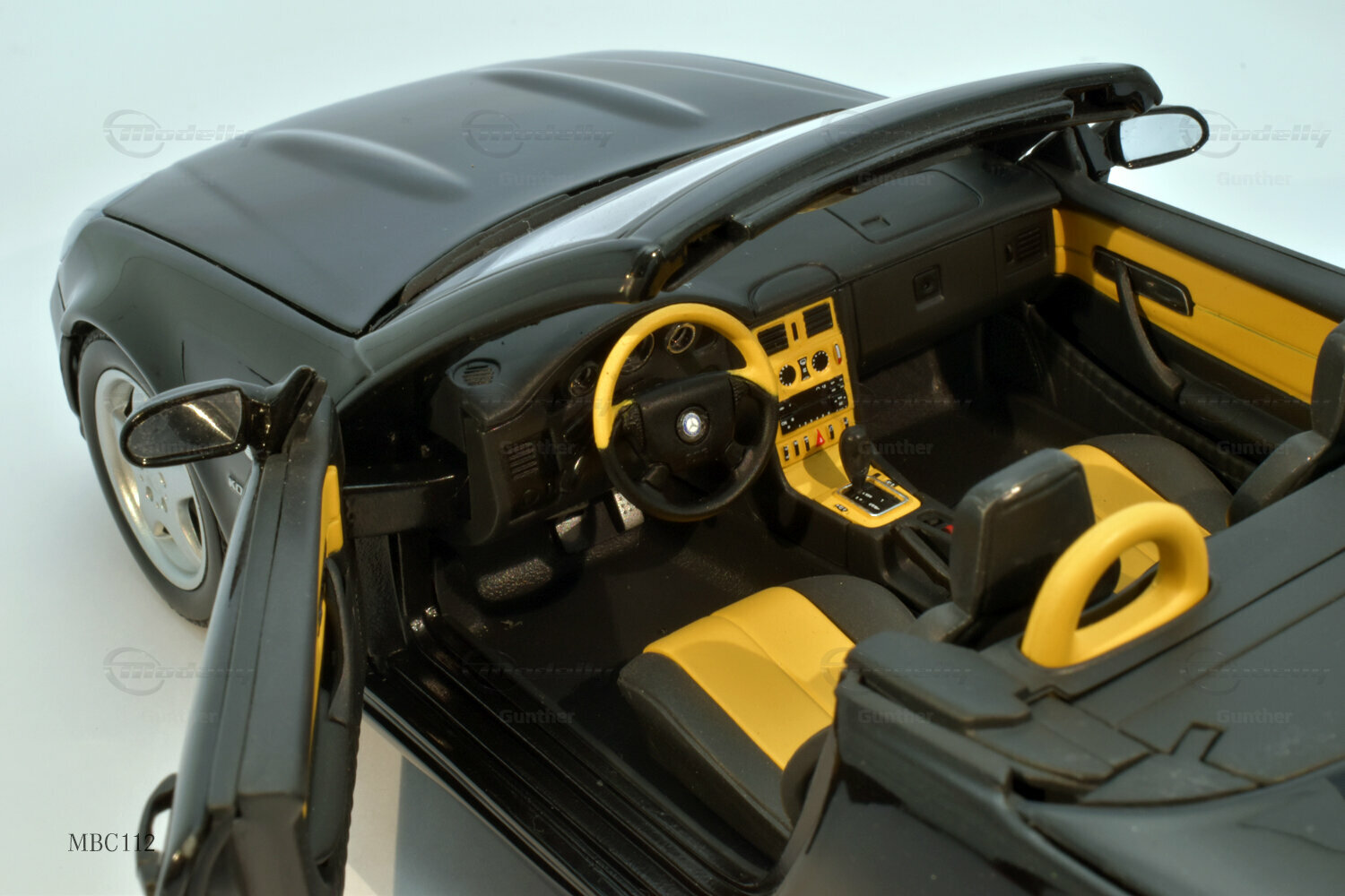 The 1/18 scale model of the Mercedes-Benz SLK 230 (R 170), produced by UT Models, impresses with many details that are clearly visible in the photos. The paintwork of the model closely resembles the classic black of the original, which, together with the silver rims, creates a fascinating contrast. Special attention deserves the rims, which exhibit typical features of Mercedes-Benz rims from that era. The supercharger badge on the side of the model is also faithfully reproduced, giving the model a realistic appearance. The interior of the model mirrors the sporty accents of the original, including the yellow and black color combination of the seats and dashboard. This showcases the attention to detail and precision with which UT Models crafted the miniature model.