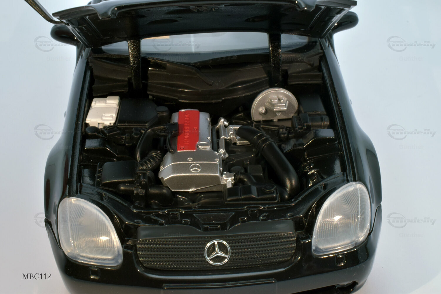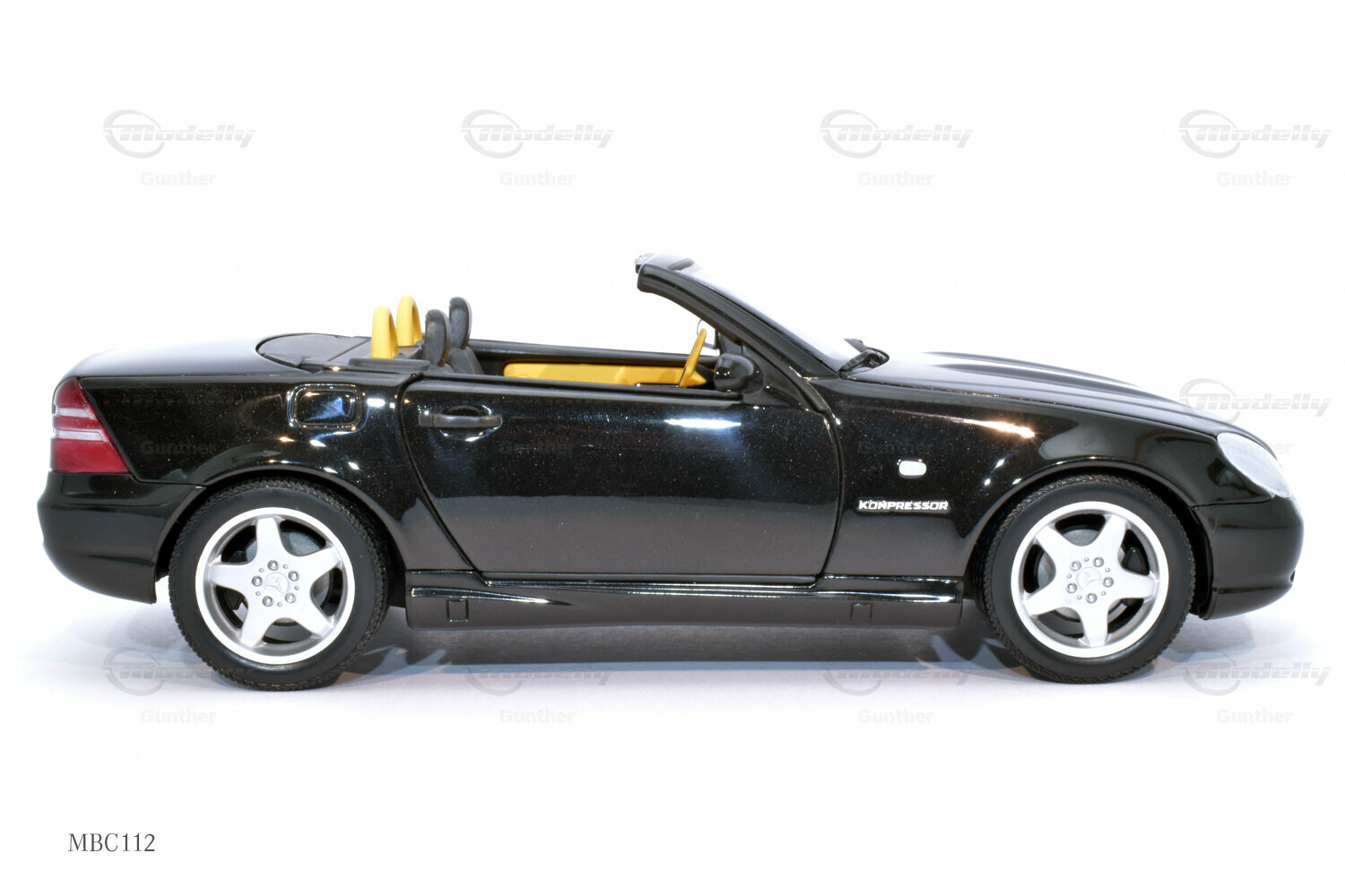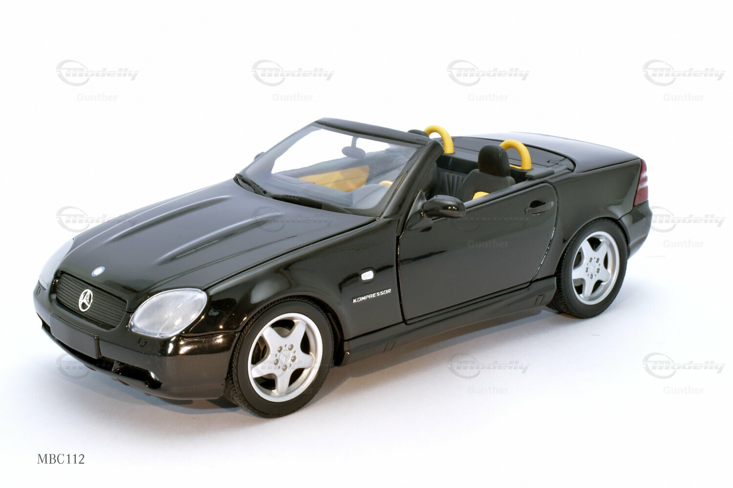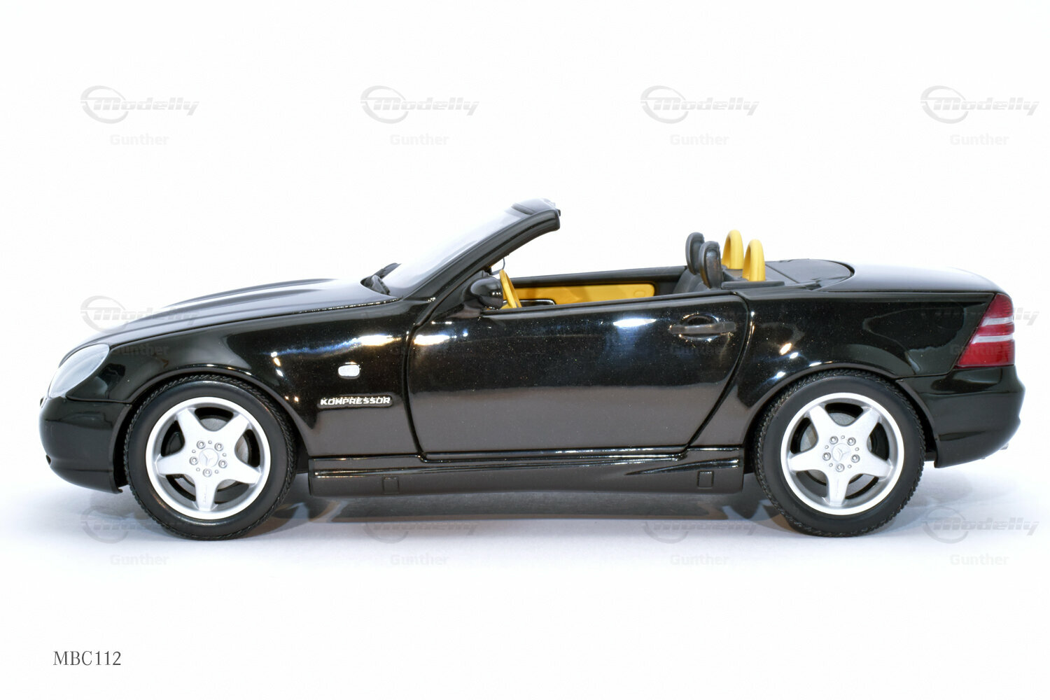 The 1/18 scale model of the Mercedes-Benz SLK 230 (R 170), produced by UT Models, impresses with many details that are clearly visible in the photos. The paintwork of the model closely resembles the classic black of the original, which, together with the silver rims, creates a fascinating contrast. Special attention deserves the rims, which exhibit typical features of Mercedes-Benz rims from that era. The supercharger badge on the side of the model is also faithfully reproduced, giving the model a realistic appearance. The interior of the model mirrors the sporty accents of the original, including the yellow and black color combination of the seats and dashboard. This showcases the attention to detail and precision with which UT Models crafted the miniature model.
