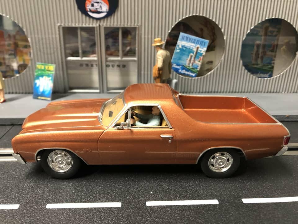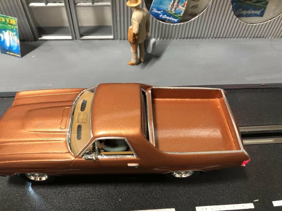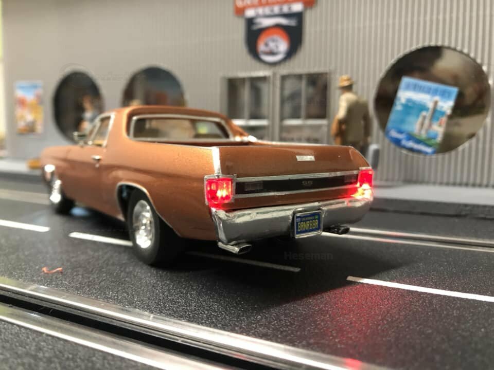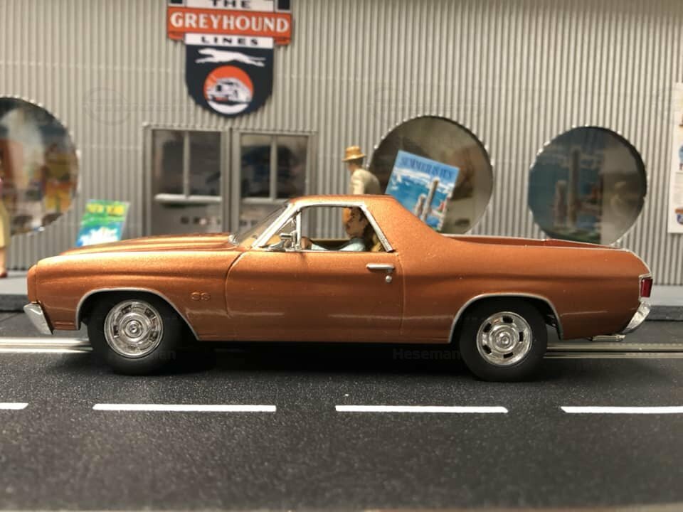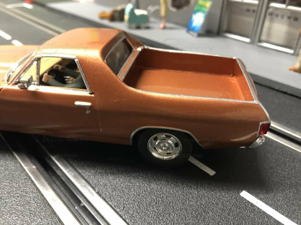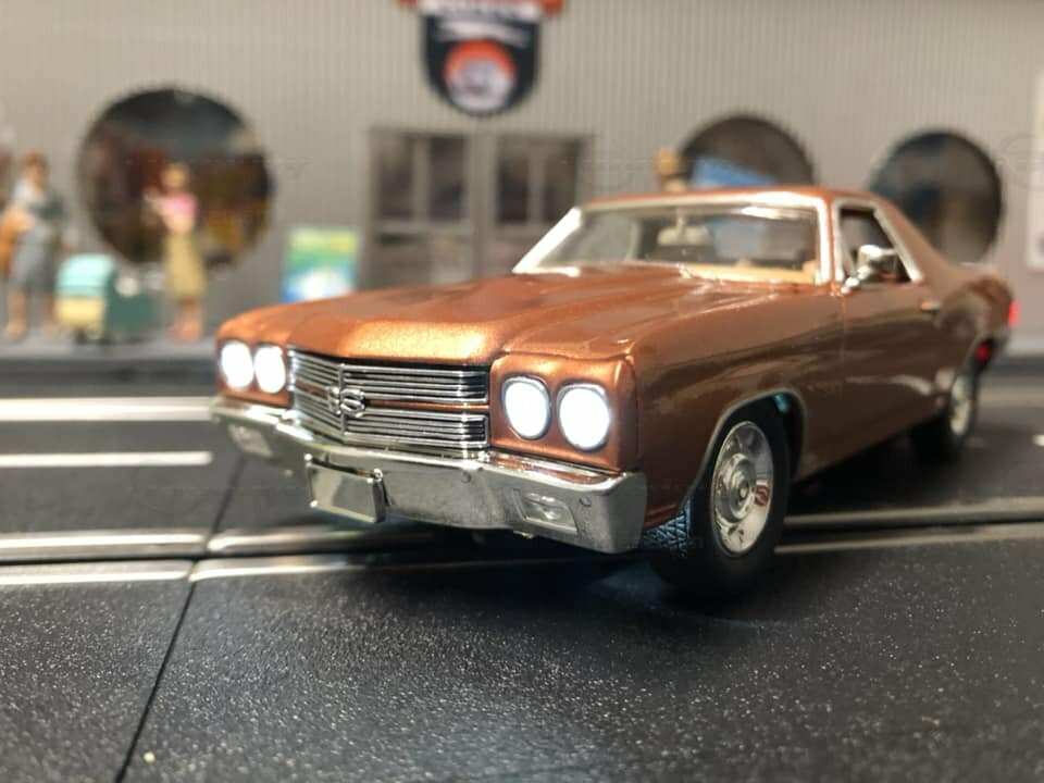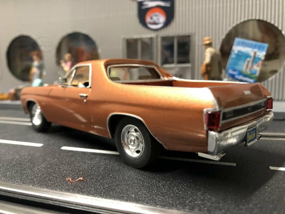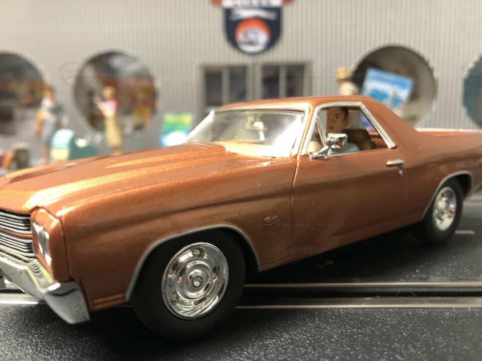 The model presented here is a modified 1/32 scale replica of the Chevrolet El Camino 396 by Carrera. Originally produced by Carrera in a scale of 1/32, this miniature is based on plastic. As a modified miniature, this model differs from Carrera's standard production. It is an electric slot car designed to operate on slot racing tracks. The detailing on this replica is impressive. Noteworthy are the fine details on the body, such as the realistically designed headlights and the precise grille with the Chevrolet emblem. The vehicle is painted in a metallic bronze tone, giving it an authentic and classic look.