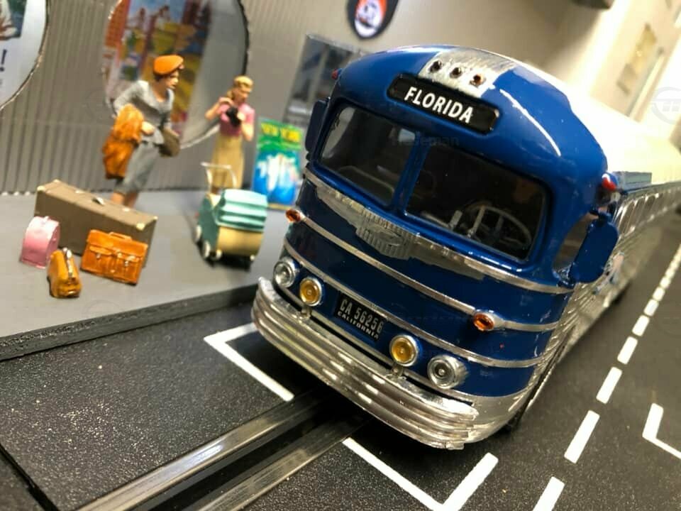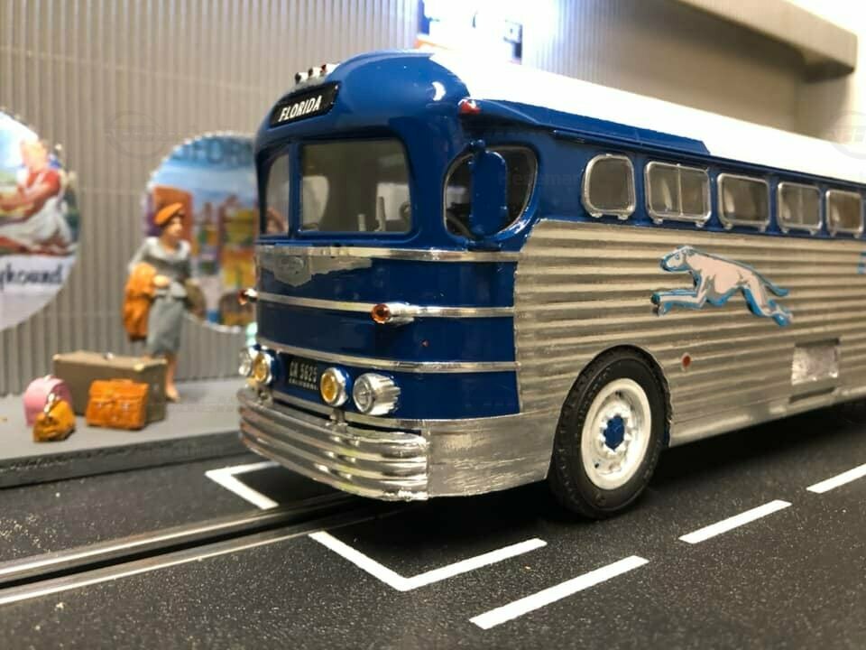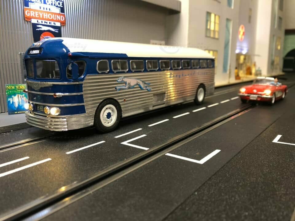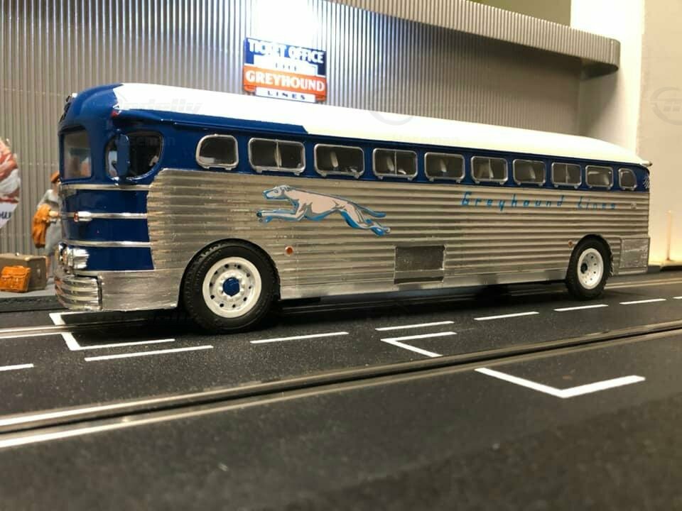 The appearance of the miniature model is striking with its detailed design. The silver main color with blue accents and the well-placed Greyhound logo give the model the iconic look that matches the original buses. Additionally, the signage and windows are clearly visible in the pictures, giving the model an authentic touch. As a slot car model, it is not only a display piece but can also actively be raced on slot car tracks, adding extra play value to the model.